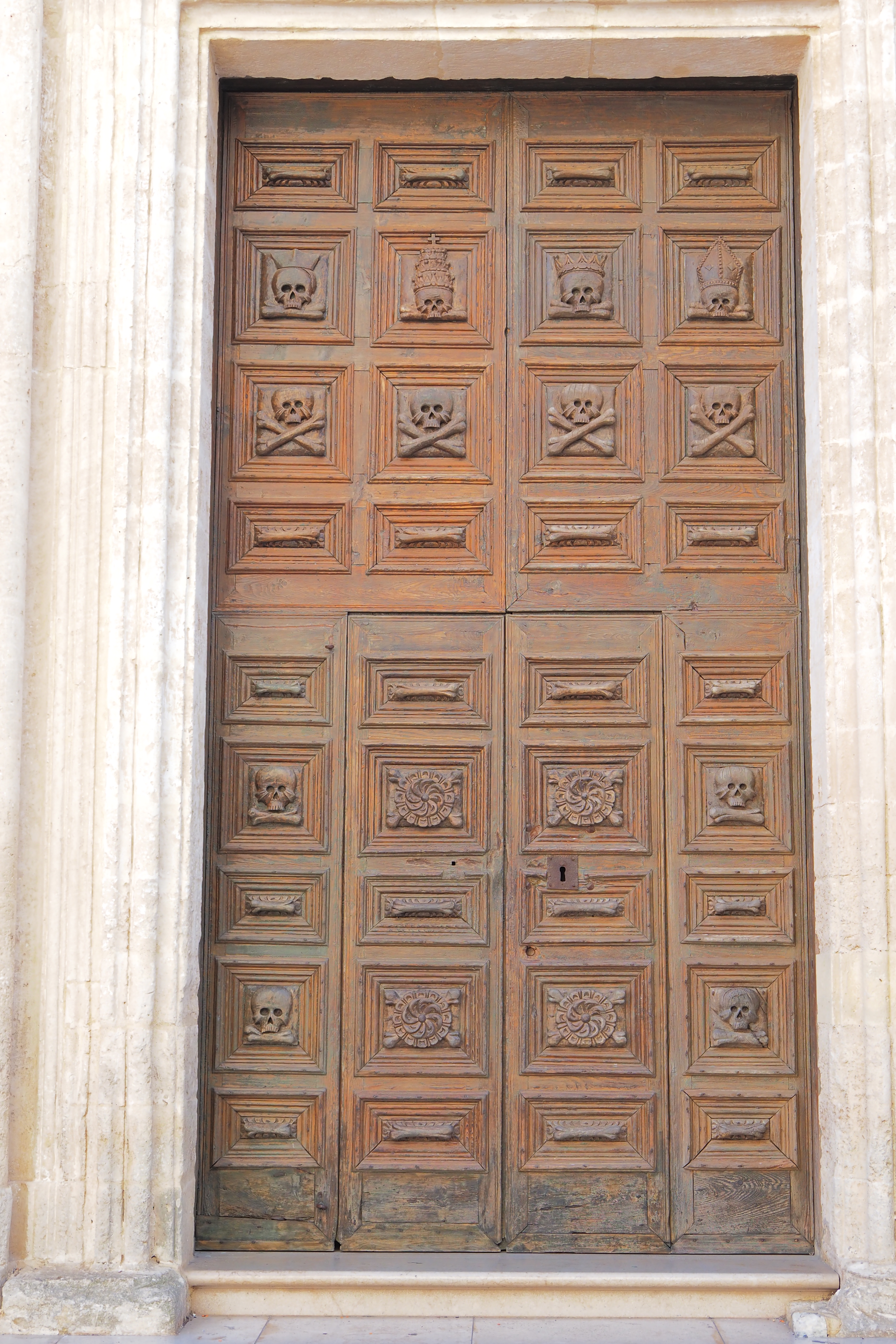 木製の扉には、聖職者や貴族の帽子をかぶった髑髏と、平民の髑髏が一緒に掘られていて 死の前での身分の無意味さをあらわしてるんだとか。