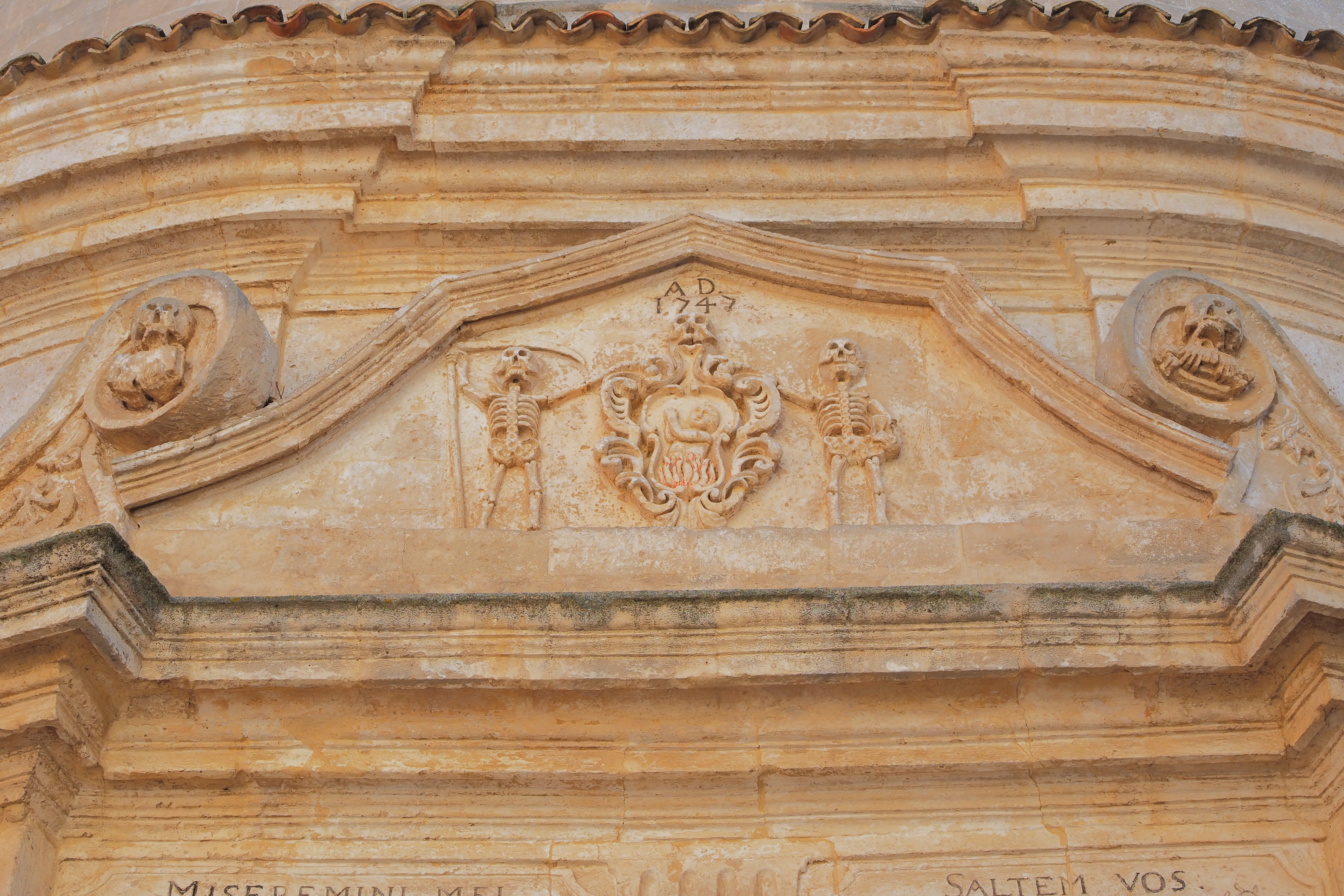 ファサード正面破風部分には、鎌をかかげる髑髏と、砂時計を携える髑髏、そして中央に炎に焼かれる人が彫られてる。