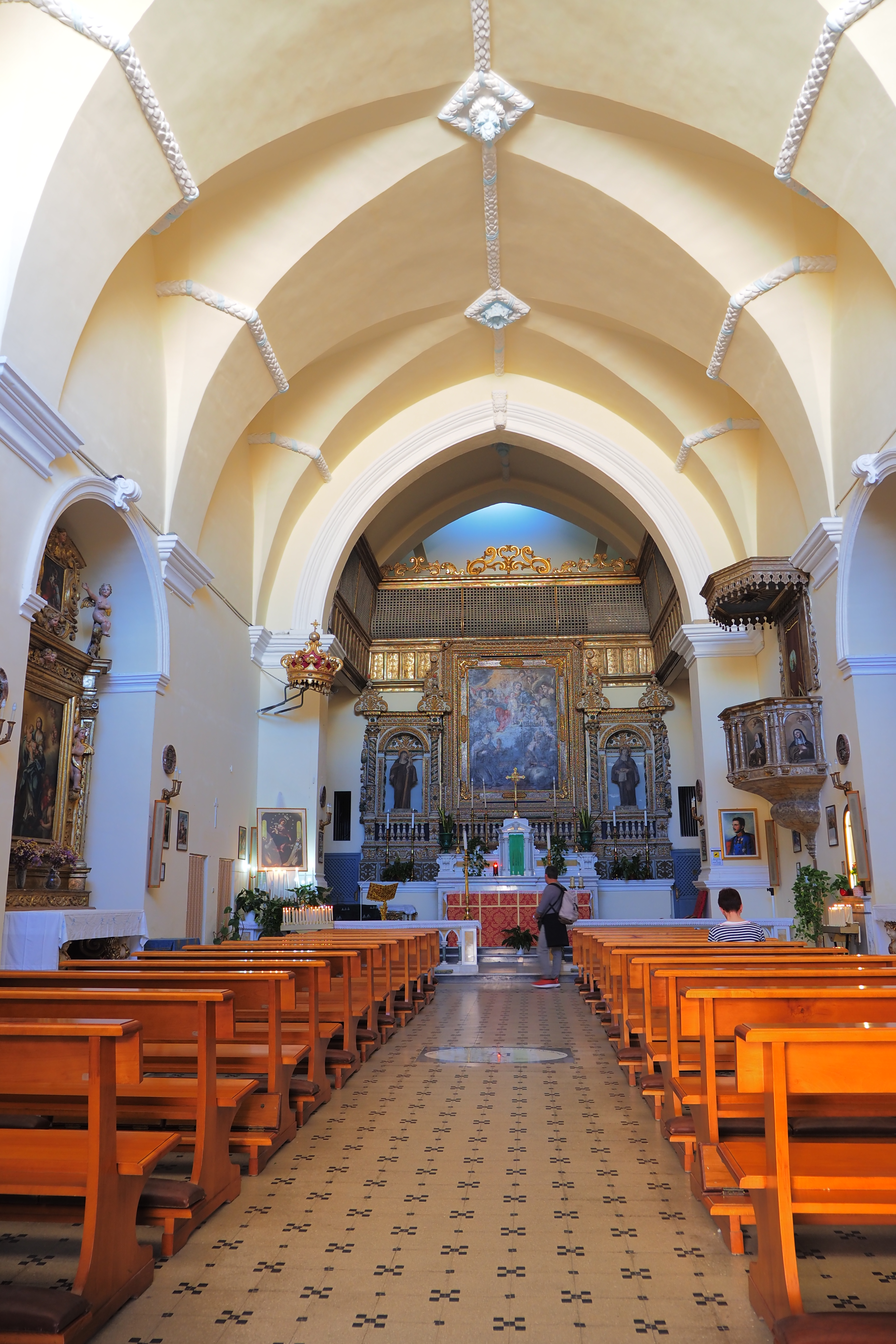 内部は単廊式で、天井画の先に尖頭アーチで区切られた十字ヴォールトの祭壇につづいている。