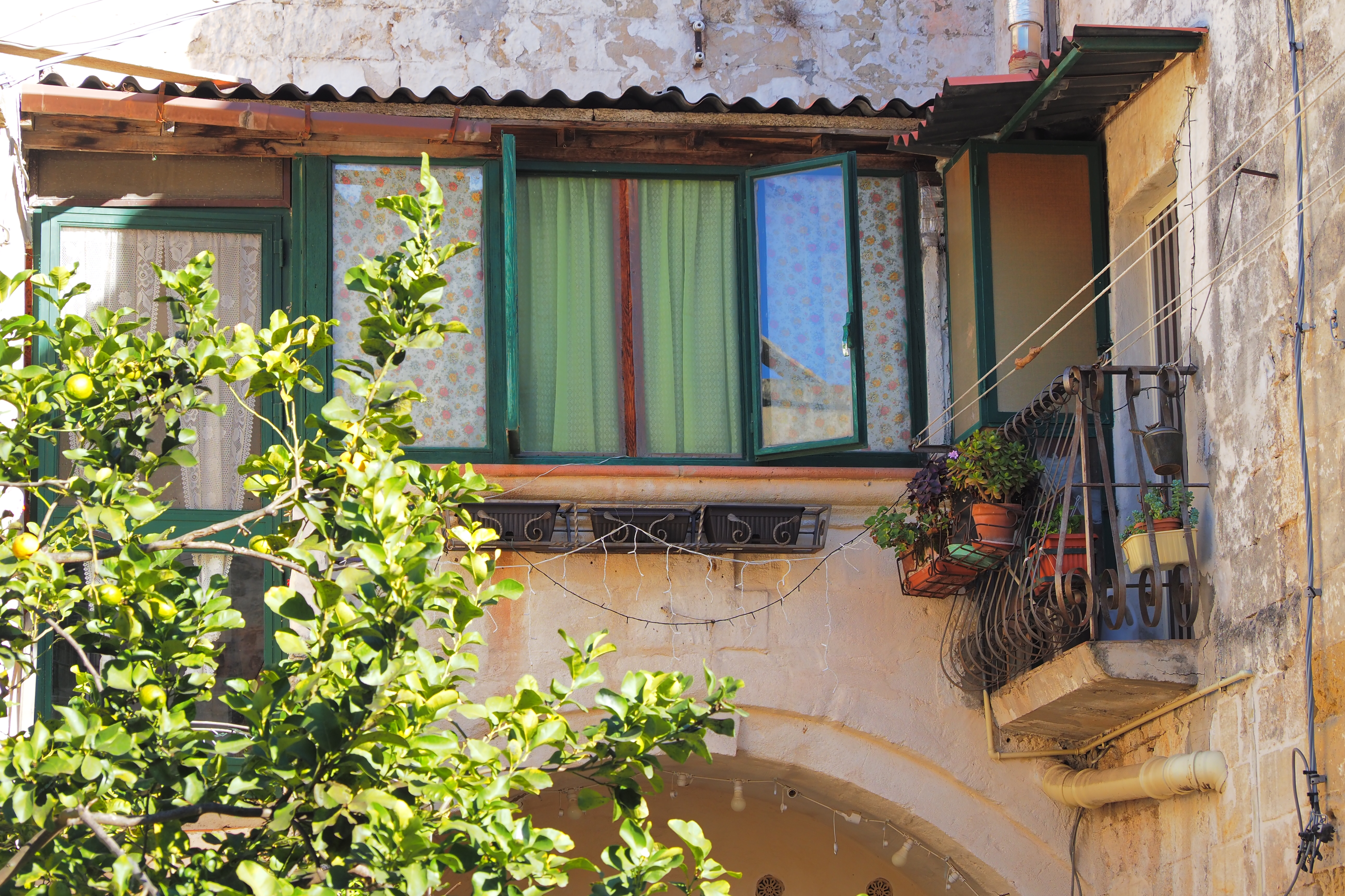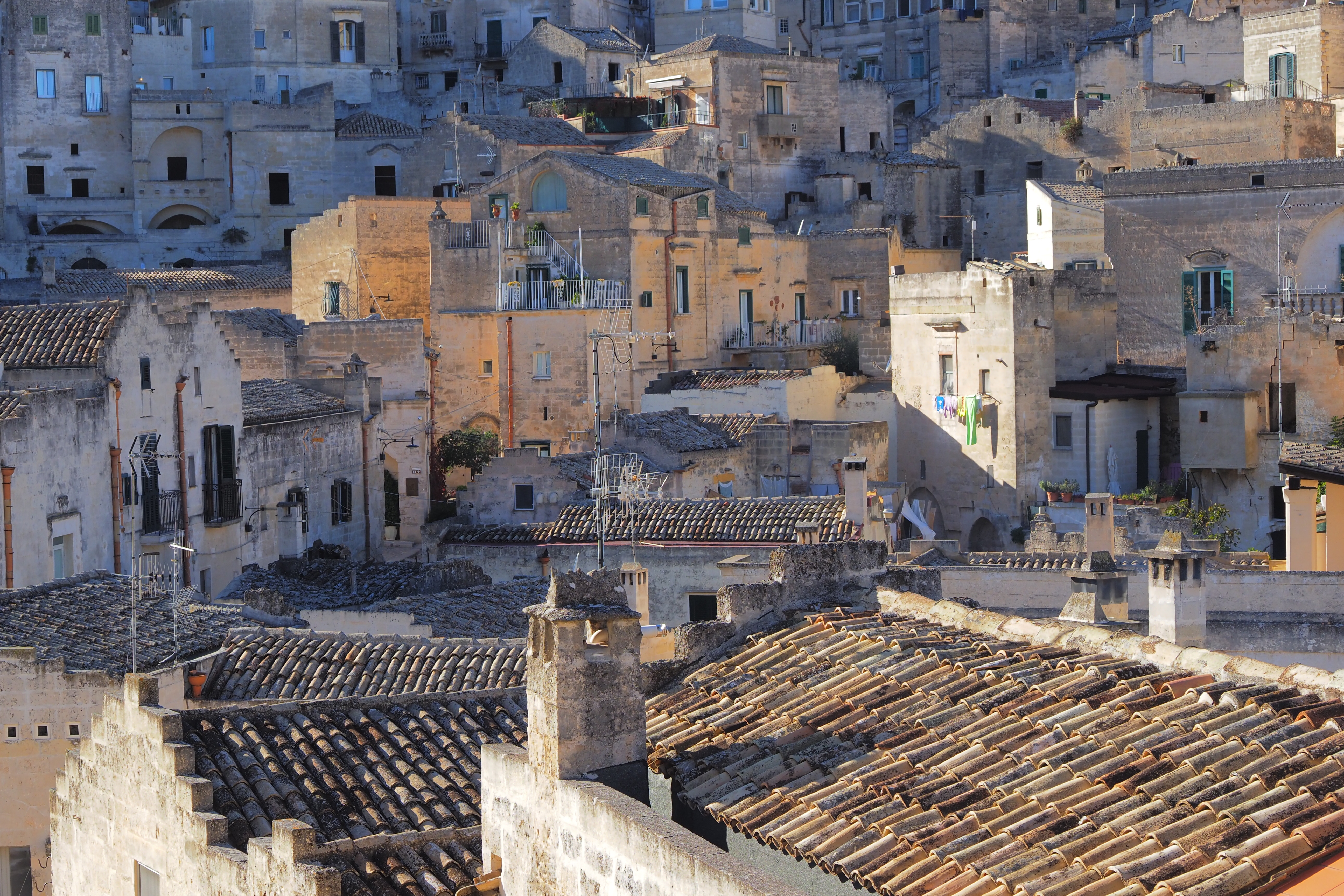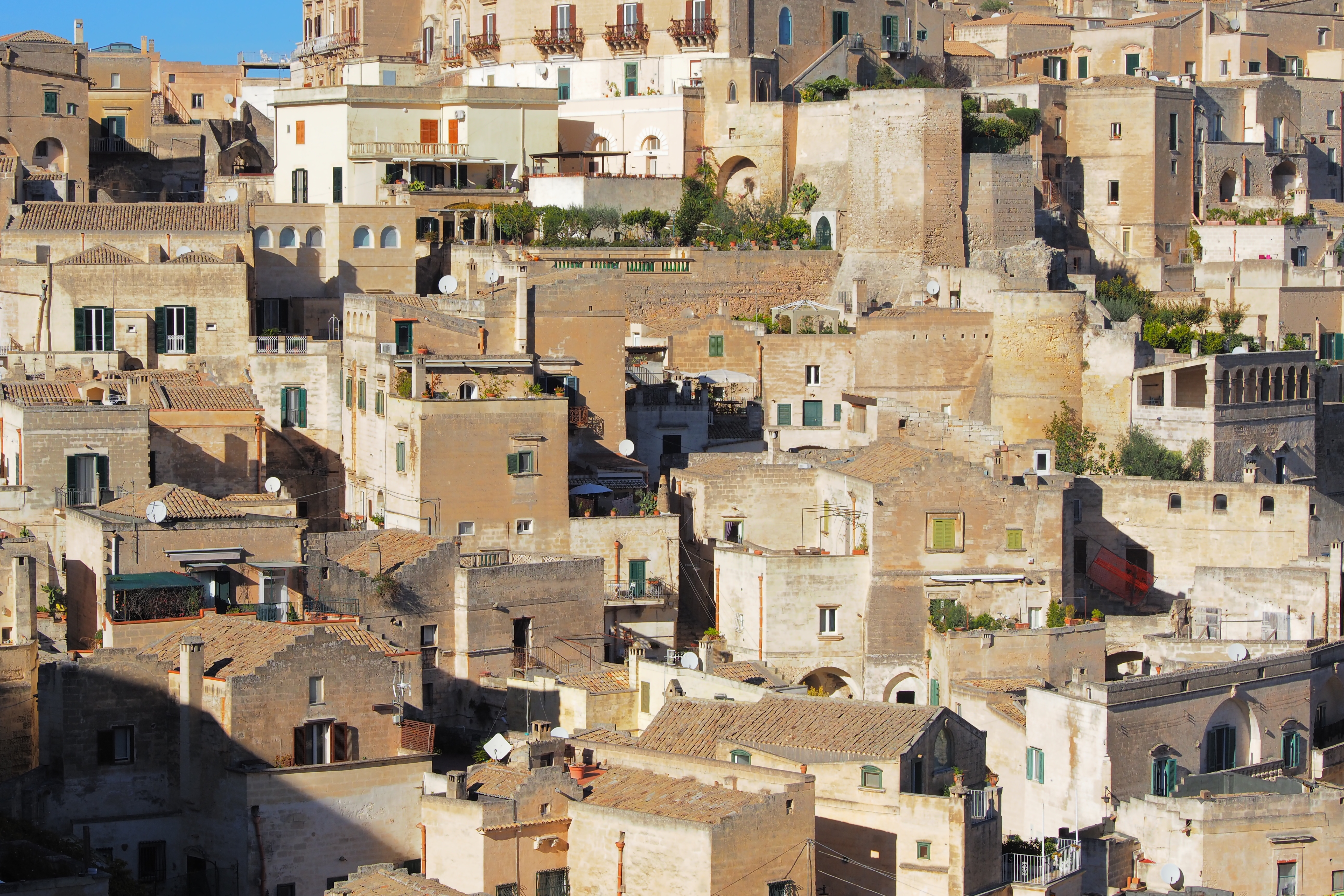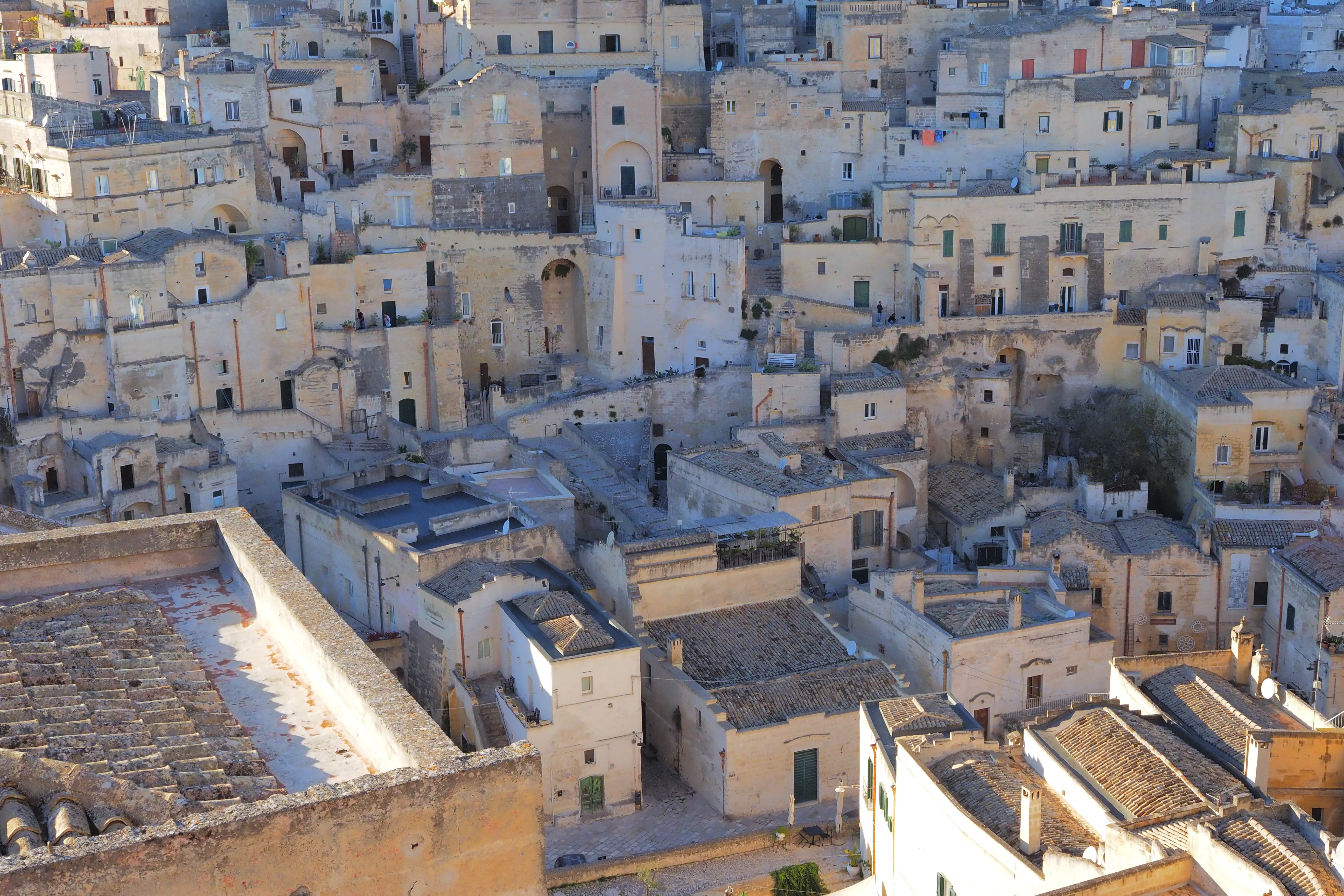 茶色い石灰岩でできた家屋がぎゅうぎゅうに密集した様は、「洞窟住居」というより中世の石造りの家がそのまま保存された街のように見える。実際、外部の家屋構造はそれとしてあって 内部では岩盤をくり抜いた洞窟構造と一体となっているらしい。