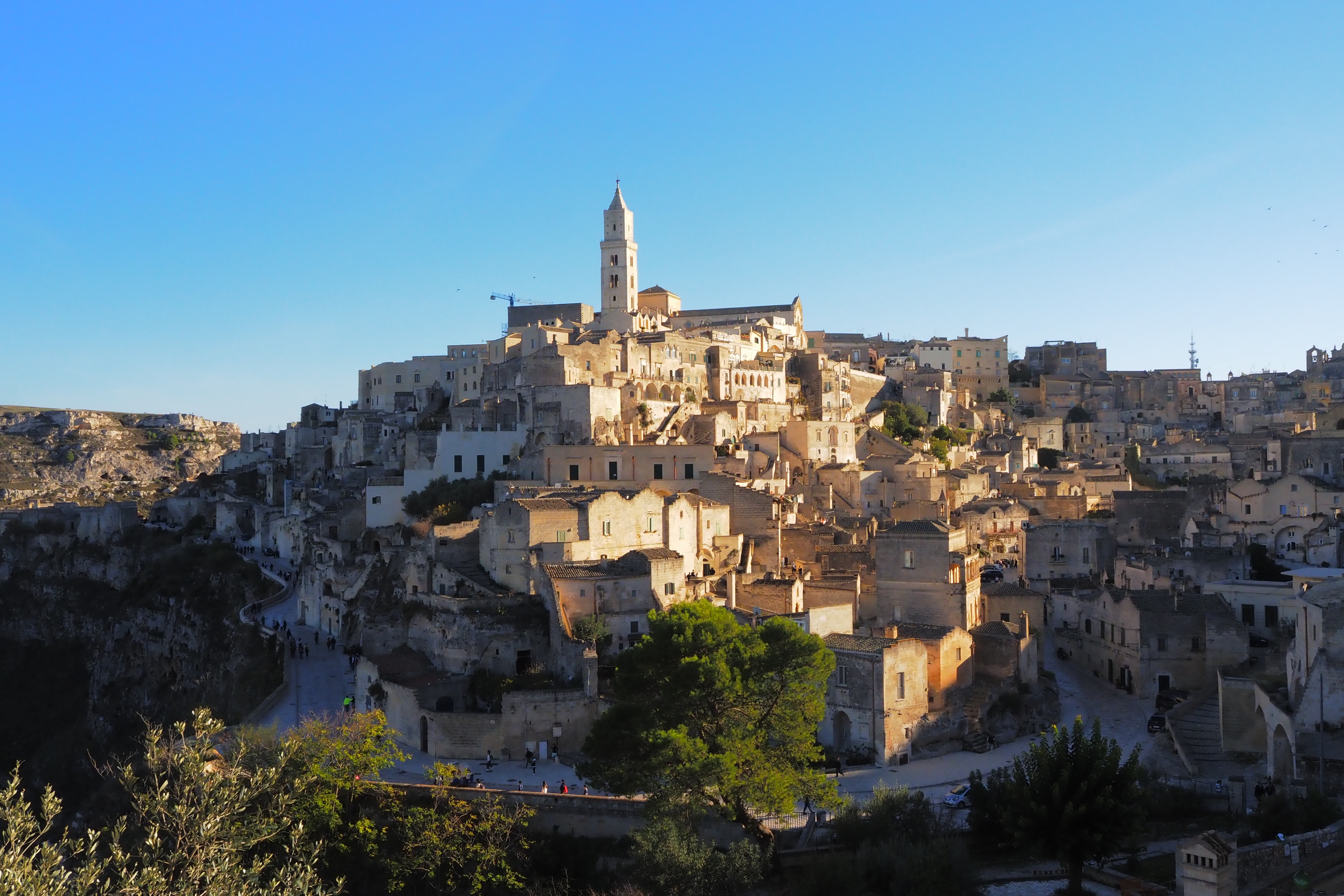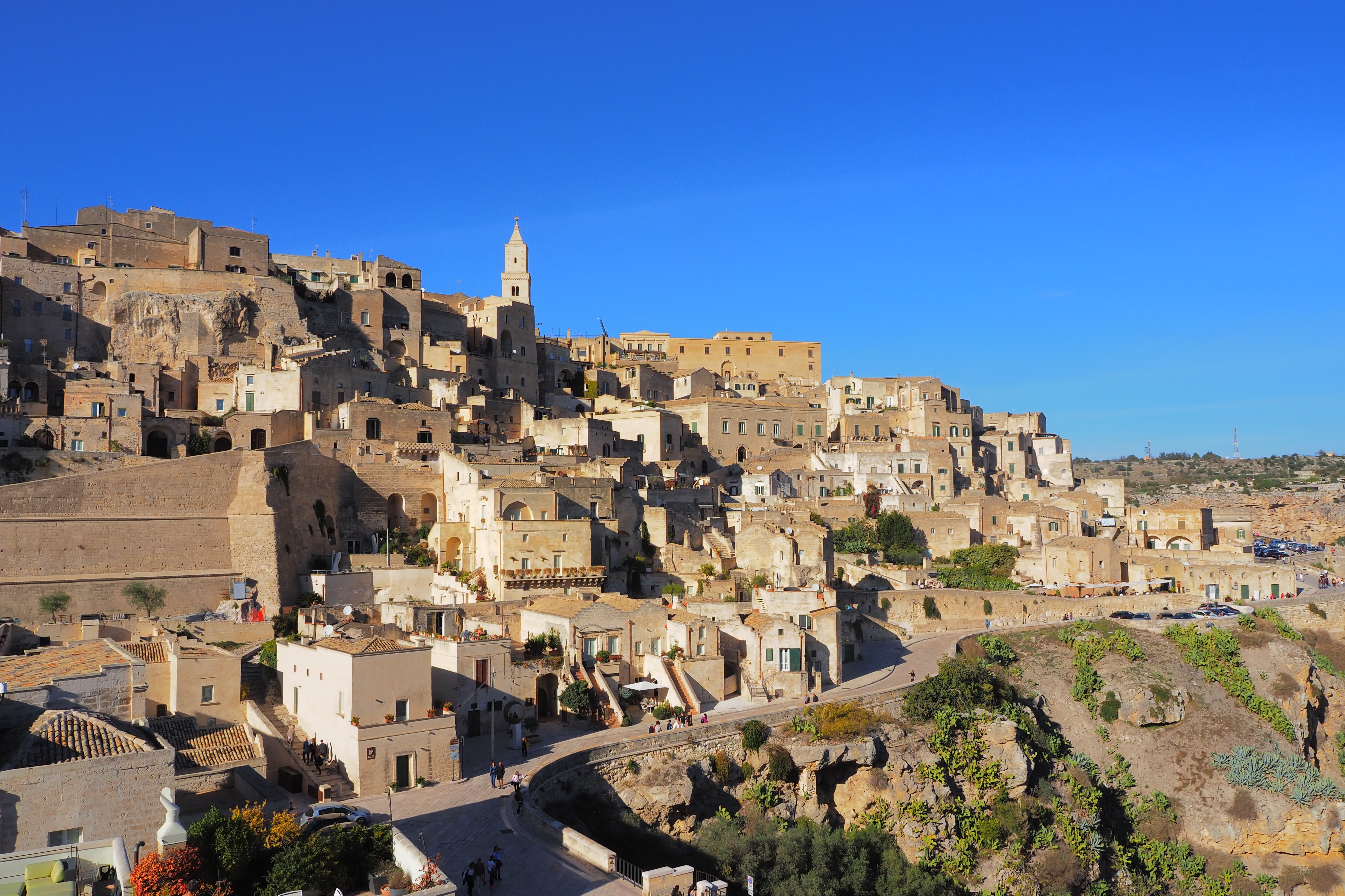 サッシ地区の北側をぐるっと周回する道路と、まるでレゴのように積み重なる石灰岩家屋、そして丘の頂上のカテドラルがなんて絵になるんでしょう。