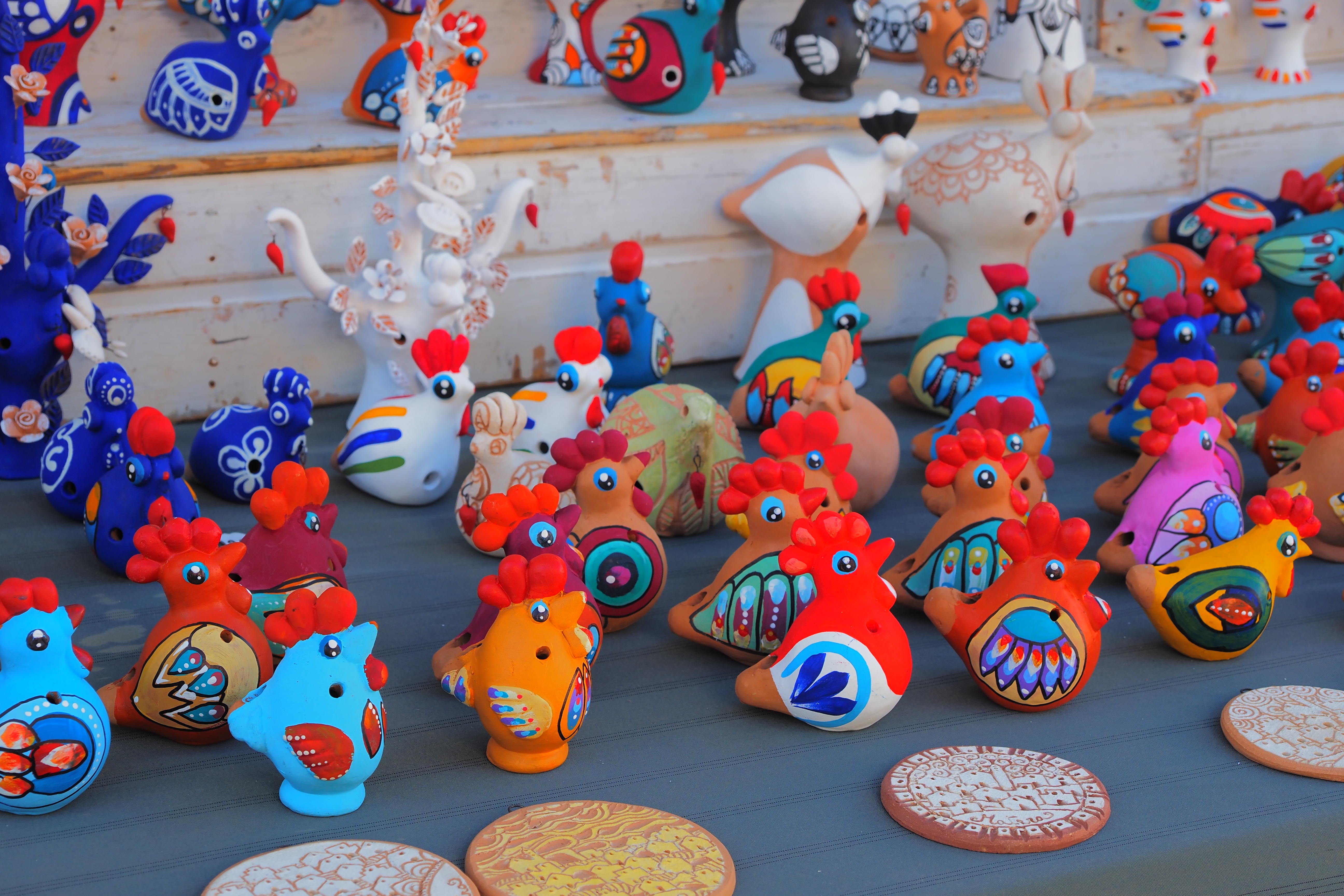 鮮やかなニワトリの置物と、イタリアン・トゥクトゥク。