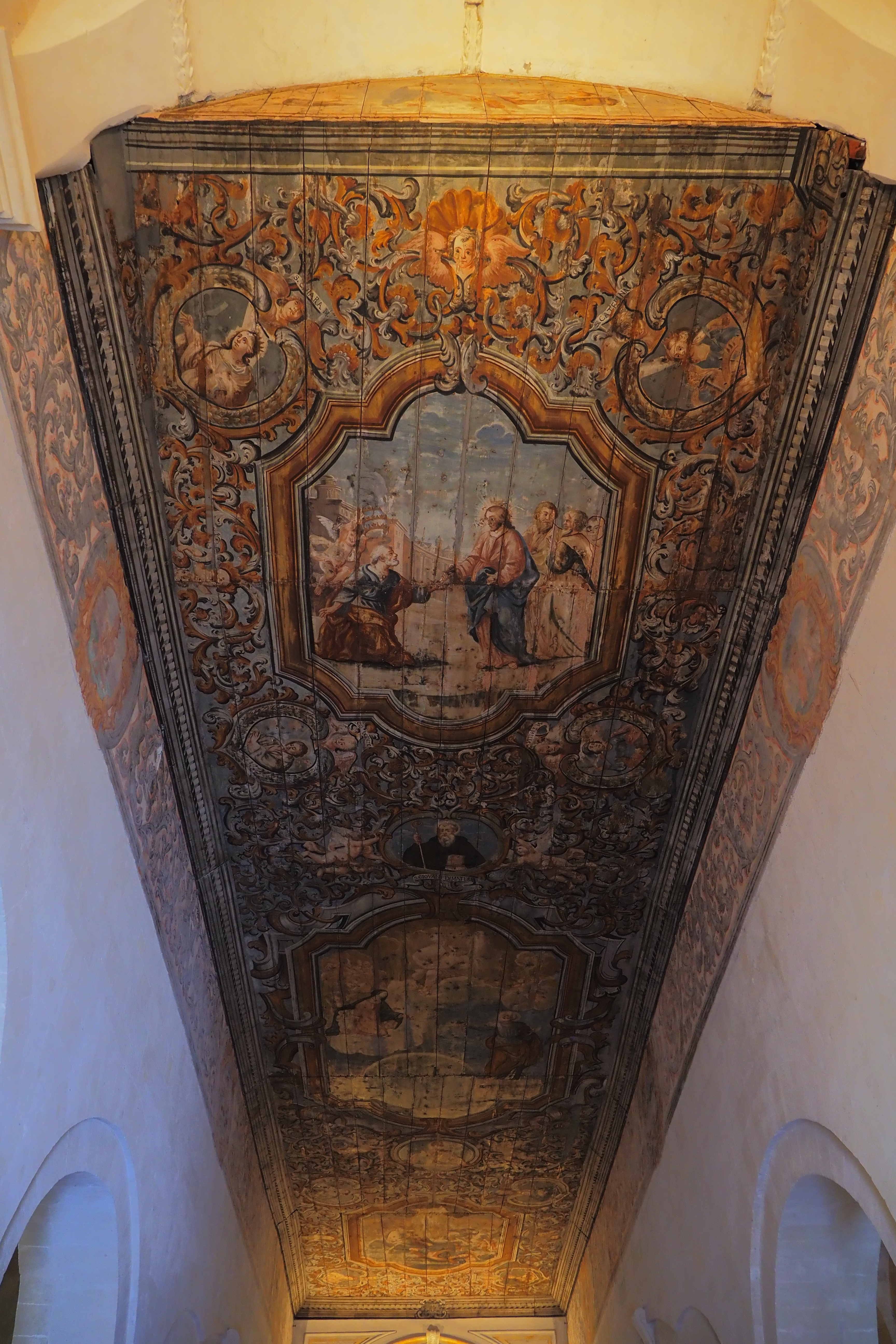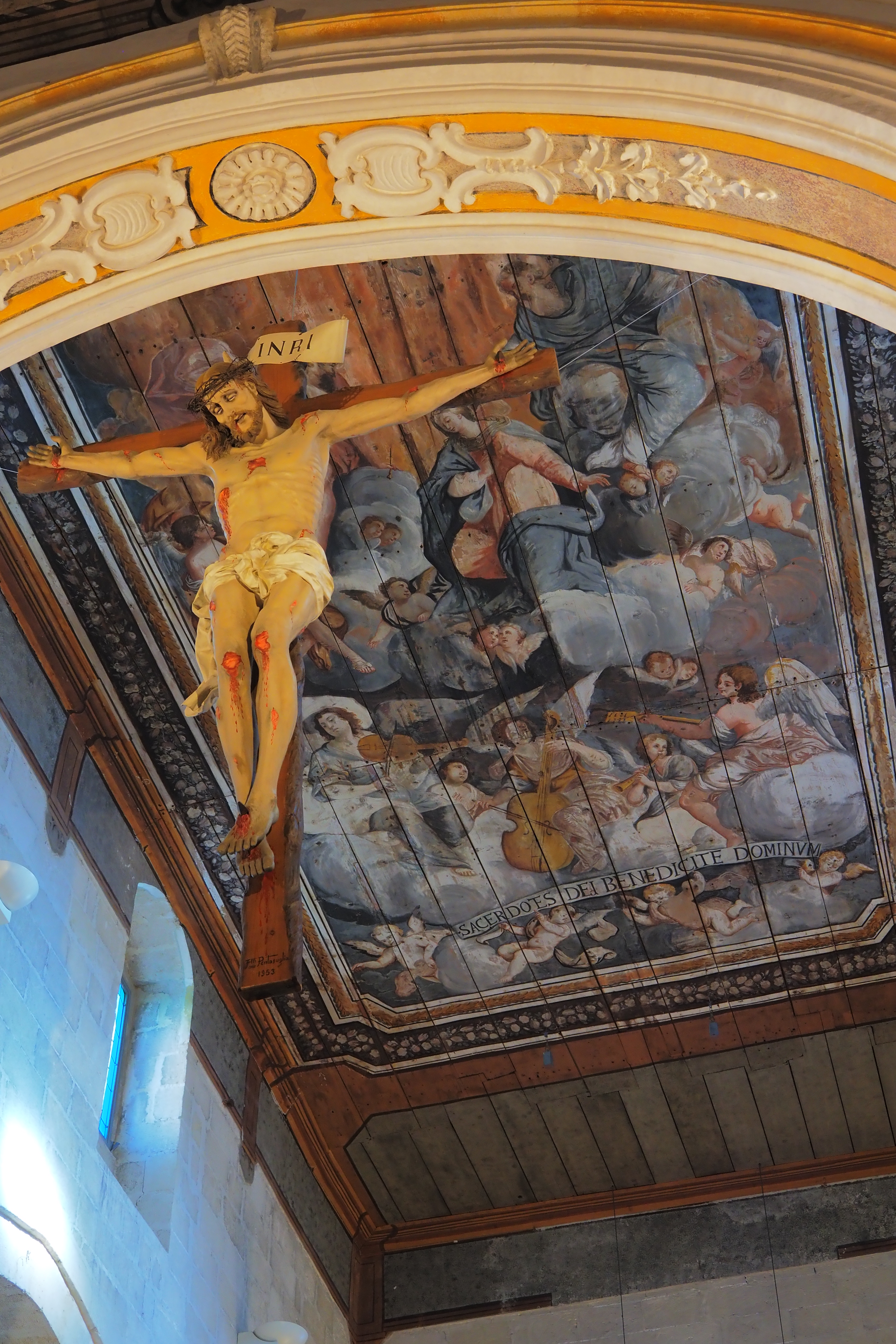 木製の天井は主祭壇のアーチ後方までつづいて、磔となったイエスの後ろに聖母マリアの戴冠が描かれていた。