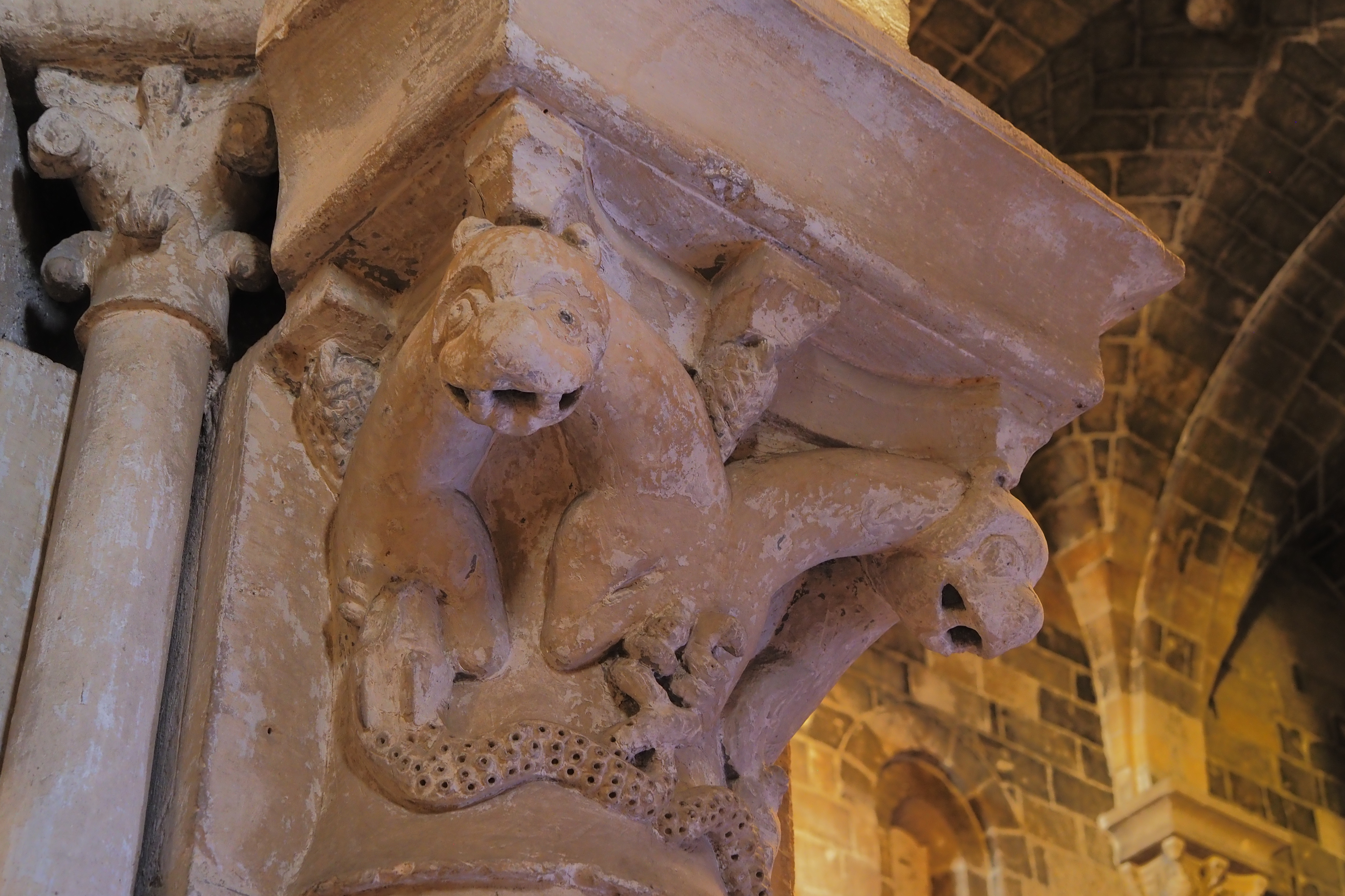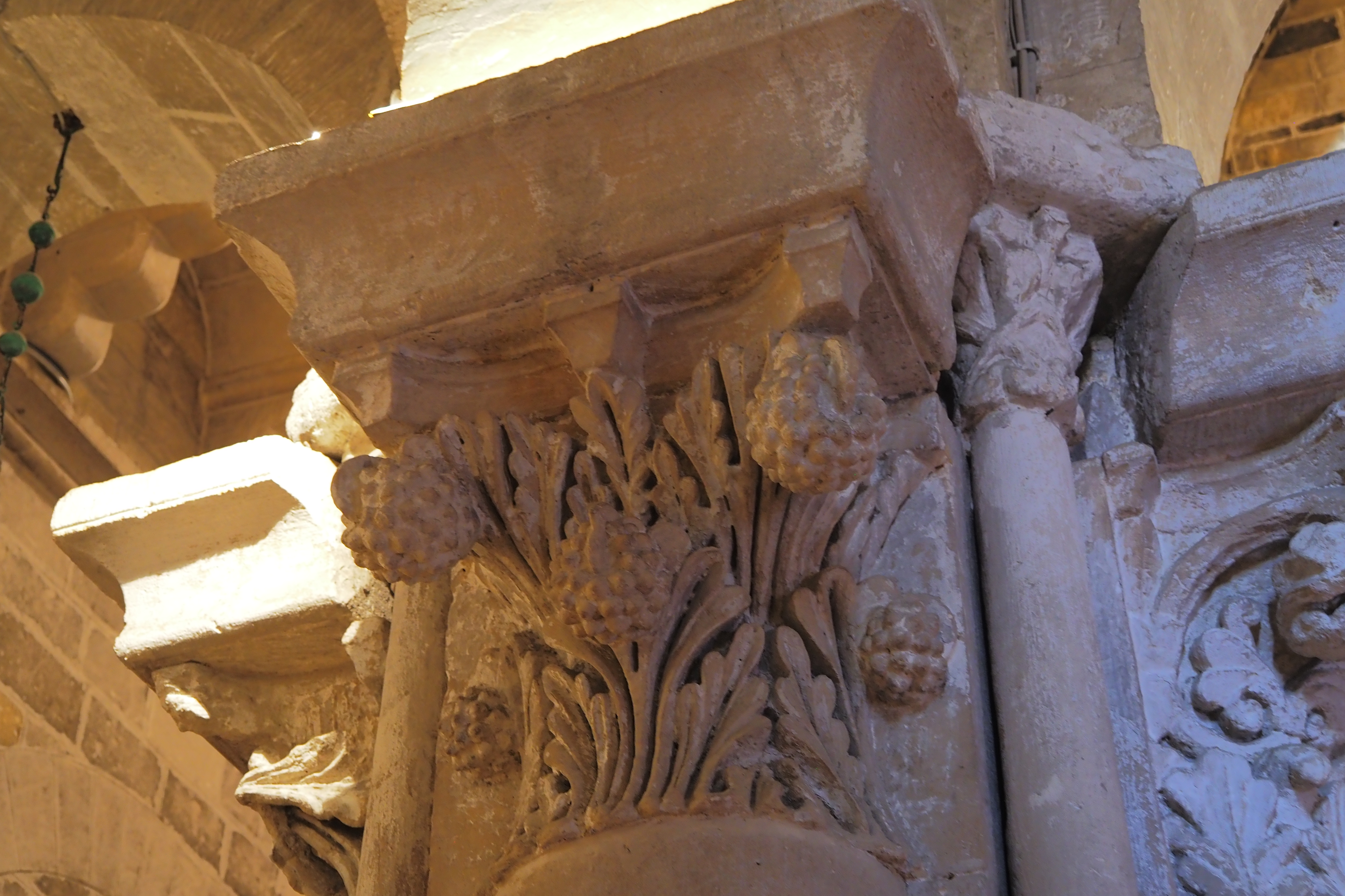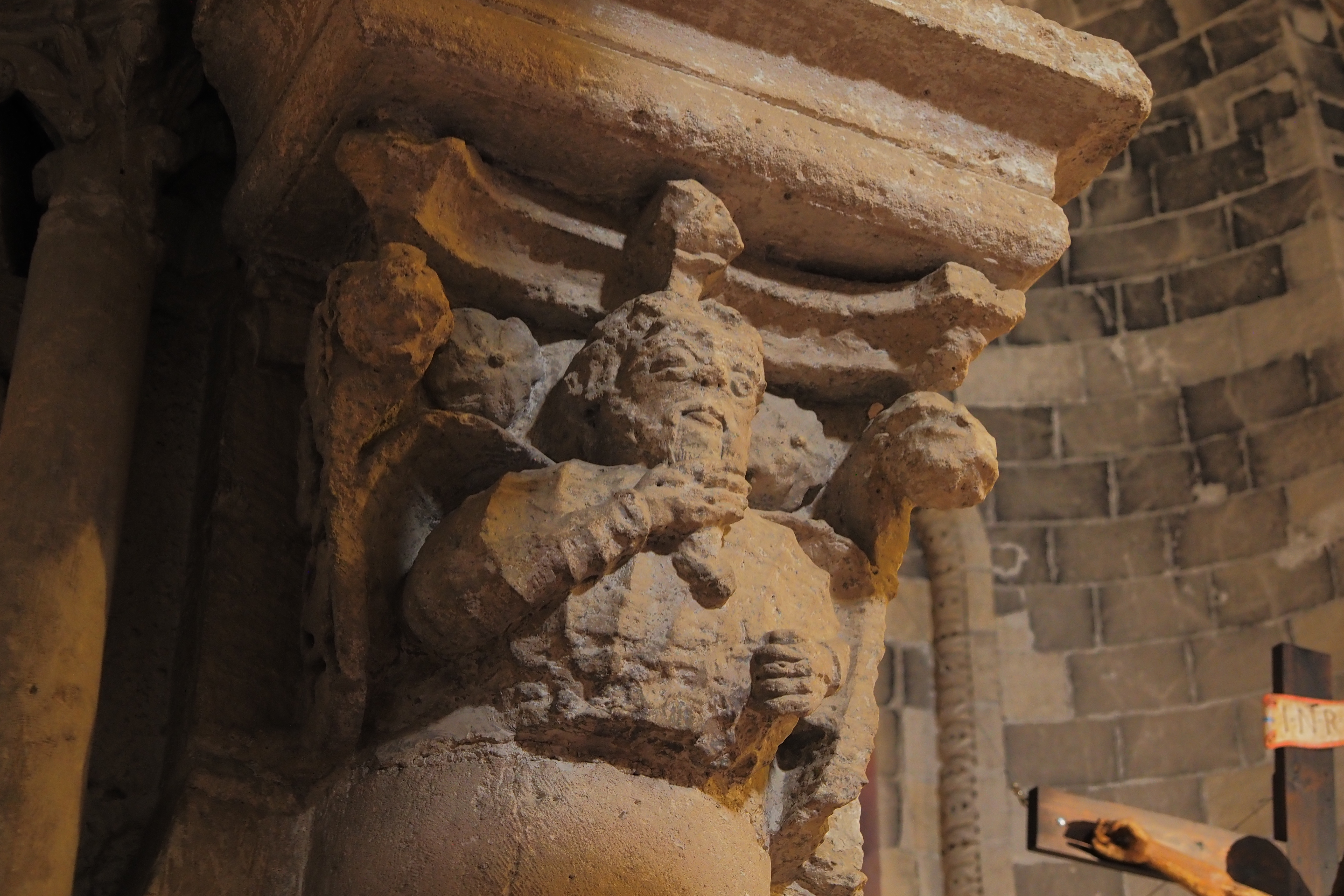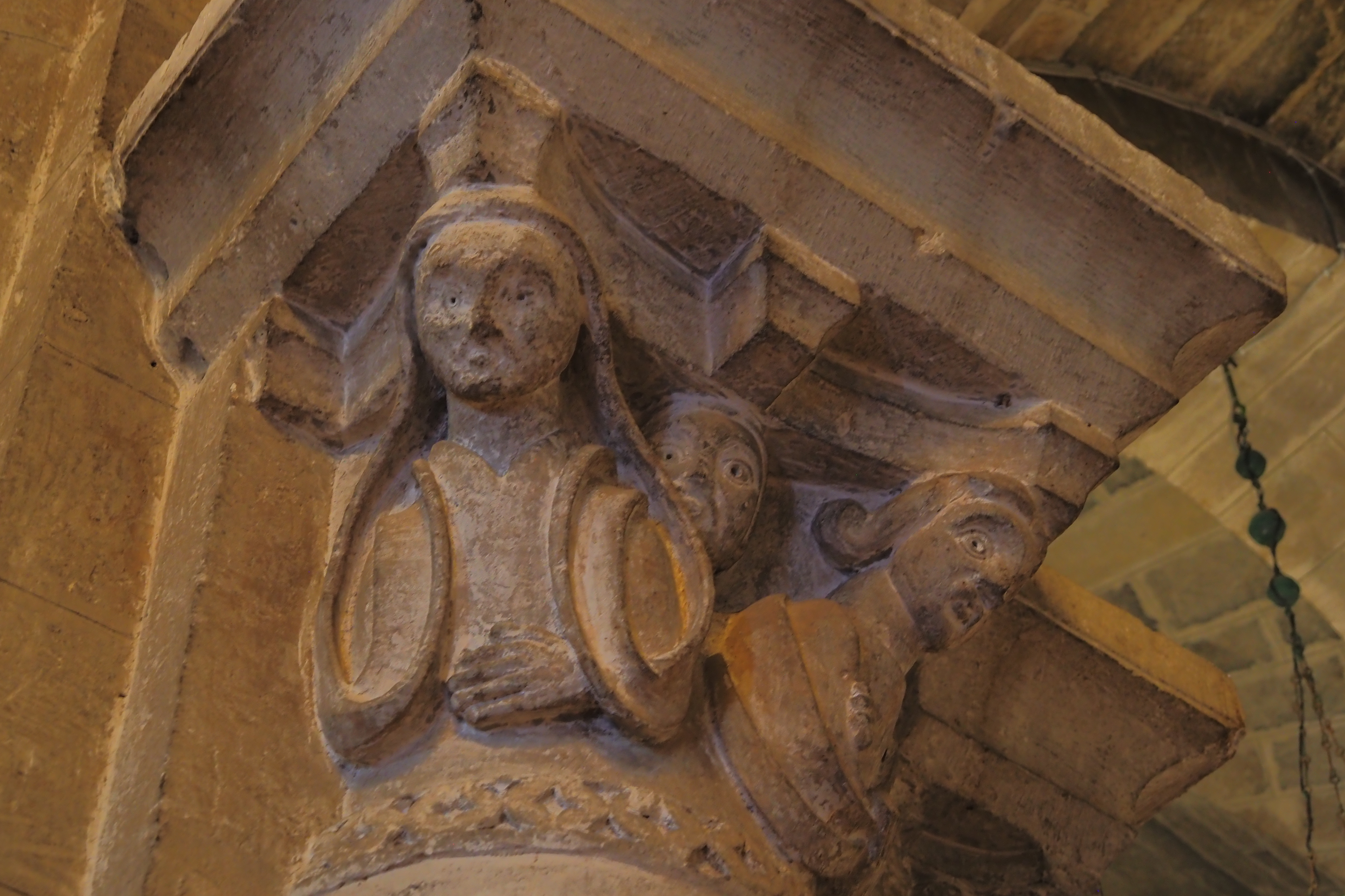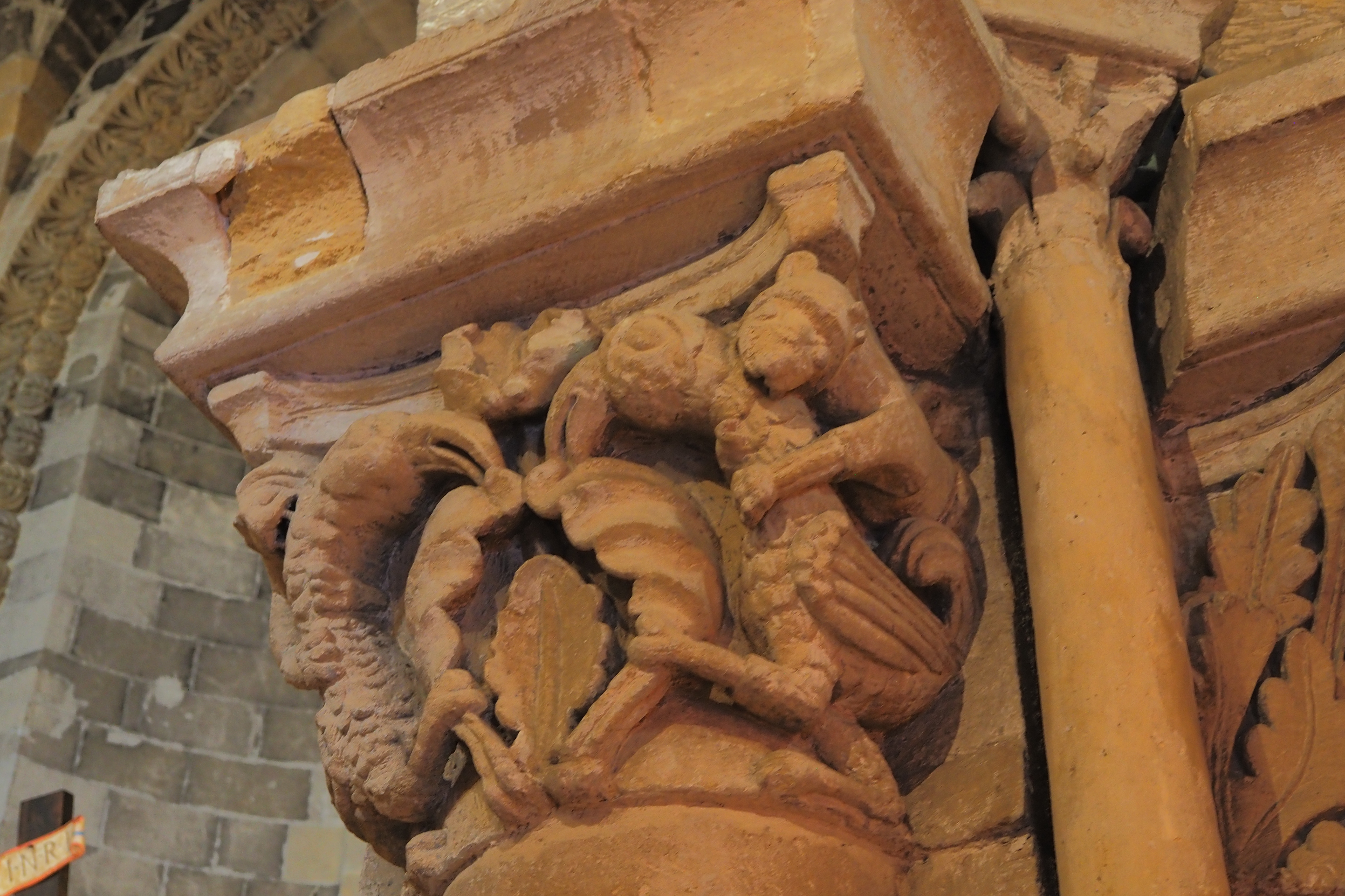 教会を支える重厚な柱の柱頭に施された彫刻がおもしろい。