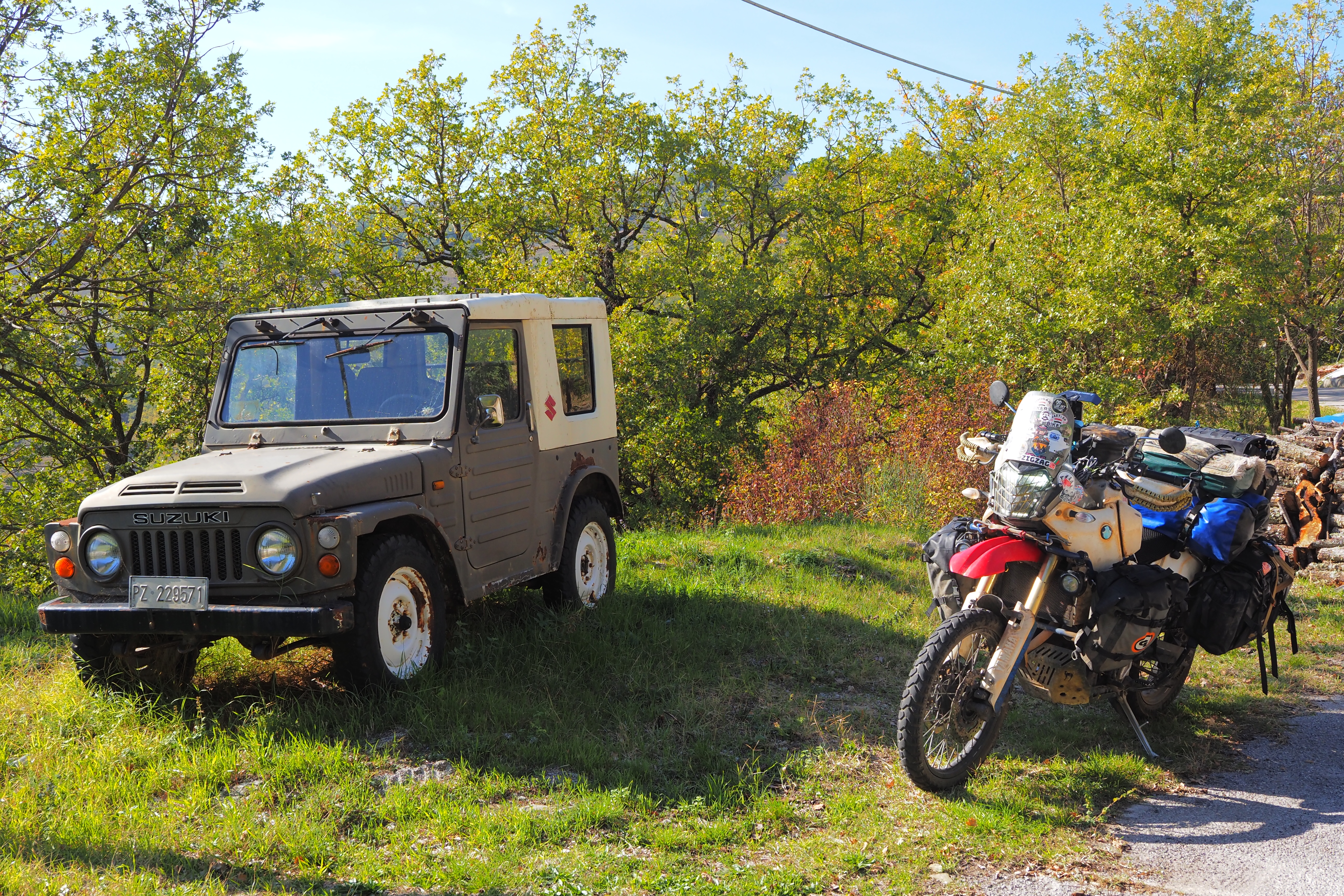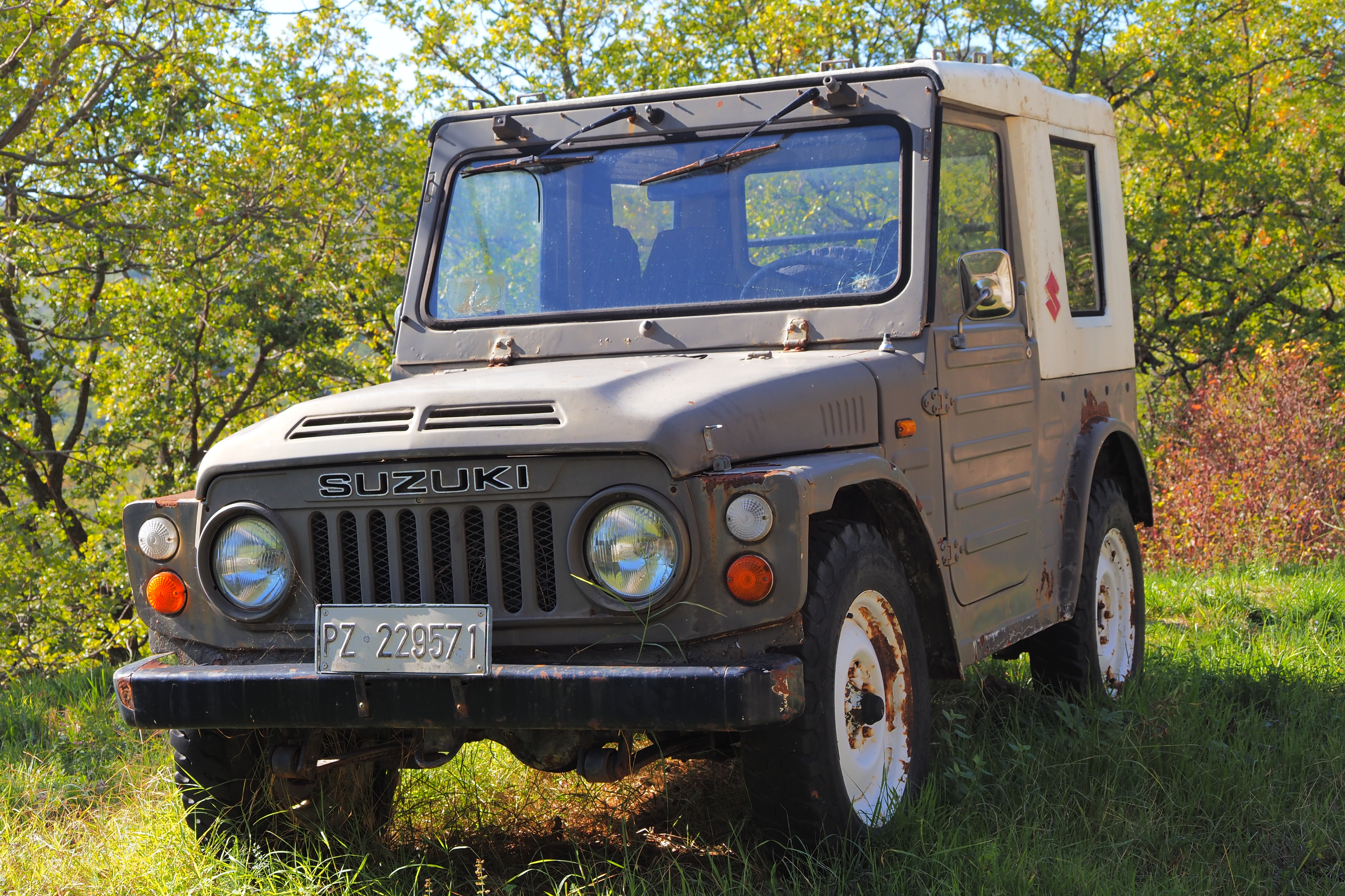なんと SUZUKIの海外仕様ジムニー LJ80 を発見。 国内では ジムニー8の愛称で知られる SJ20 と実質同じ車両で、4サイクルエンジンとしては最初期型のジムニーといえる。近くにあった若草色のトラックは OMLO というメーカーみたいだけど、詳細不明。こういう謎車が道端に現れるのは楽しいし、現行の味気ない車と違って絵になる。