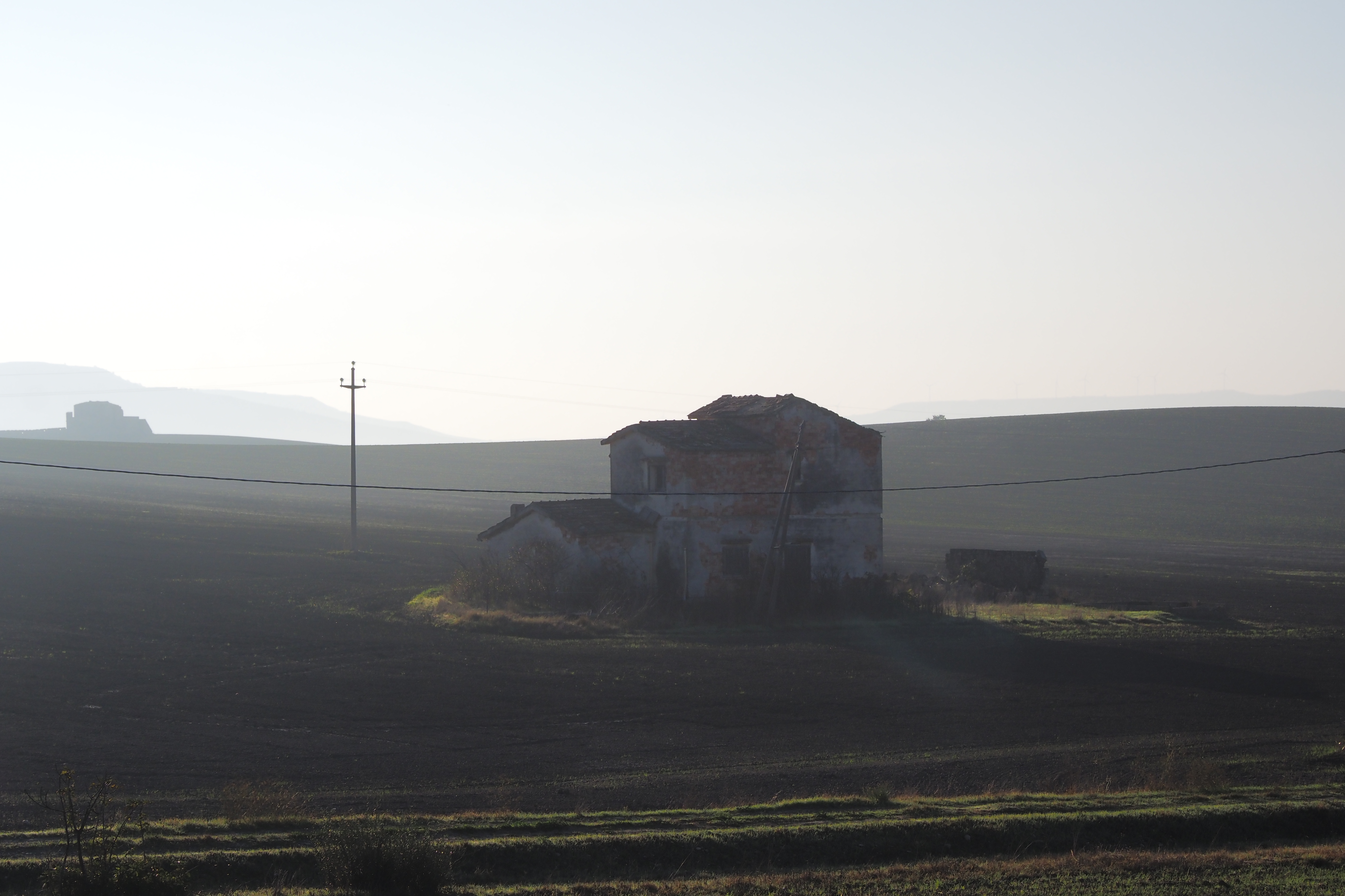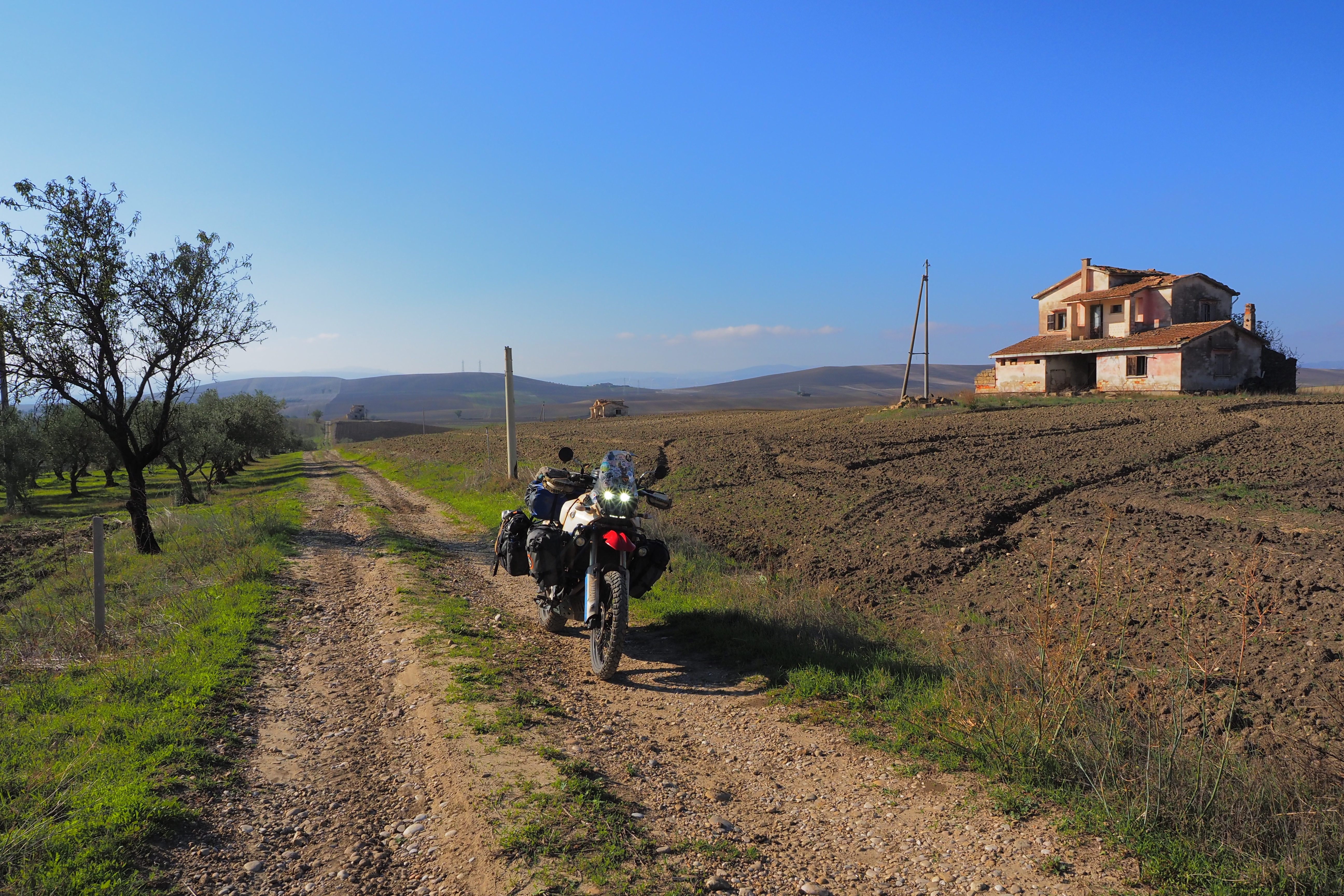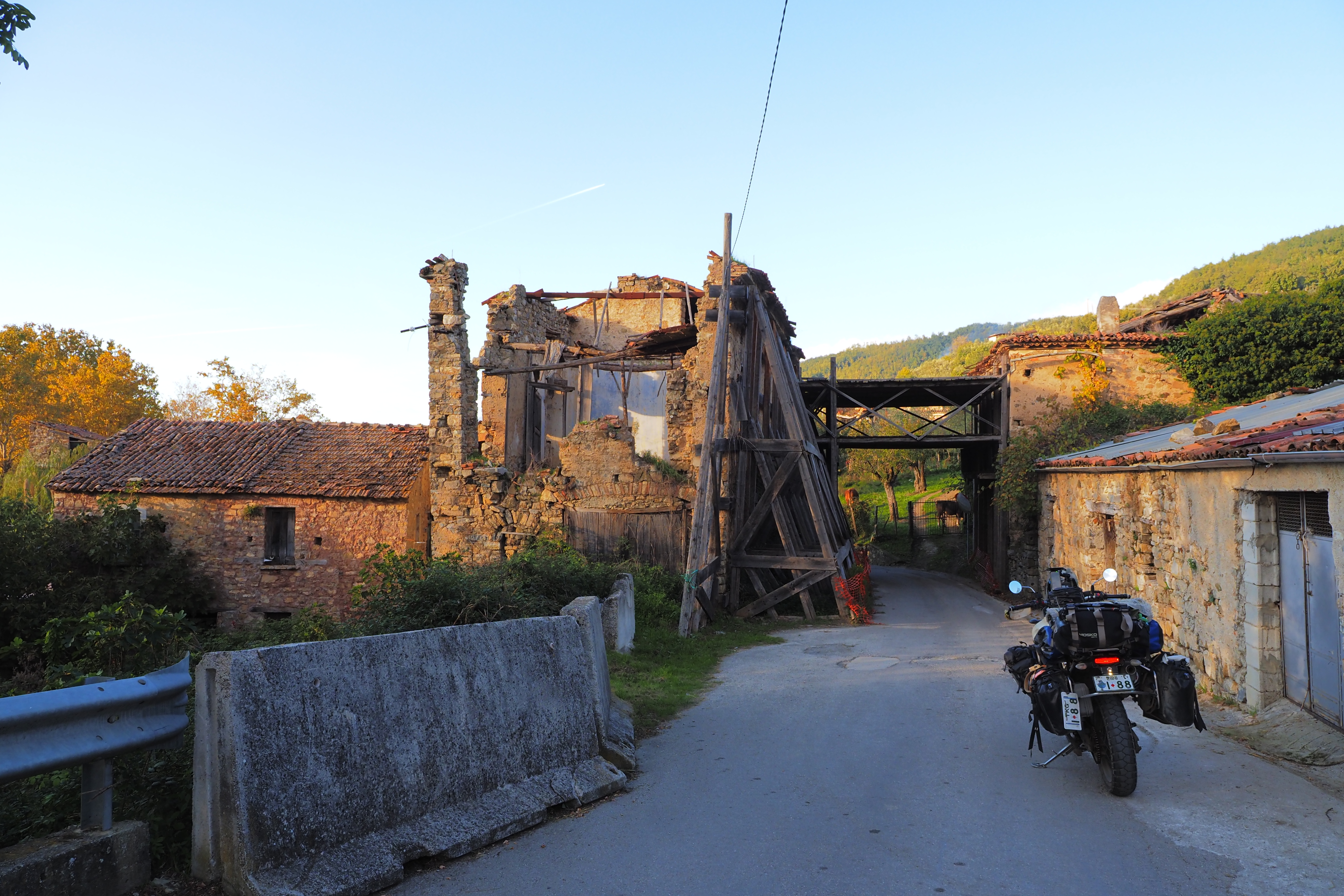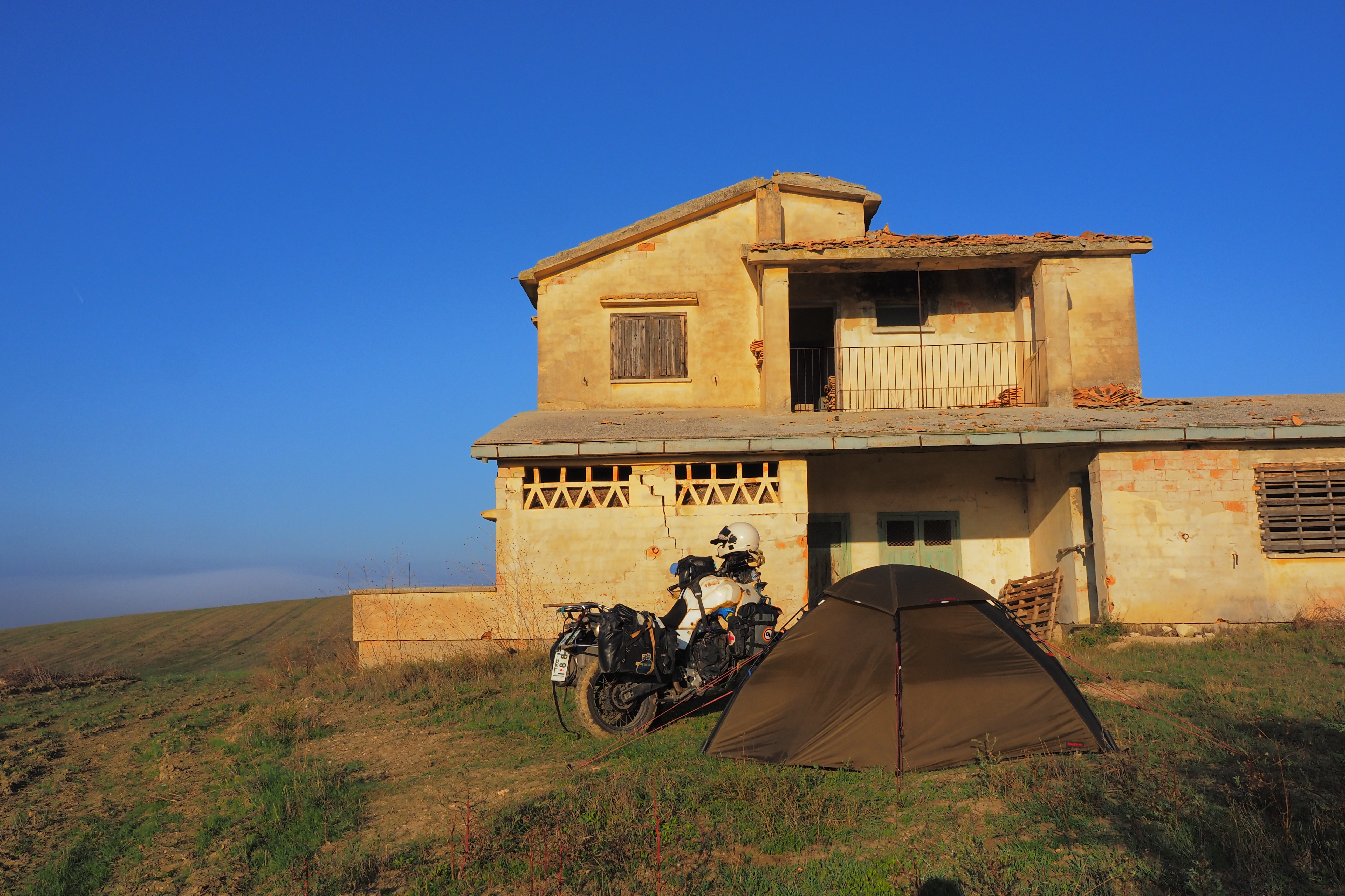 朝、Taccone; タッコーネ近くの廃屋群が集まる農道にて目を覚ます。