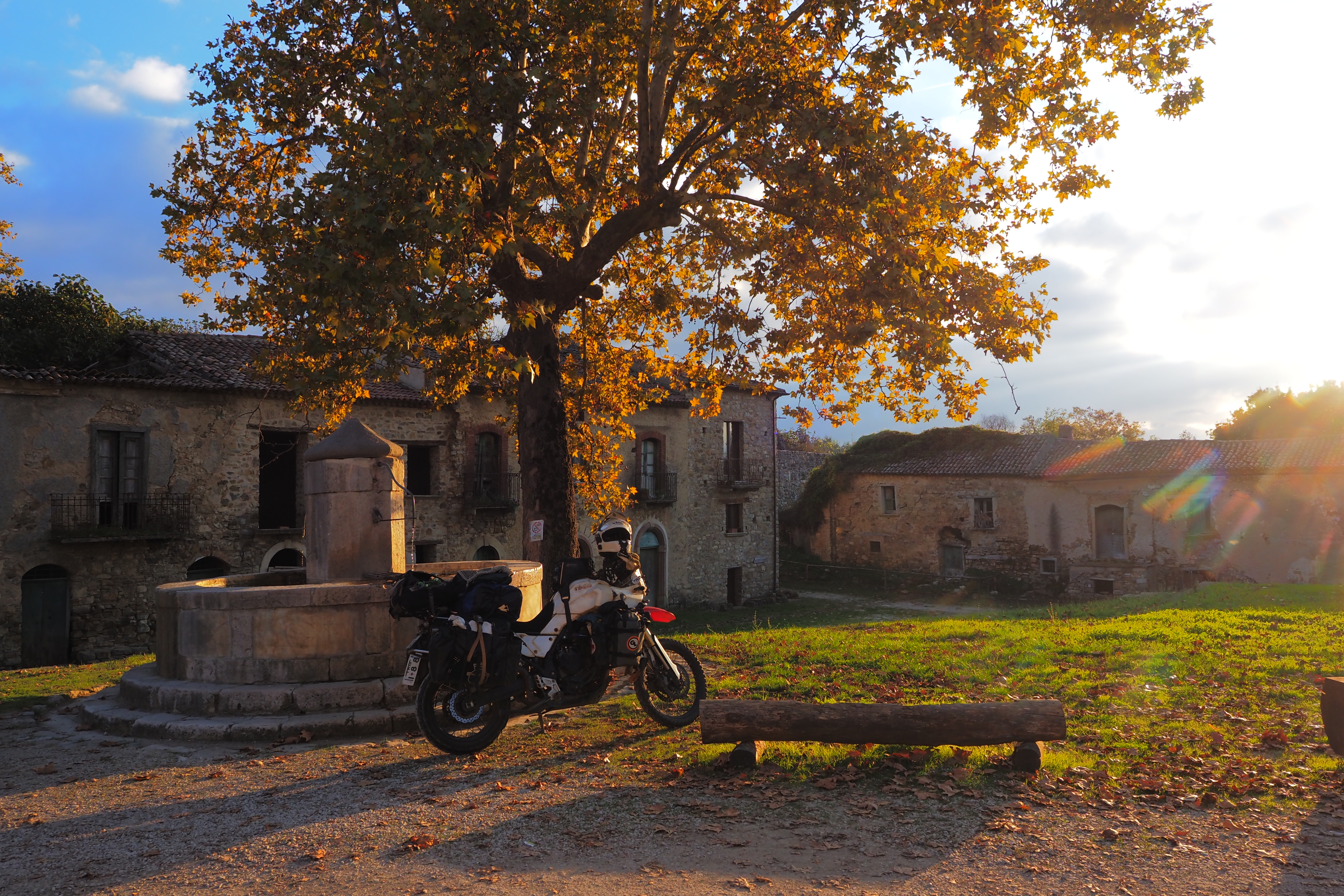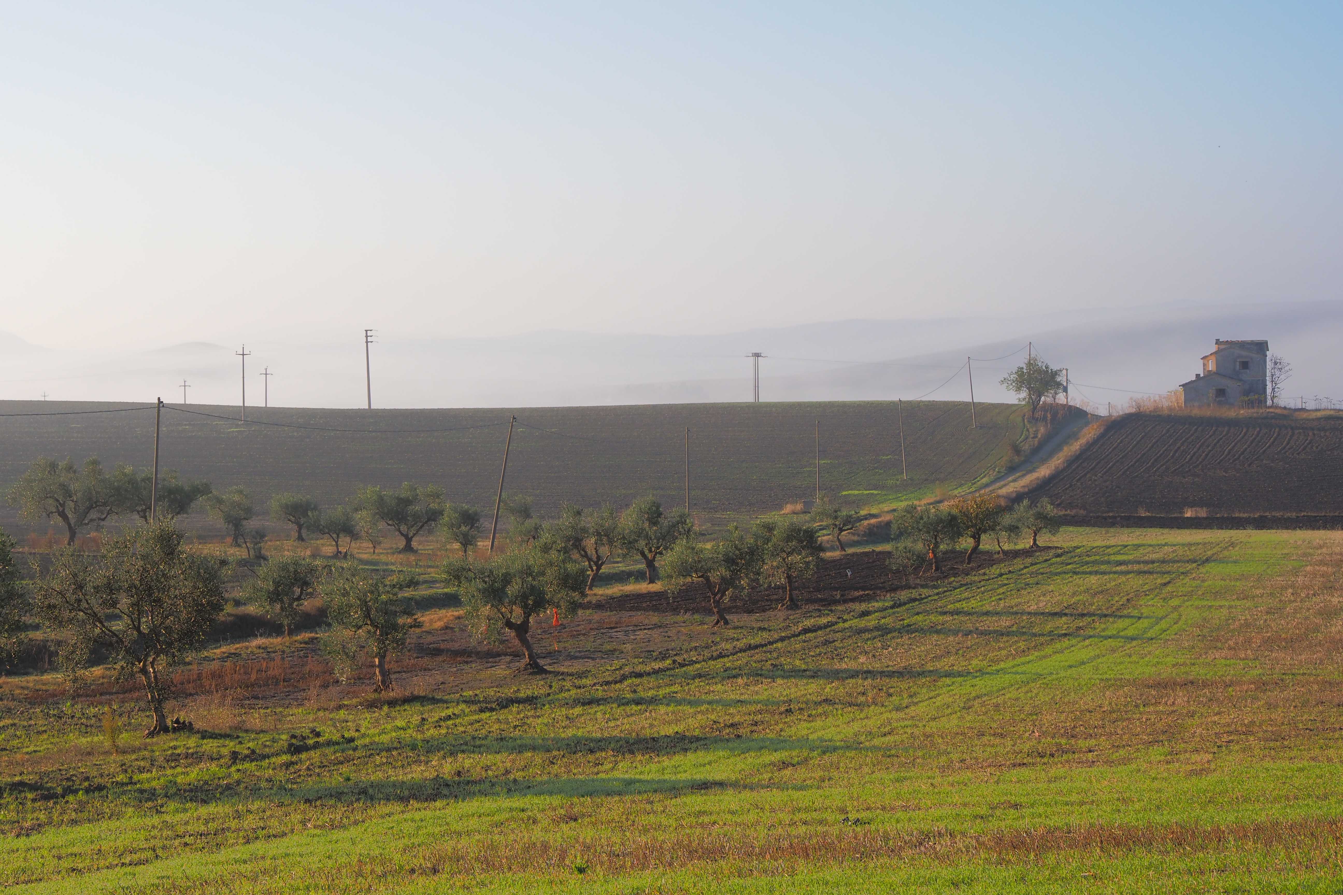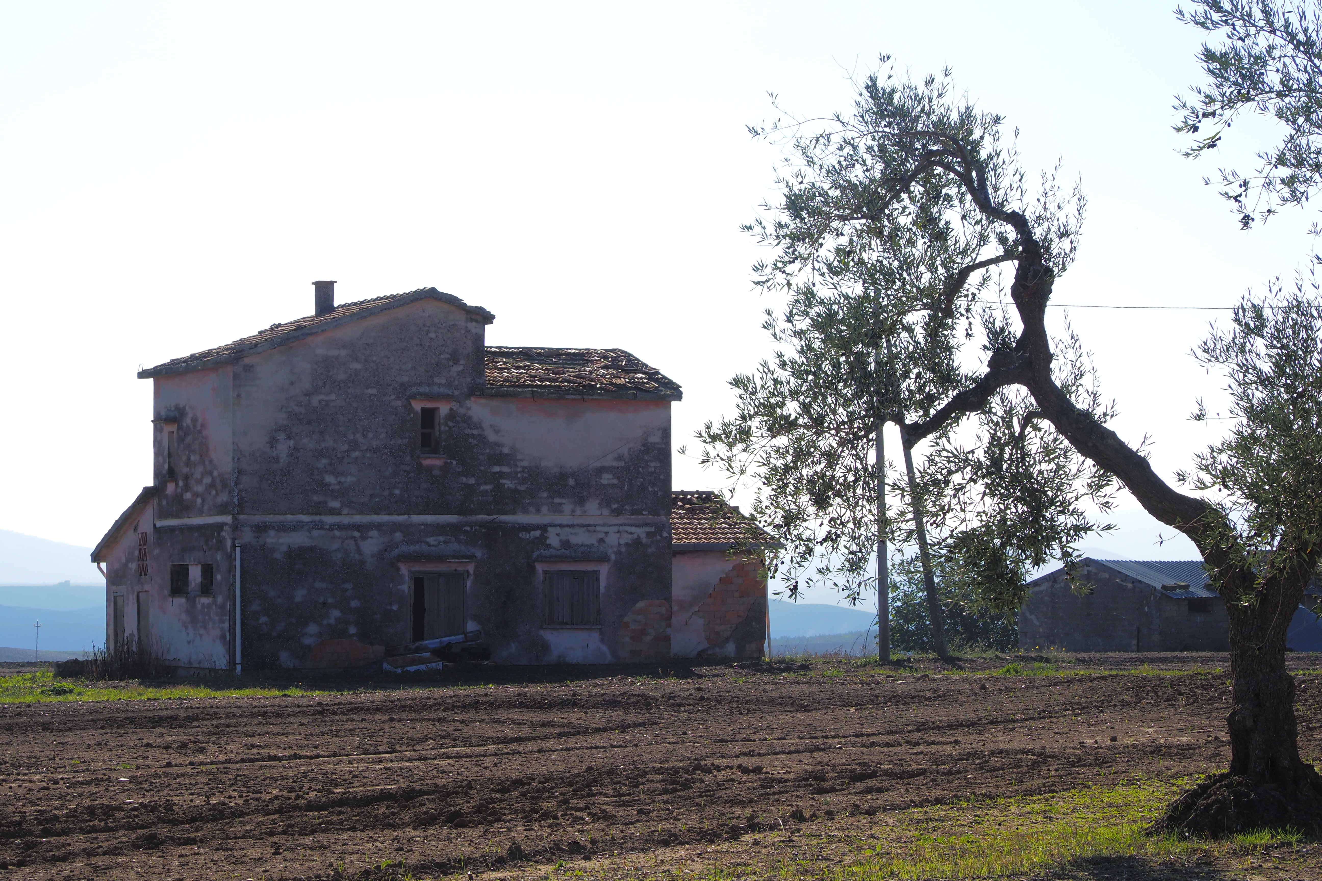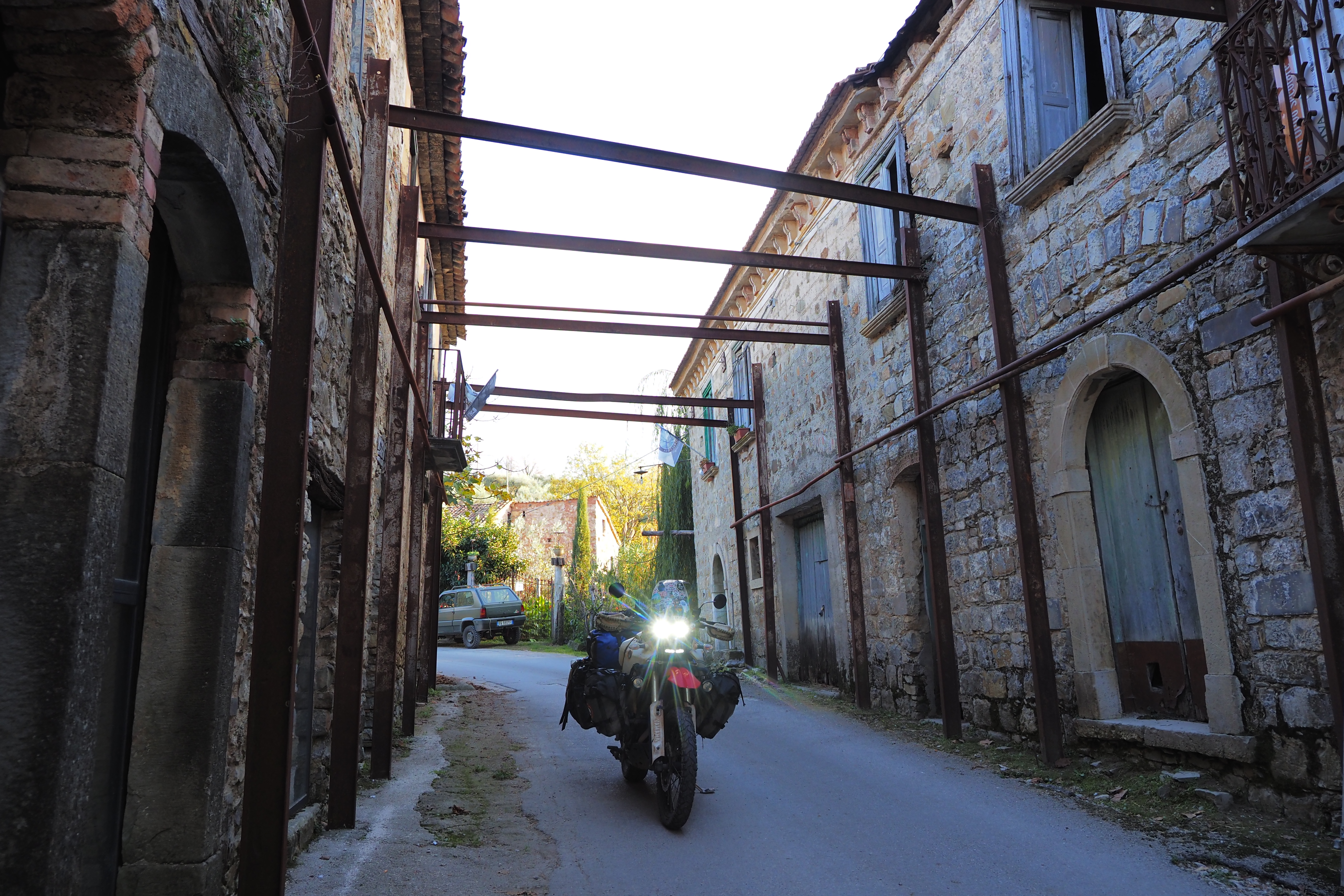 朝、Taccone; タッコーネ近くの廃屋群が集まる農道にて目を覚ます。