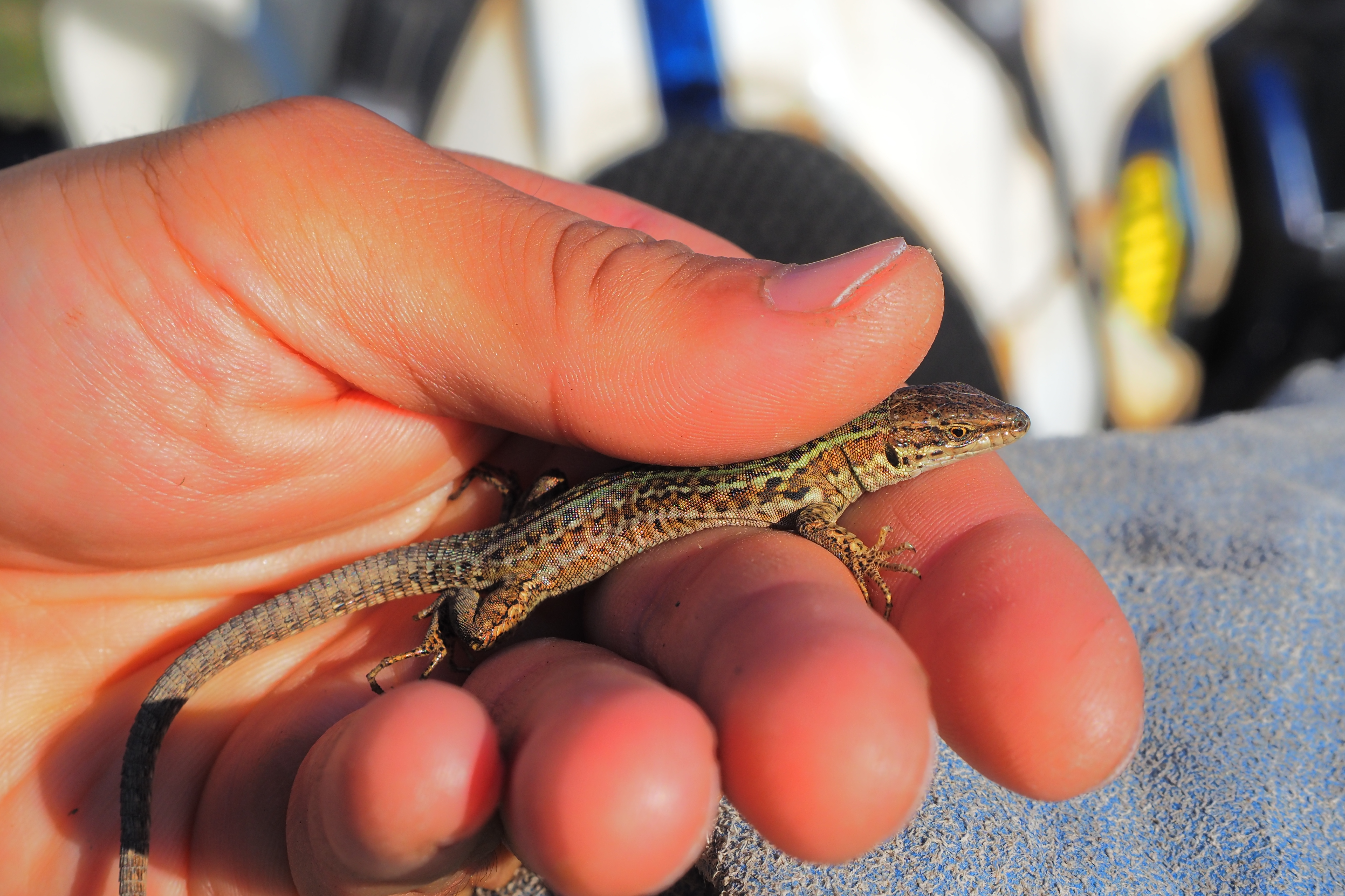 廃屋の壁にいた綺麗なトカゲ捕まえて、
