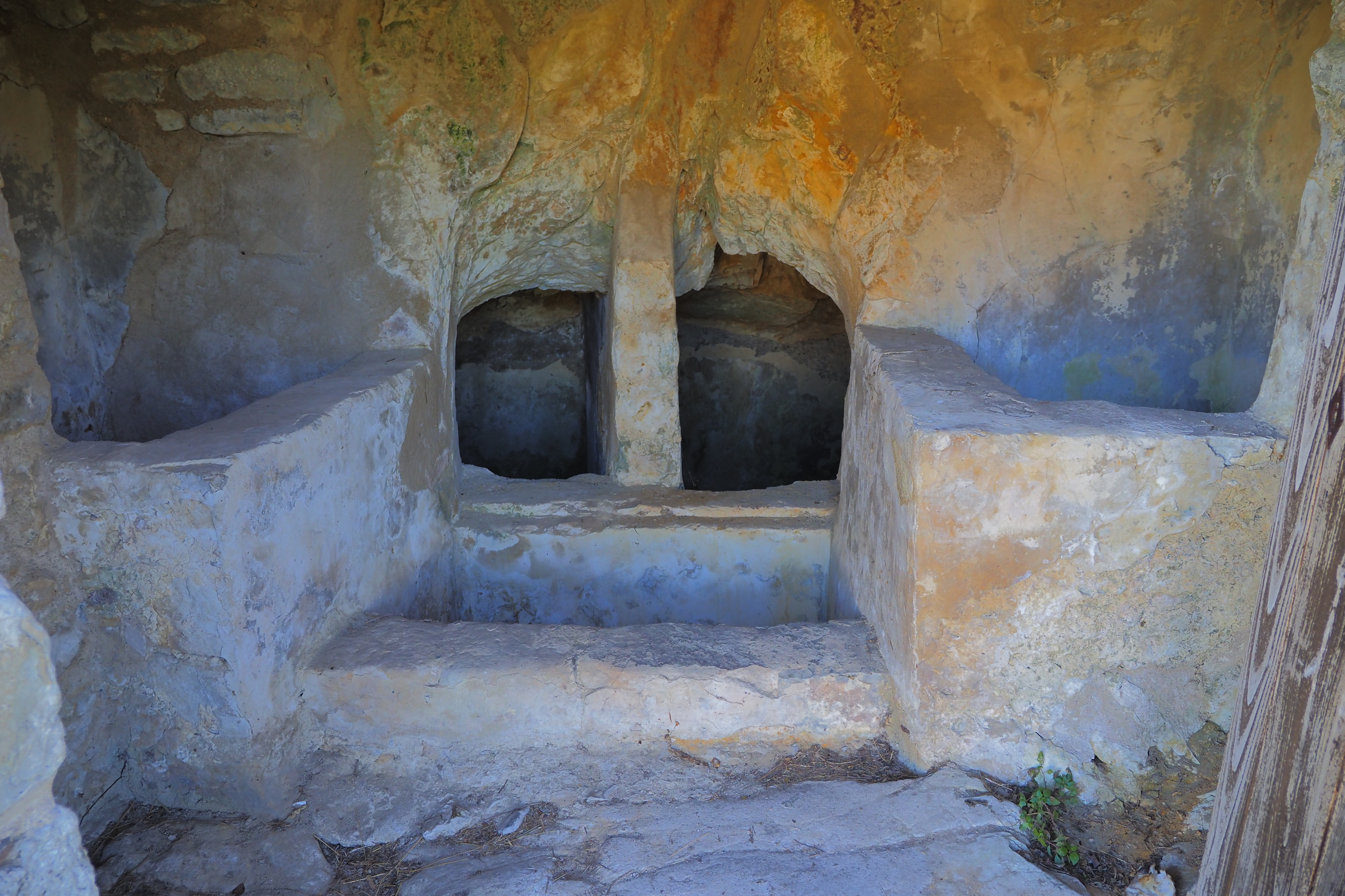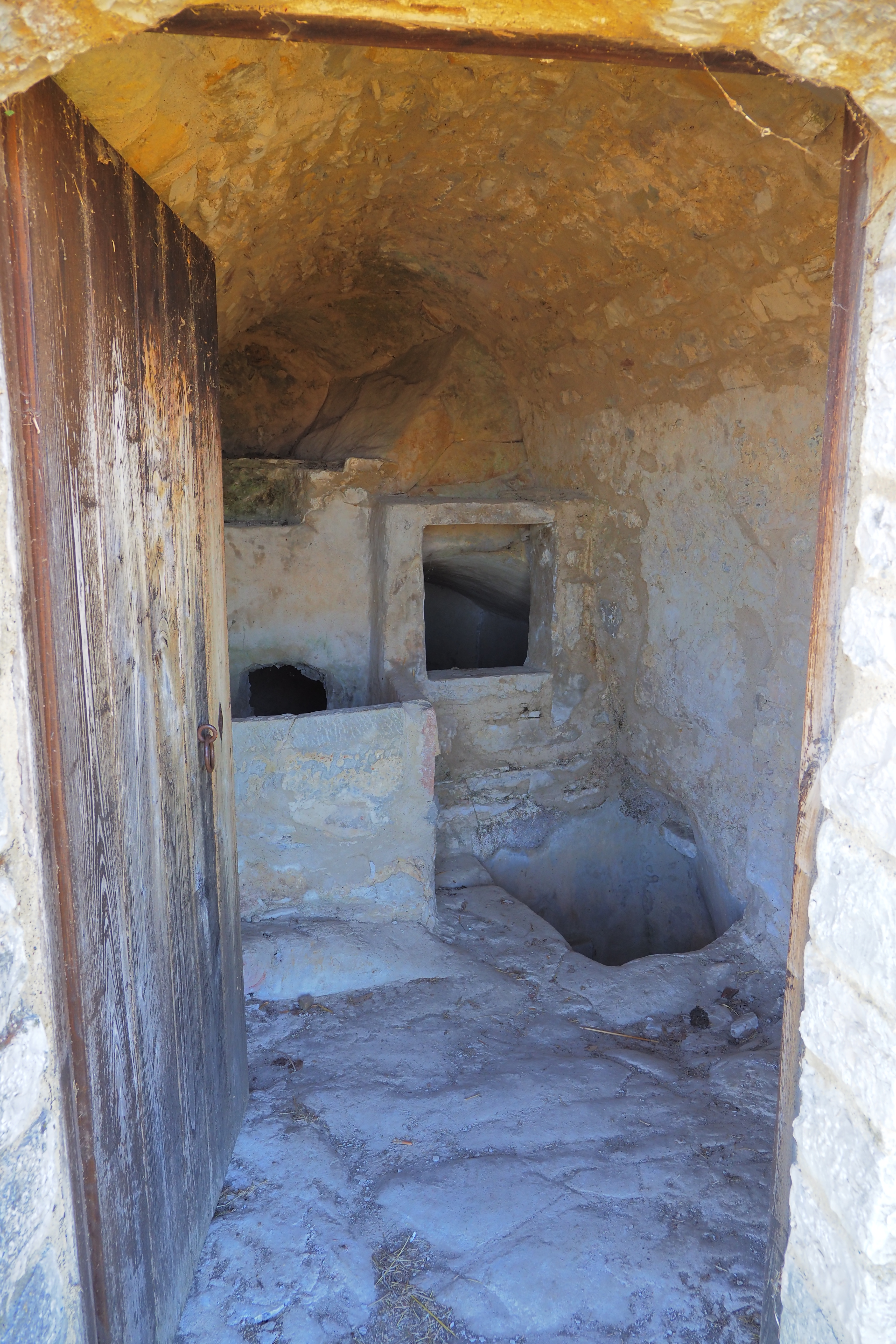 収穫されたブドウはまずロバによってここに運び込まれて、上層の水槽で踏み潰されて圧搾された果汁が下槽に溜って発酵された。