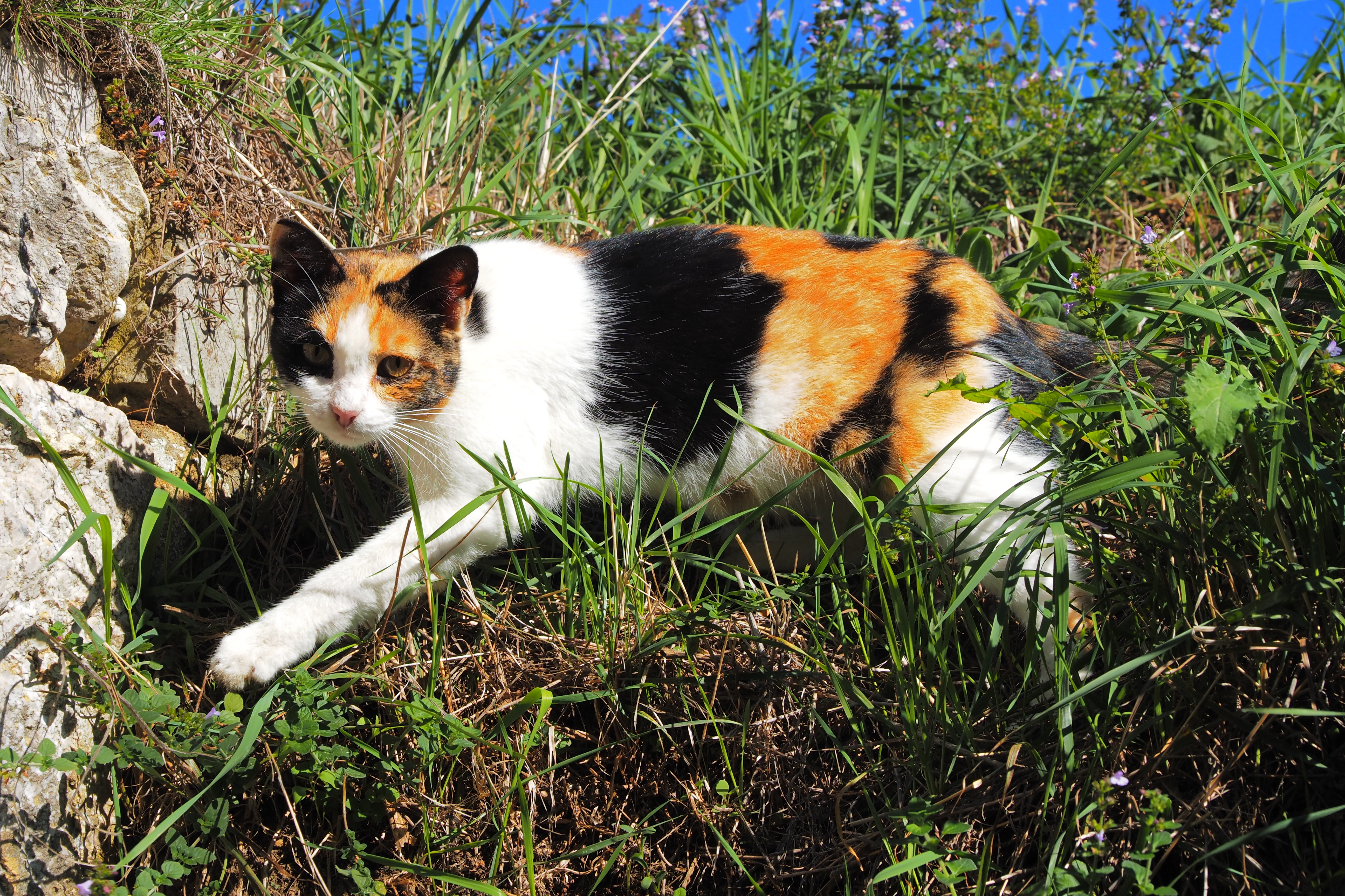 芝葺屋根の上から偵察にやってきたイタリアン三毛にゃん。