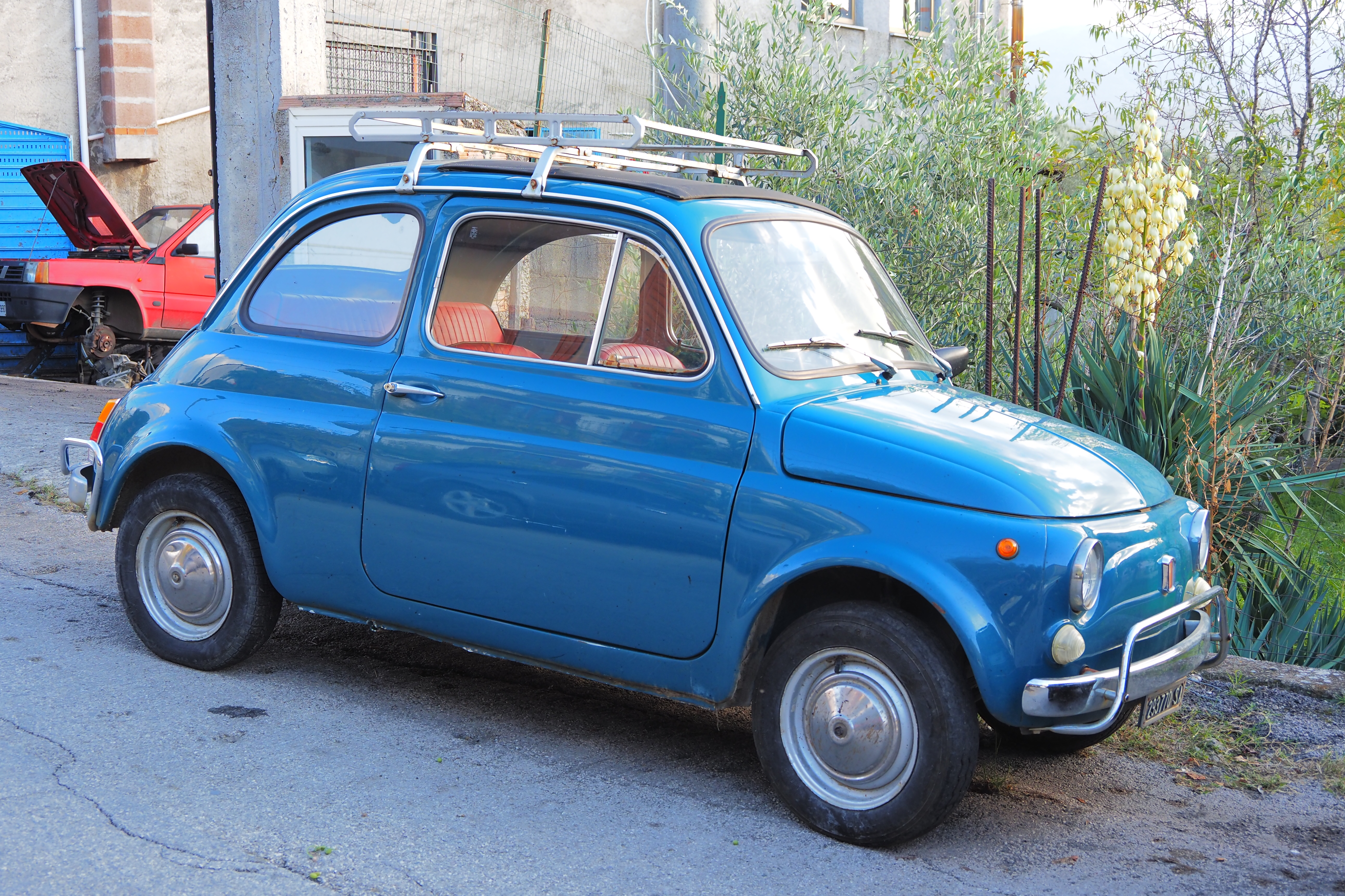 なかなかに寂れた街だけど、鮮やかブルーなフィアット500が停めて会ってテンション爆あがり。