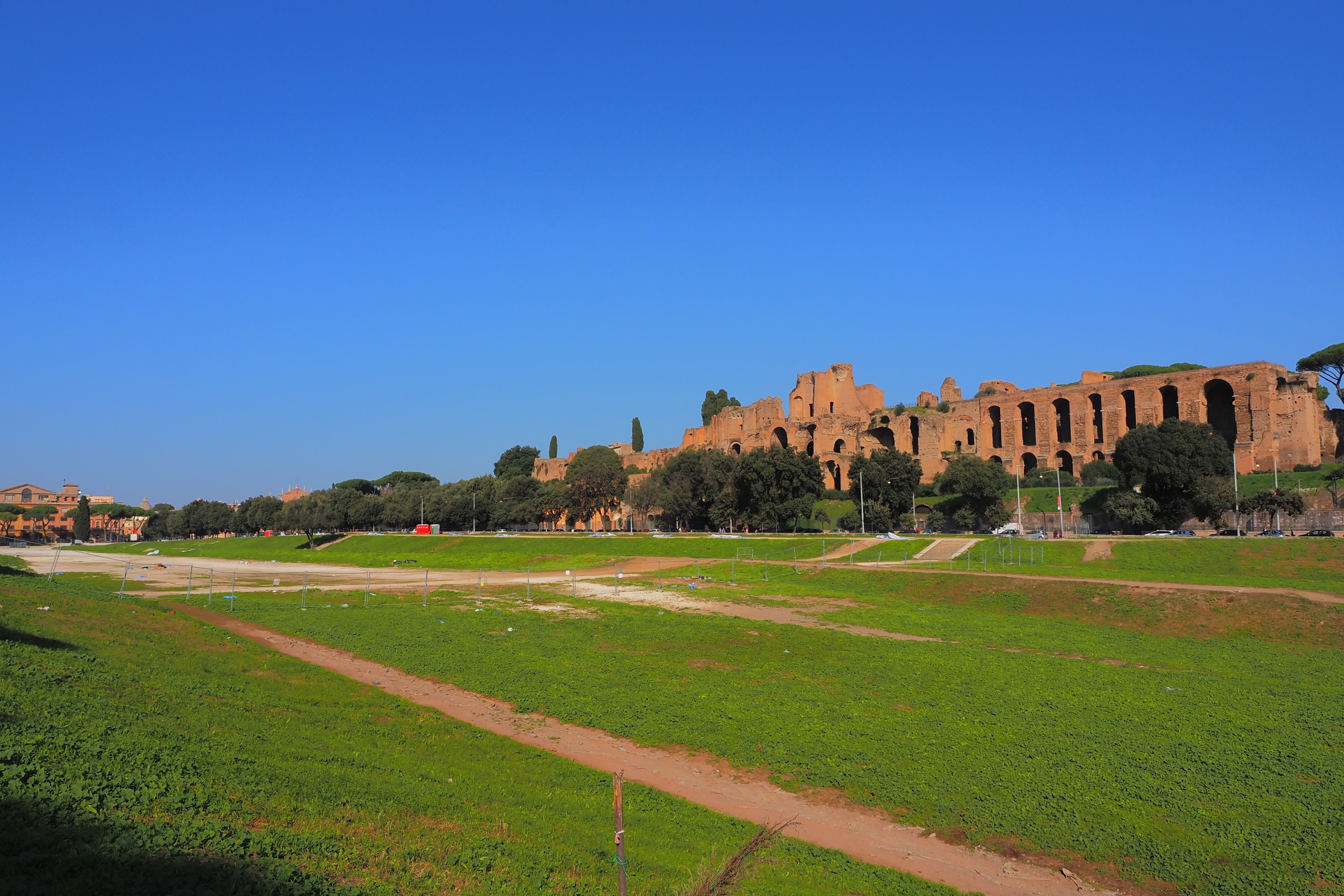 巨大な競技場跡地のCirco Massimo の広場と、その向こうに Colle Palatino; パラティーノの丘という考古学公園の遺構群が見える。