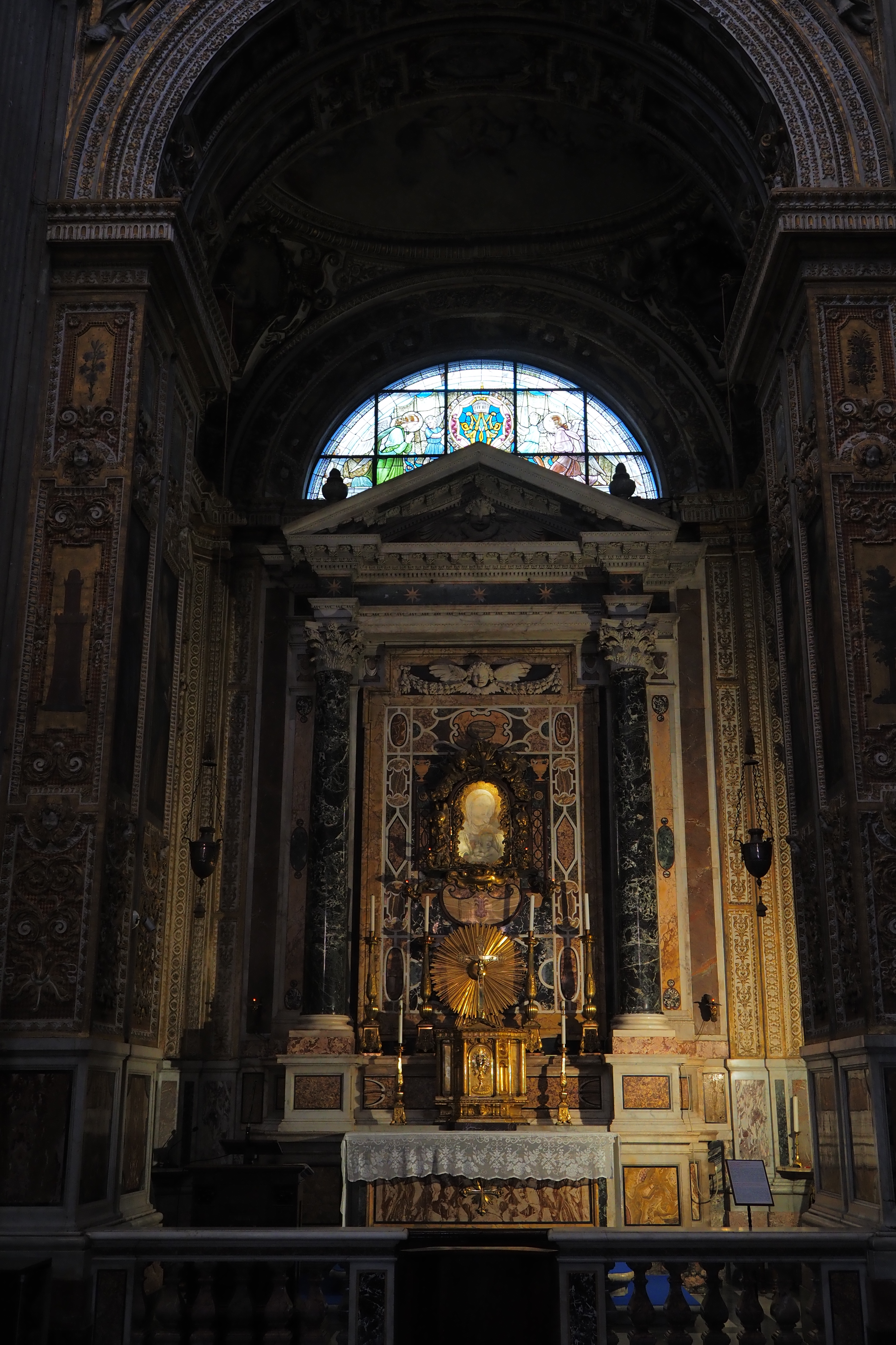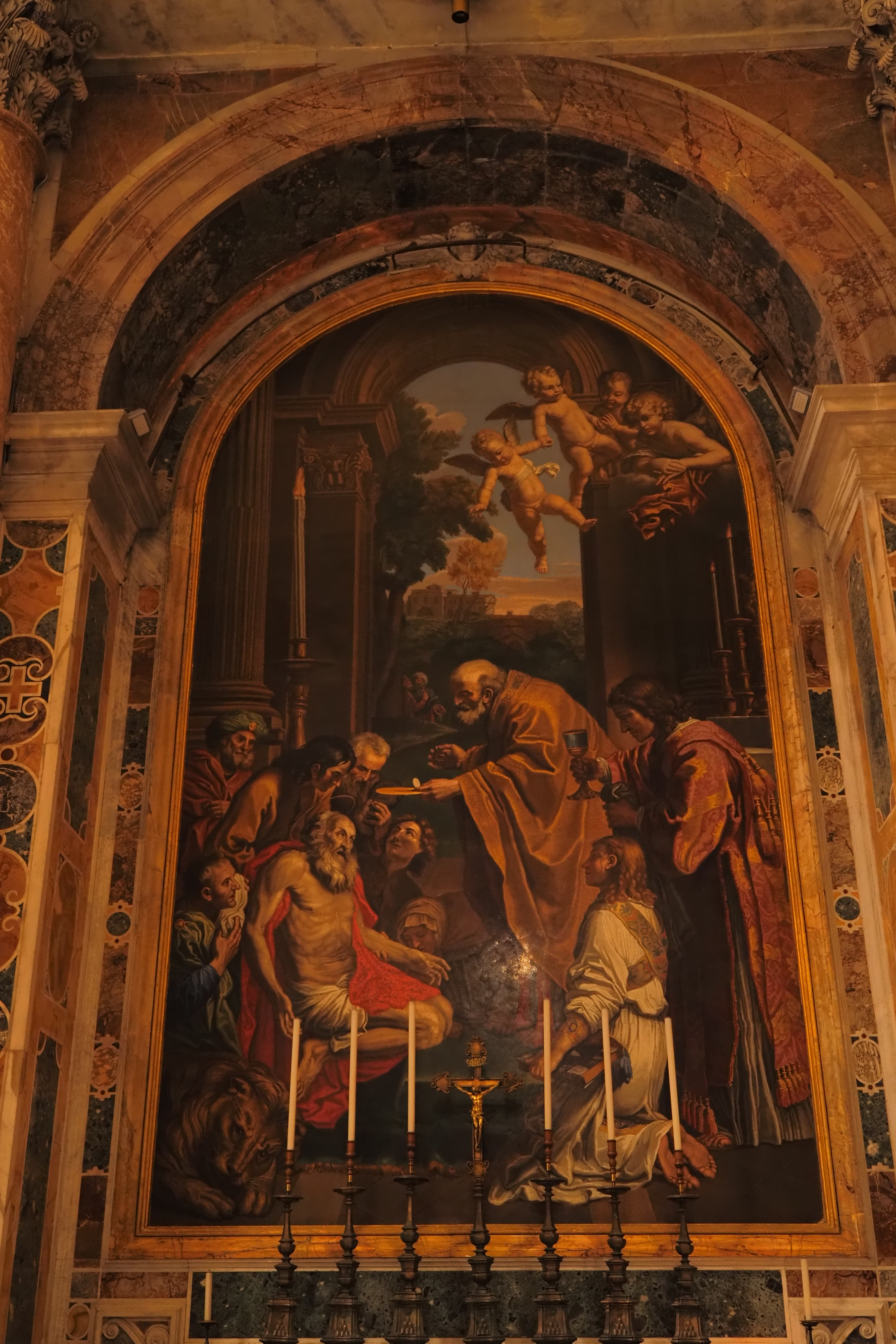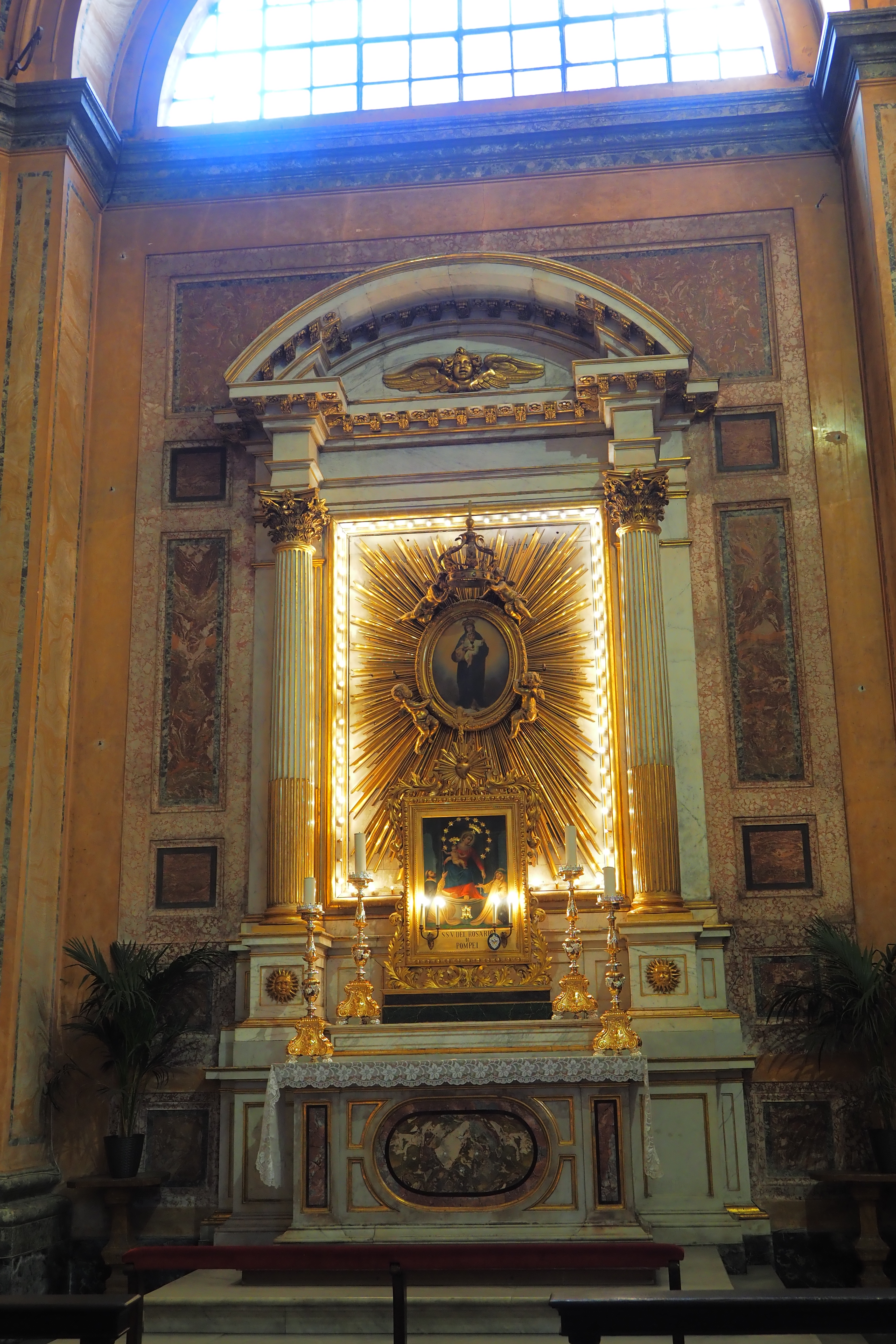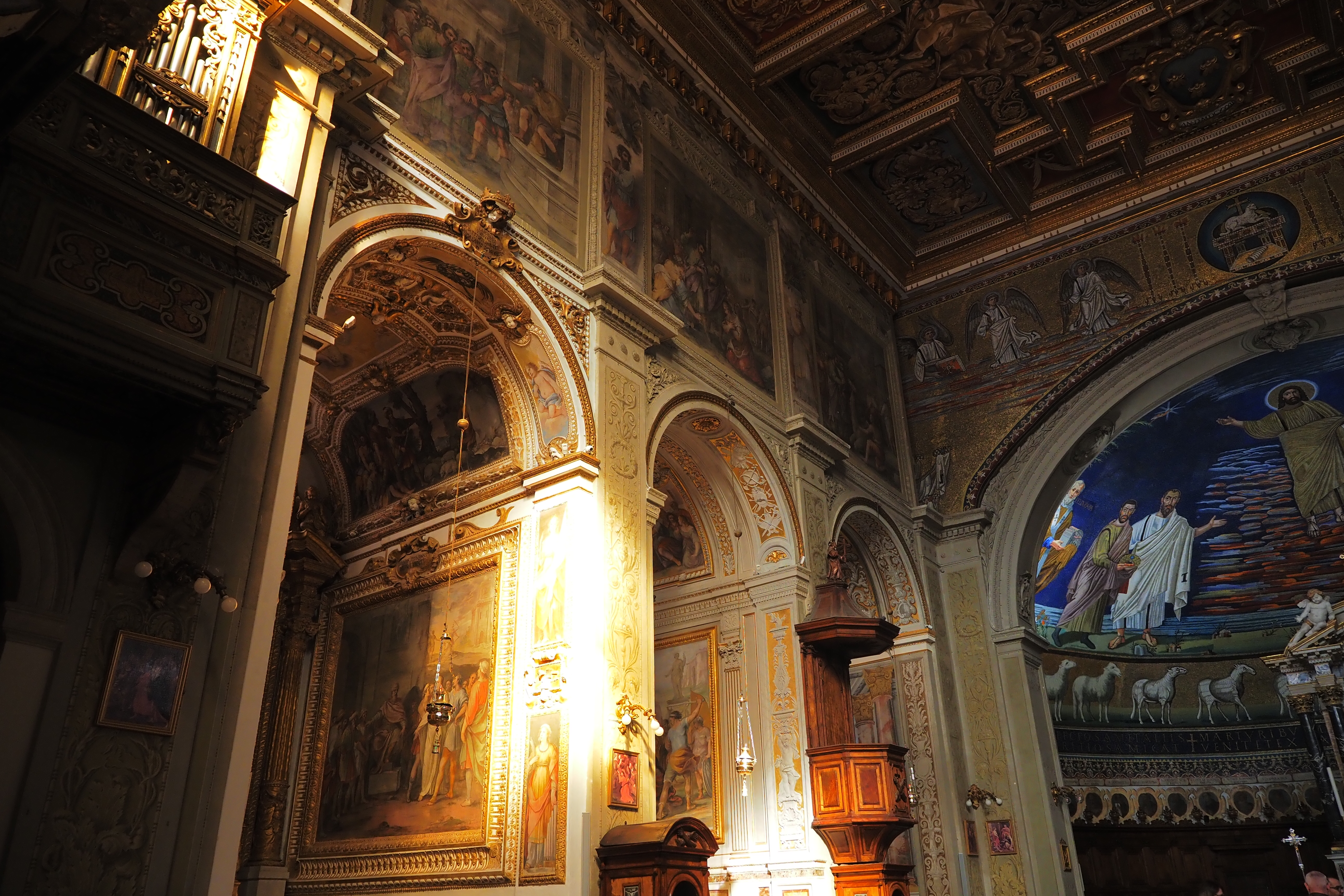 三廊式ラテン十字バシリカの側廊に並ぶサイドアルターたち。ひとつひとつが、小さな教会の主祭壇を凌駕する豪奢さ。