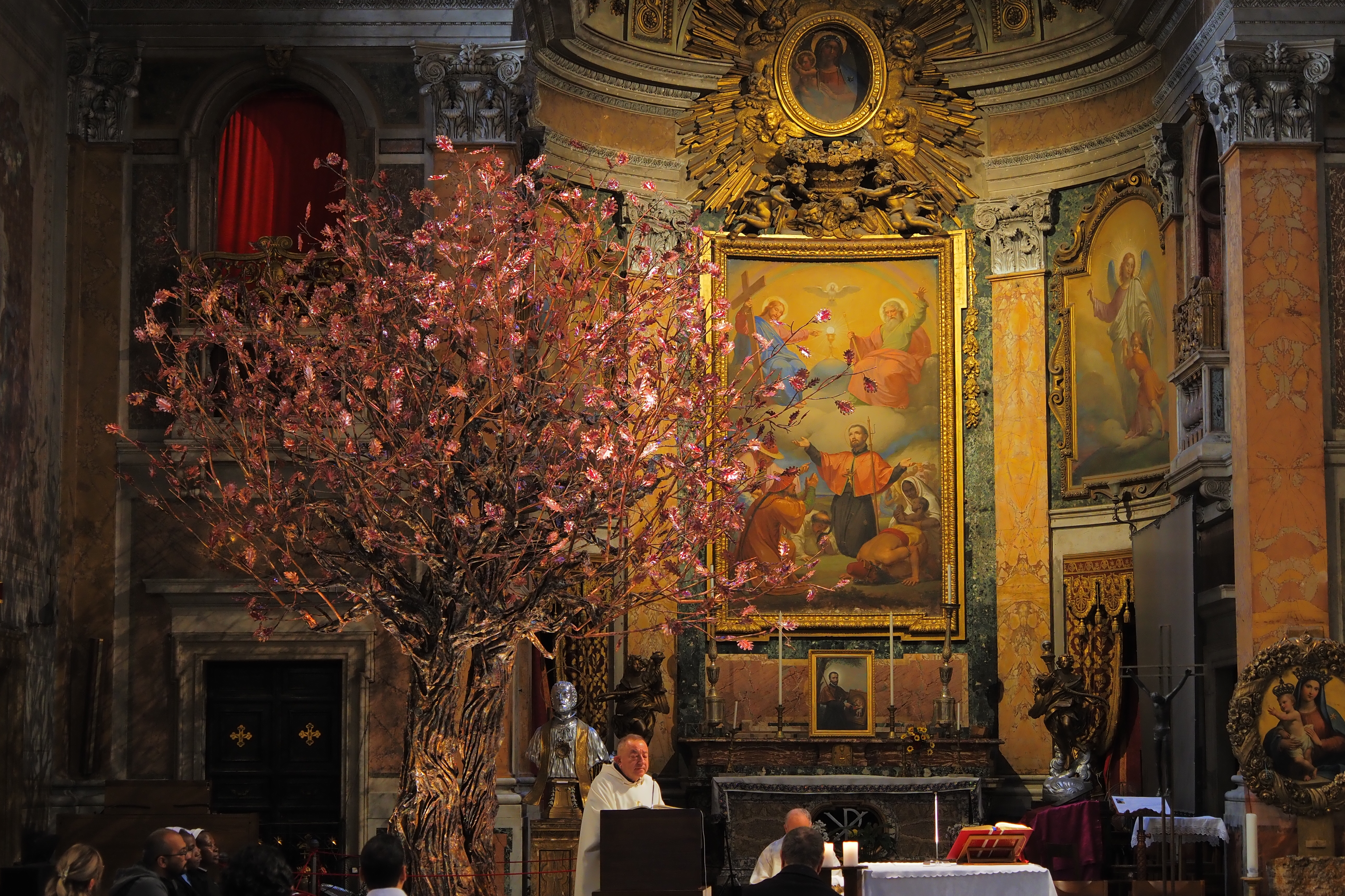 たまたま説教をしている司祭の前に置かれた 銅による現代アート The Oak of Mamre が綺麗だった。