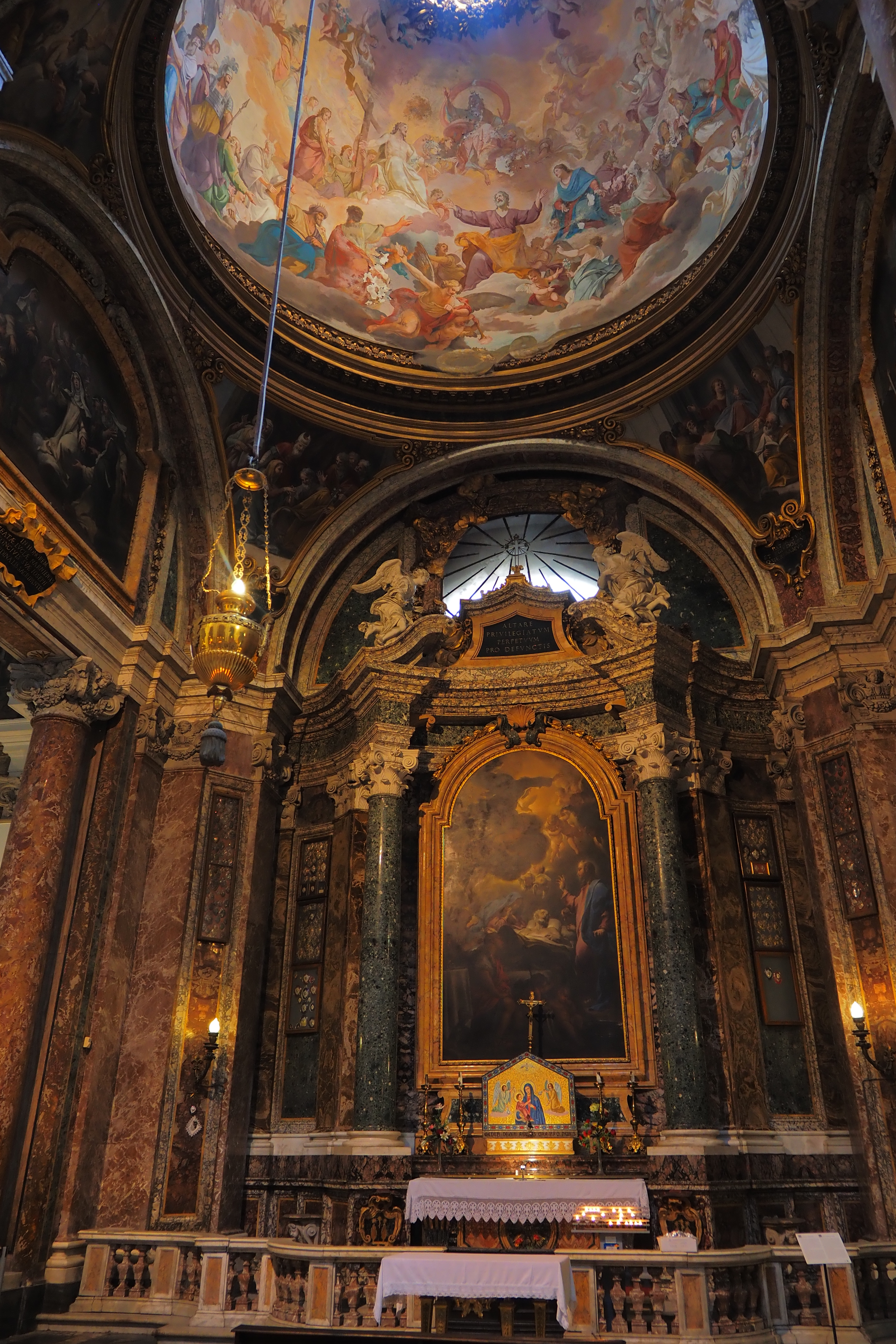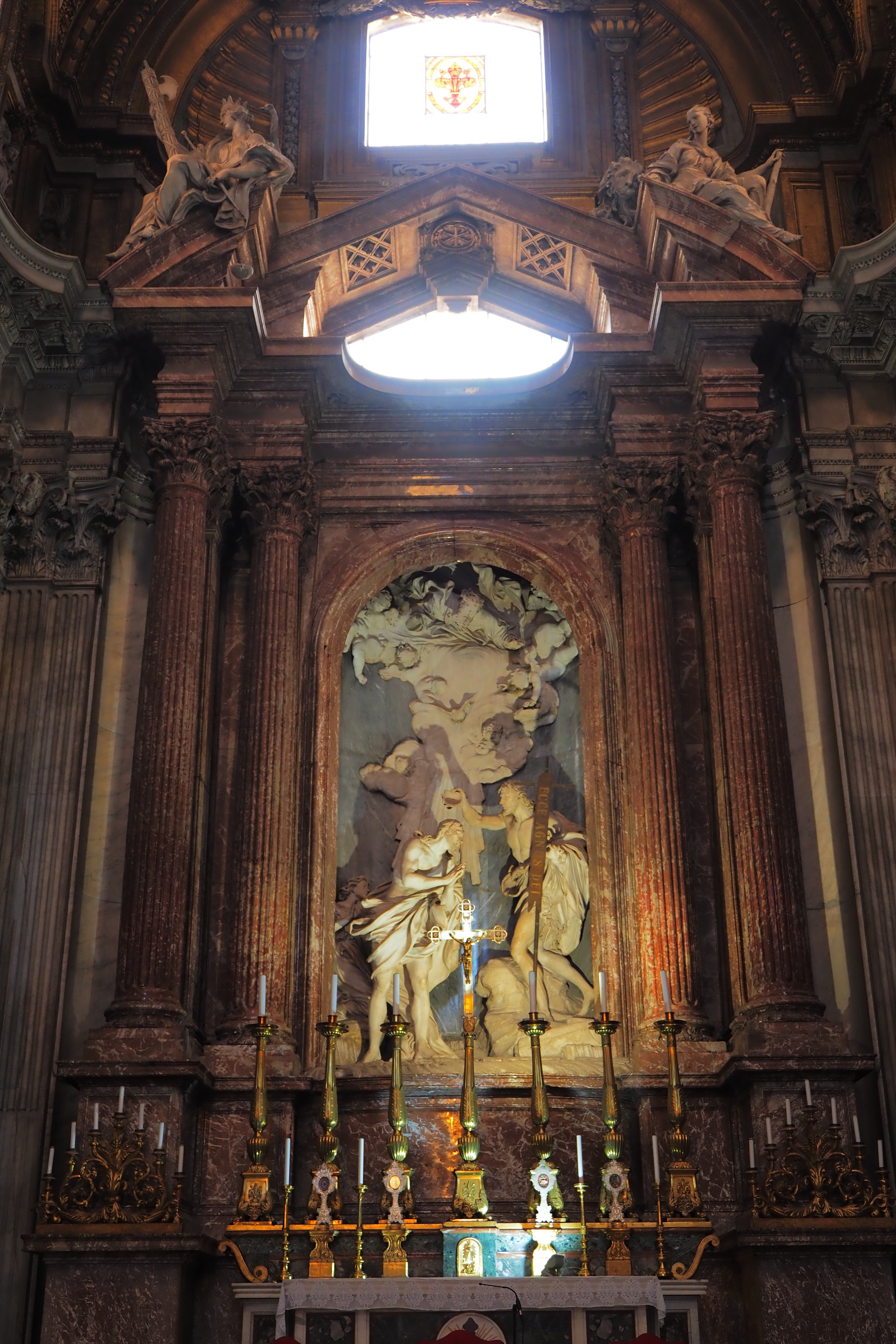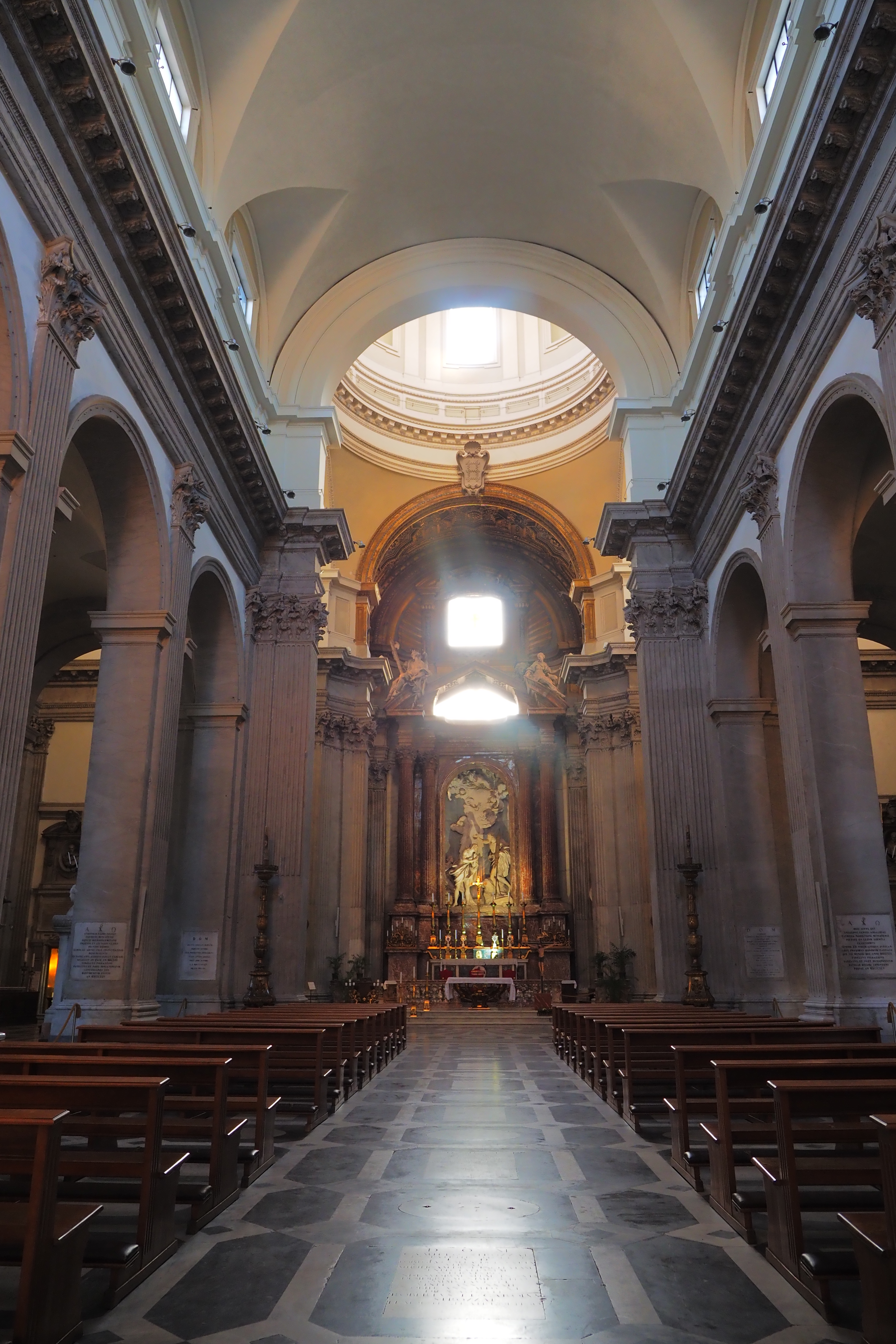 三廊式のラテン十字バシリカ、主身廊と主祭壇。Ercole Antonio Raggi 作のキリストの洗礼を象った彫刻がそのまま主祭壇になってる。