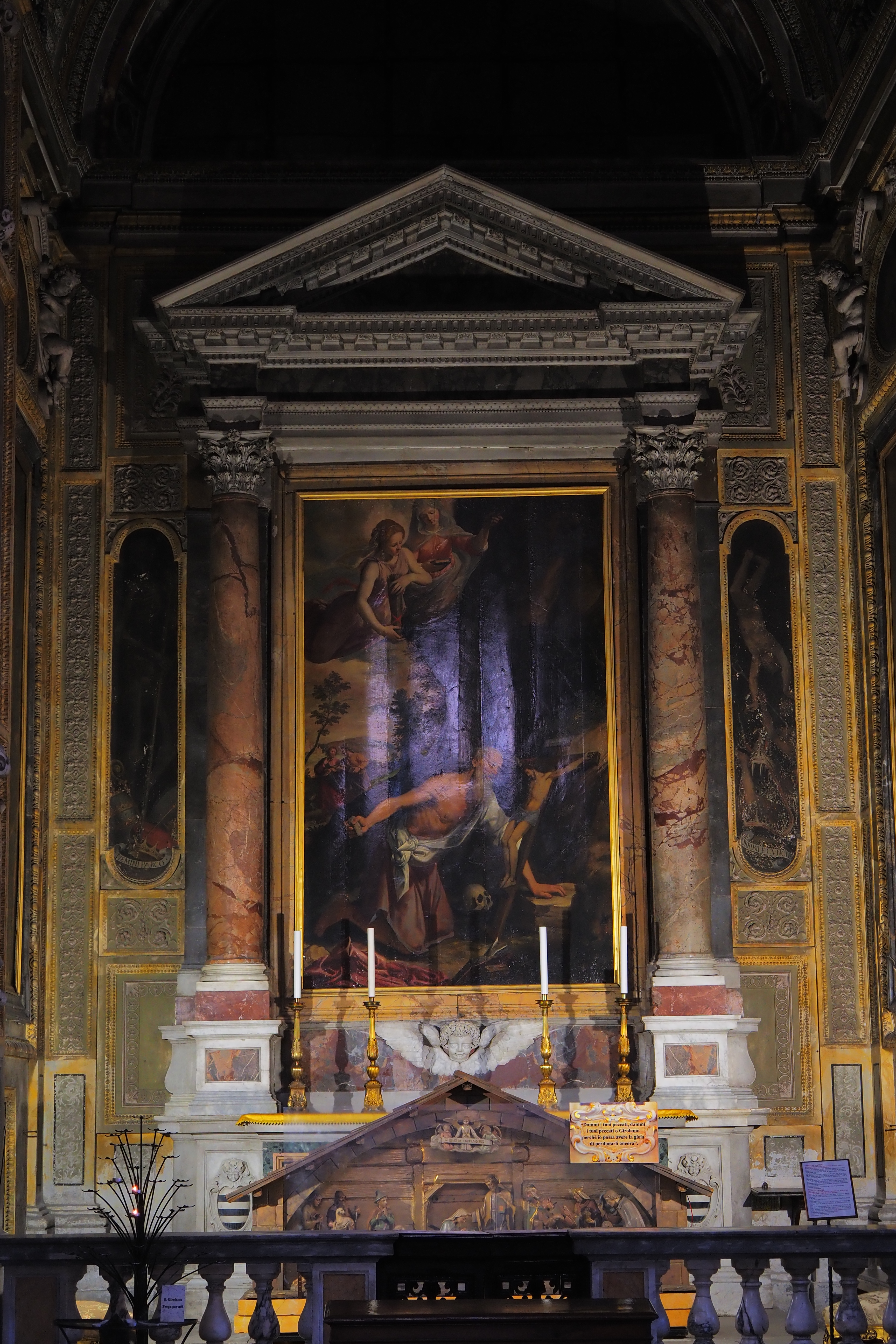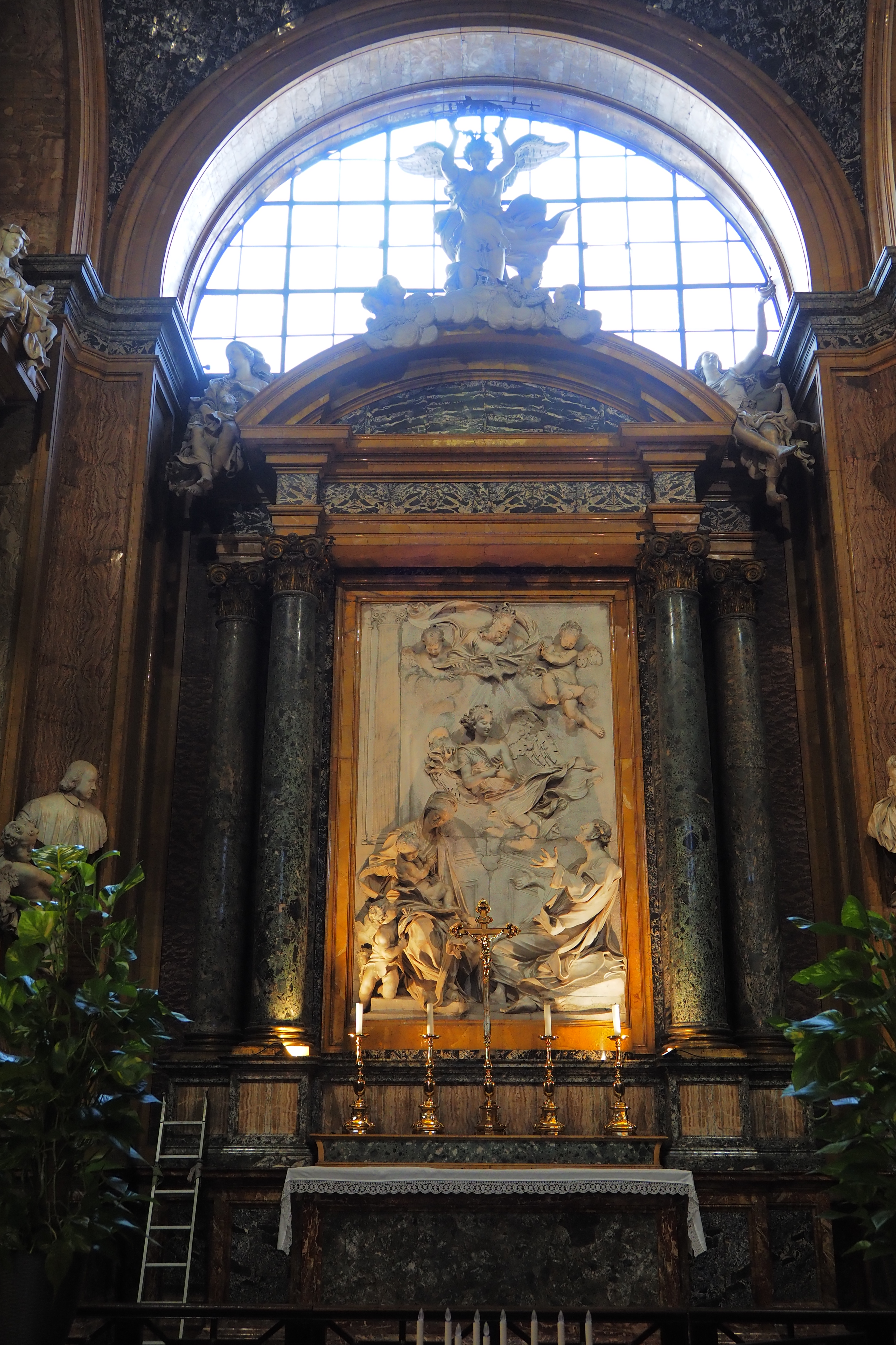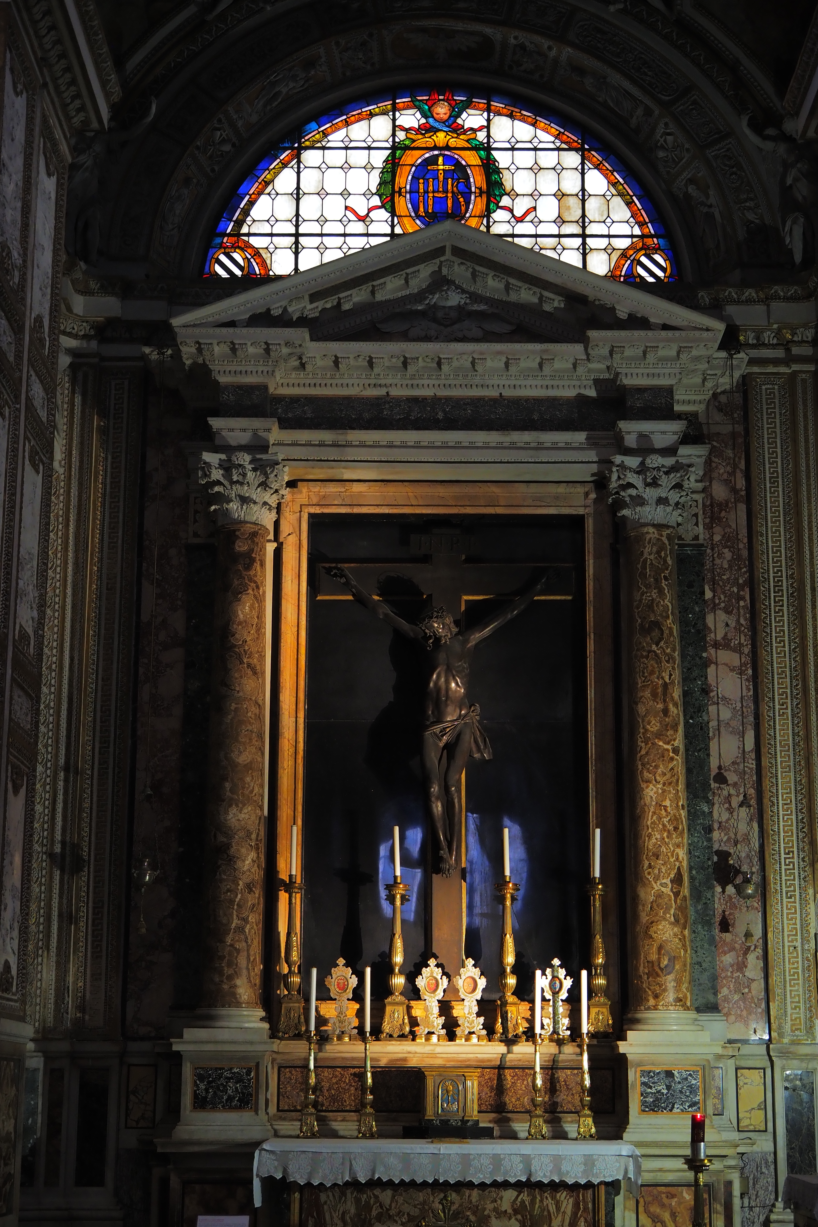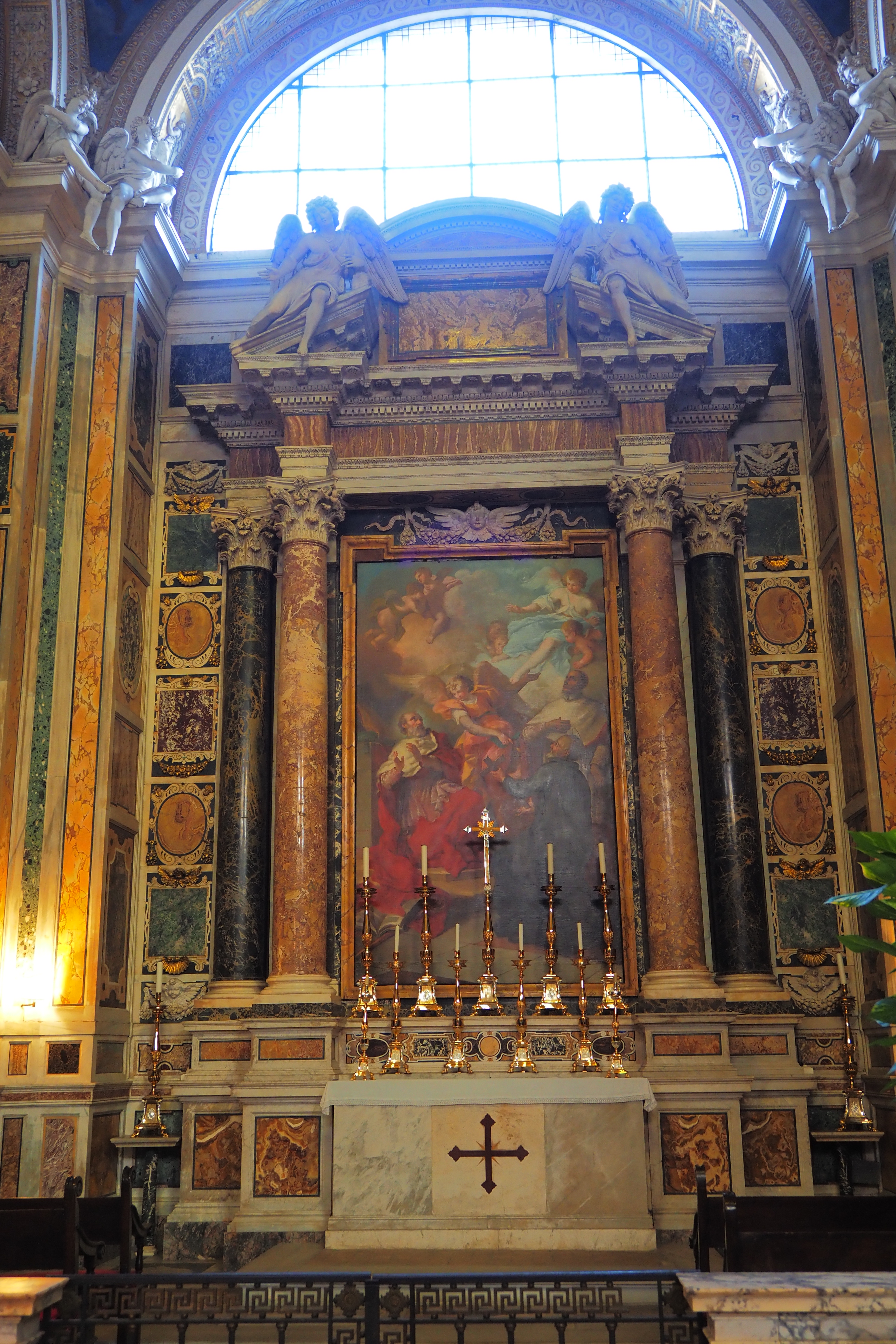 三廊式のラテン十字バシリカ、主身廊と主祭壇。Ercole Antonio Raggi 作のキリストの洗礼を象った彫刻がそのまま主祭壇になってる。