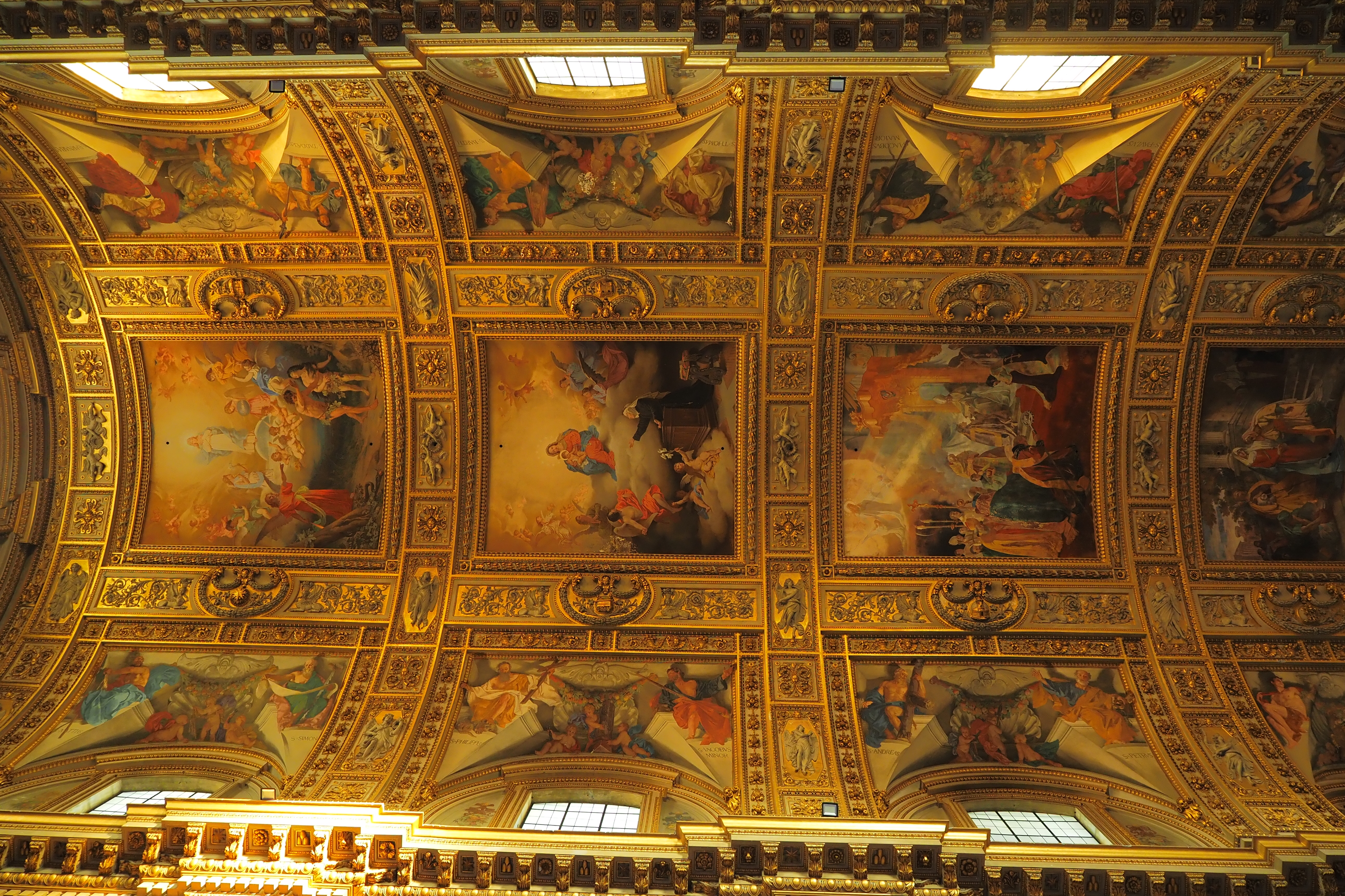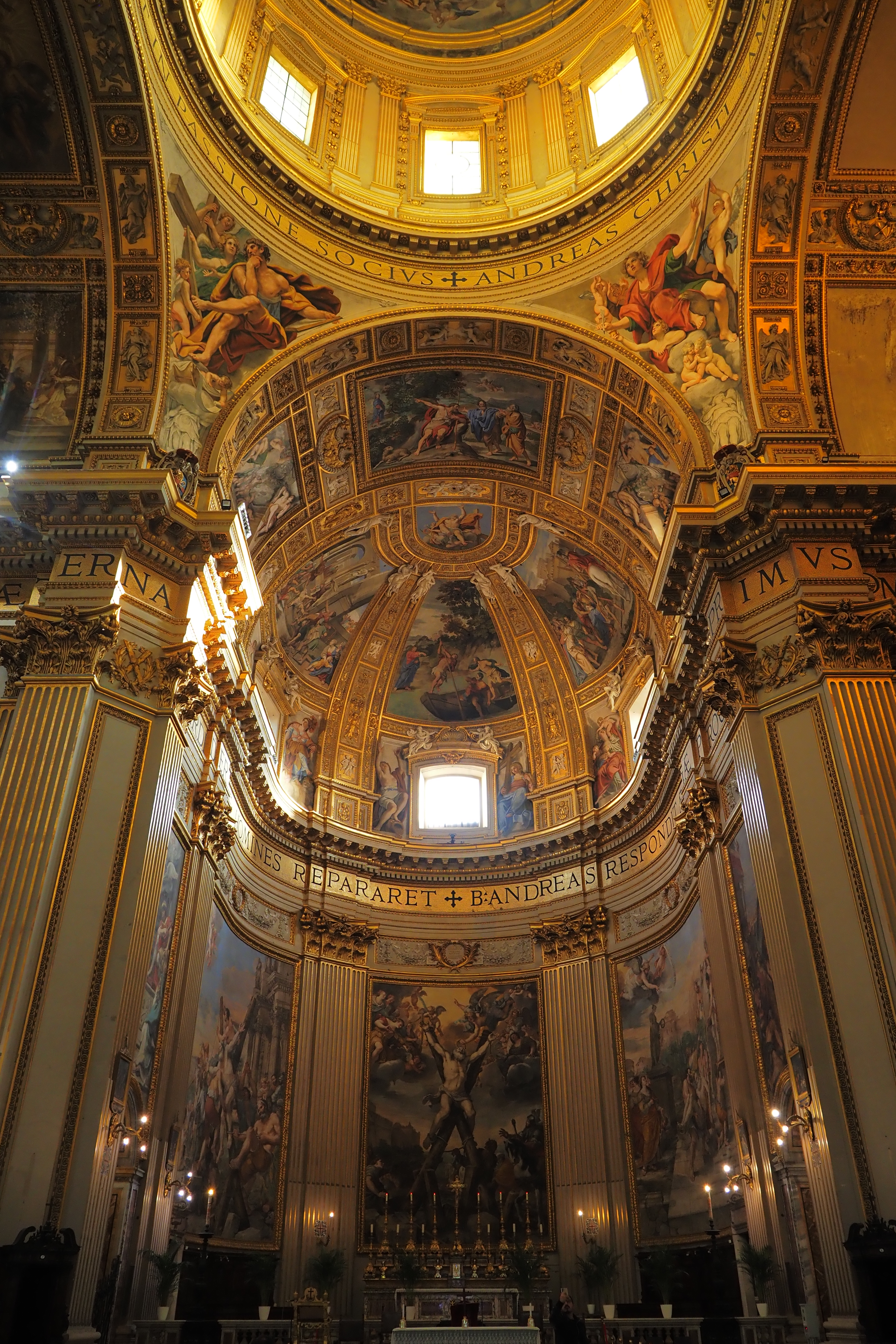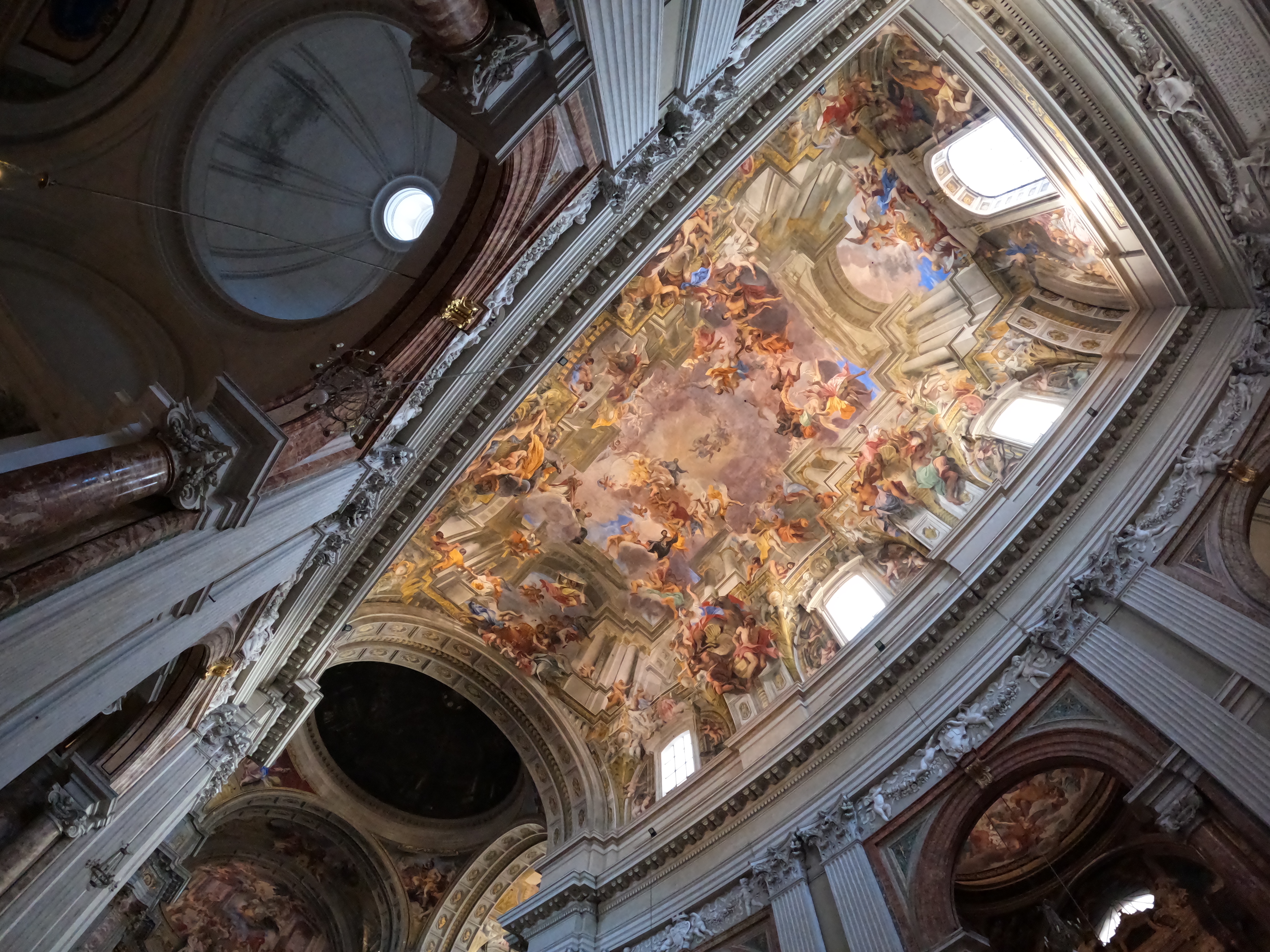 これは Quadratura;直交法 とよばれる錯覚絵画の代表で、実際の構造物と、絵画の中に描かれた構造物がまるで連続しているようになってることから、天井が実際よりも遥か上方につづいているような錯覚を感じるのだ。