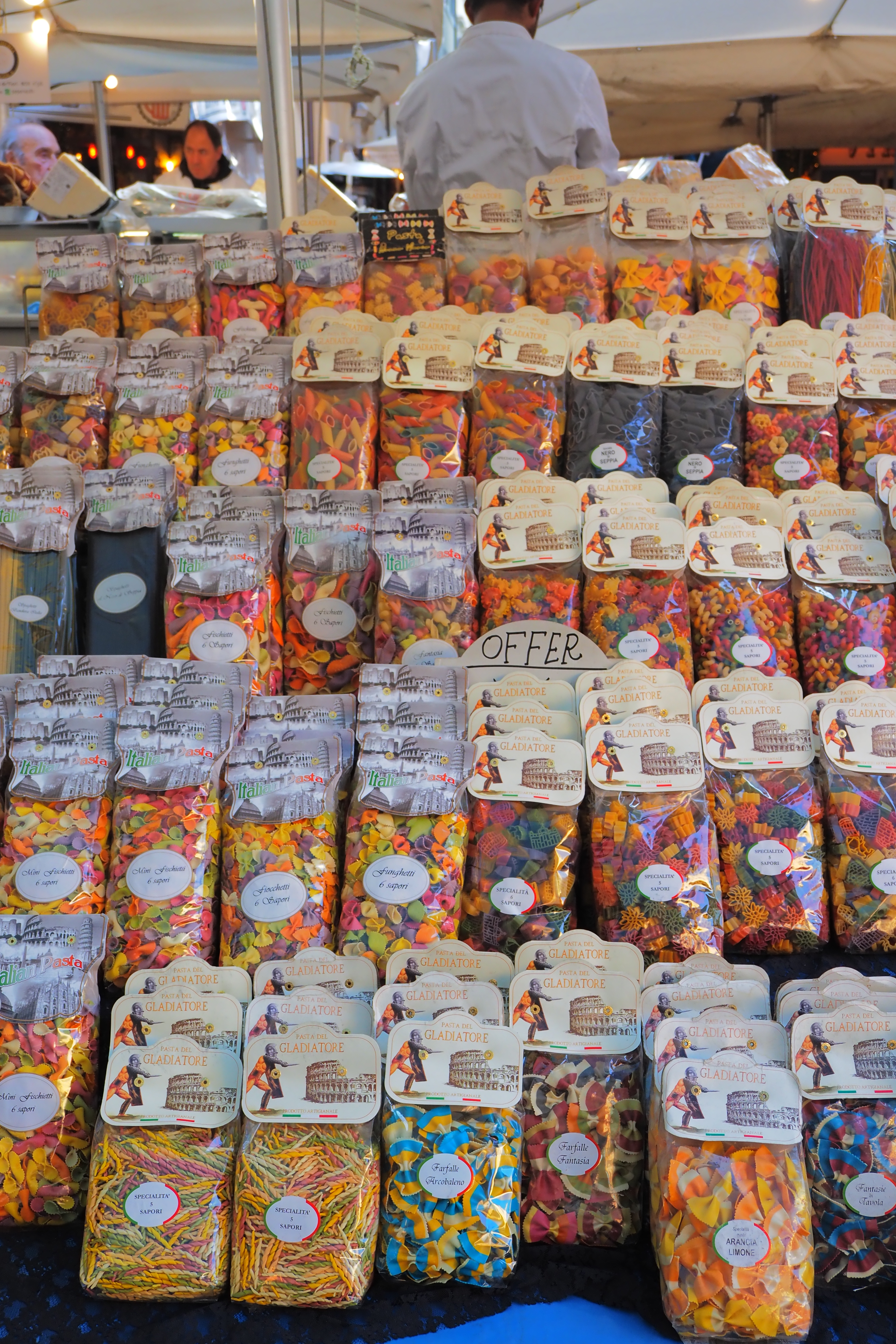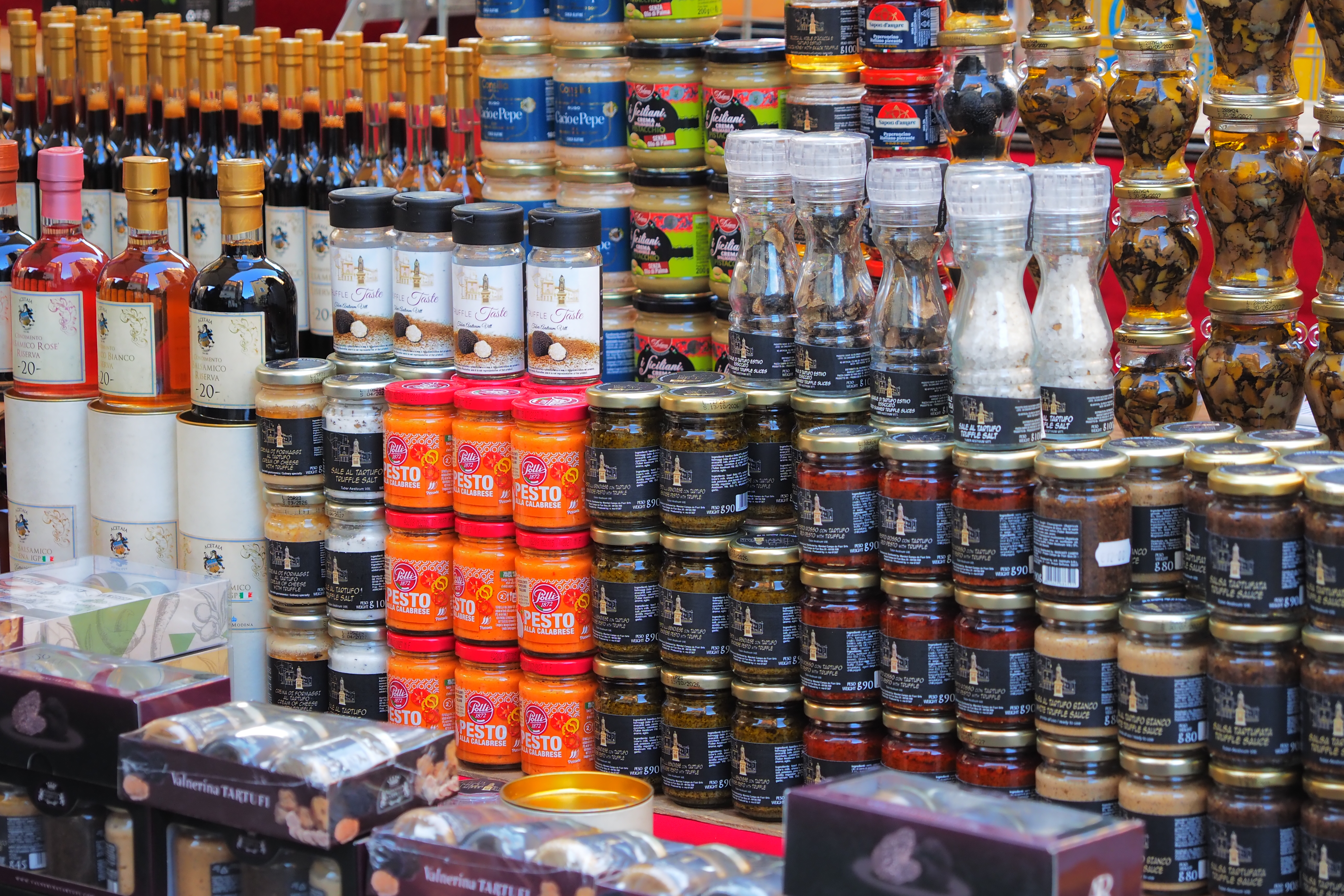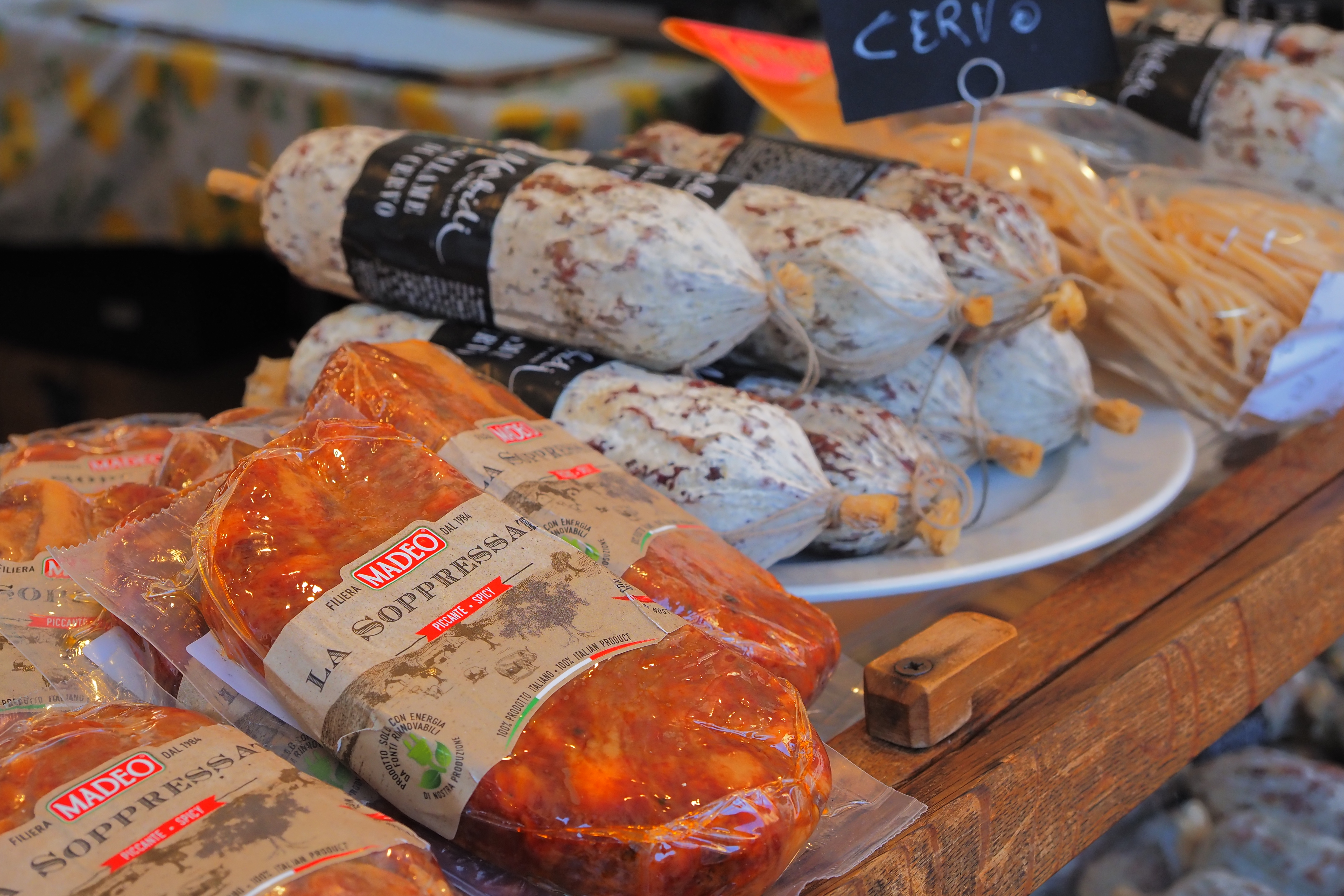 今となっては そんな広場も賑やかな市場で、ち〇こ形の瓶に入ったリキュールはじめ 肉・魚・スパイス・野菜・・・と色とりどりの食材がぎっしり並んでいる。