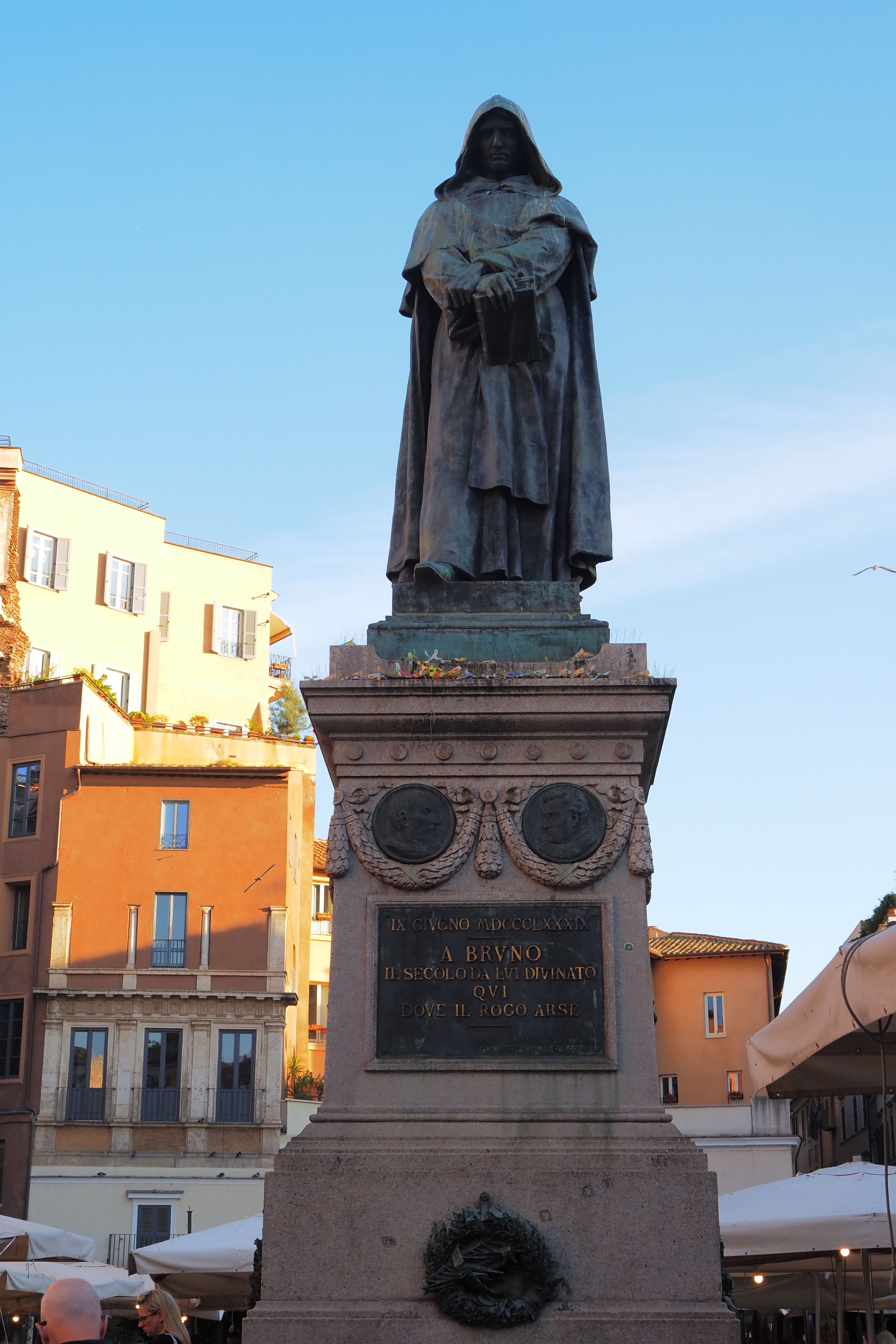 あまり一般的ではないかもしれないけど、カンポ・デ・フィオーリ広場でフードの下に隠れたジョルダーノ・ブルーノの峻厳な眼差しを見るのは、ローマ観光の管理人的おすすめである。