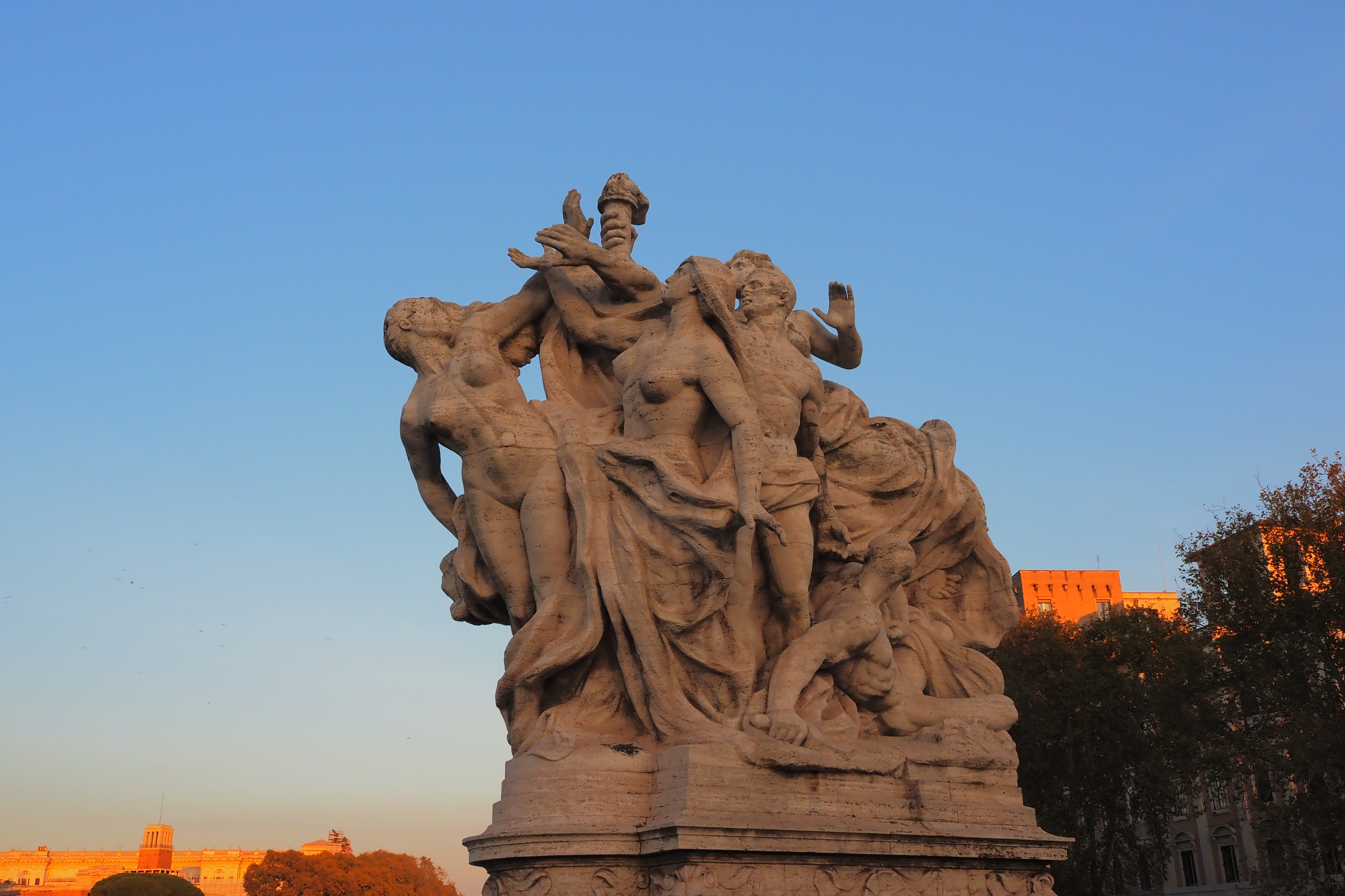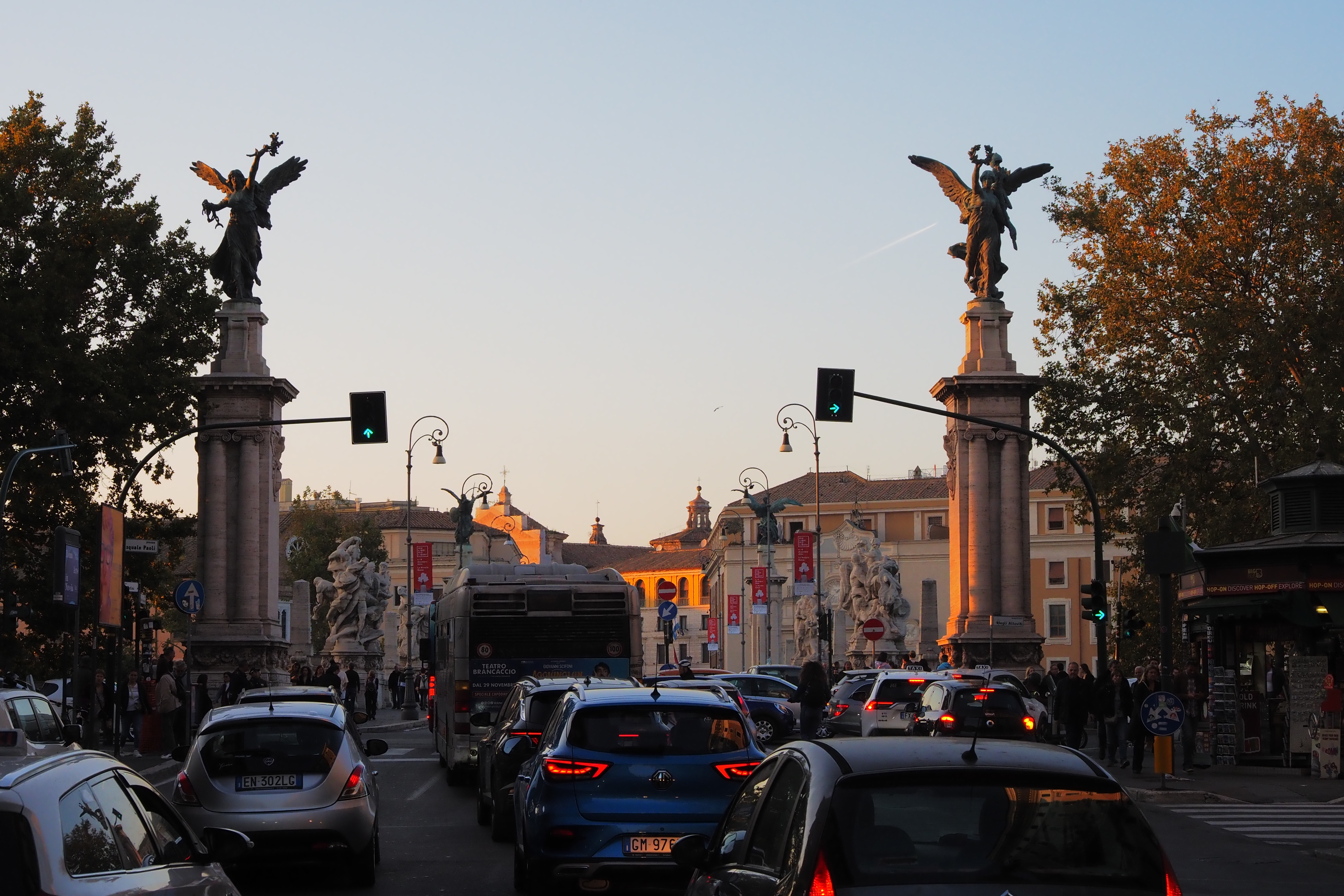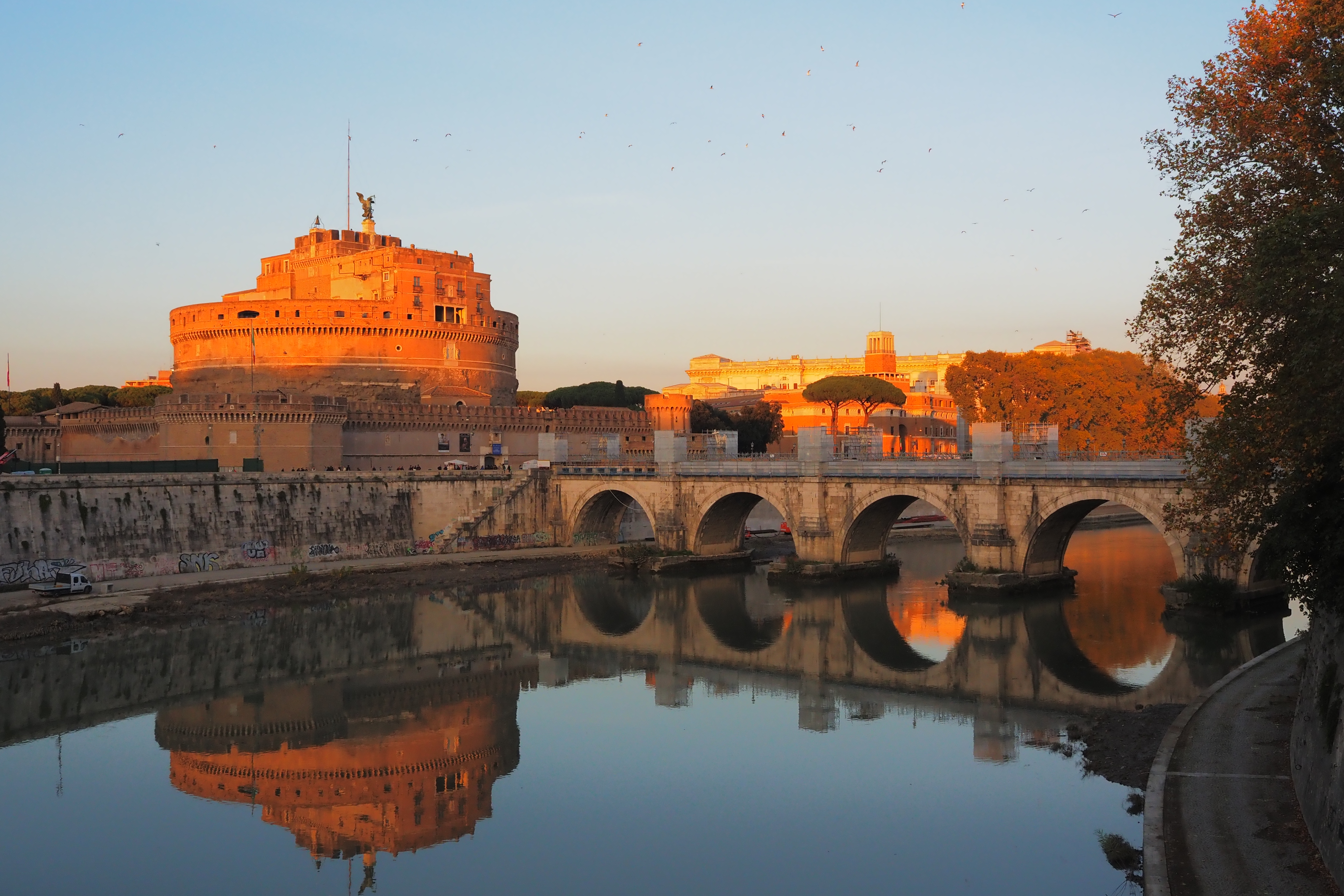東側には Ponte Sant’ Angelo; 聖アンジェロ橋と、その先の Castel Sant’ Angelo; 聖アンジェロ城が Tevere; テヴェレ川に反射している。