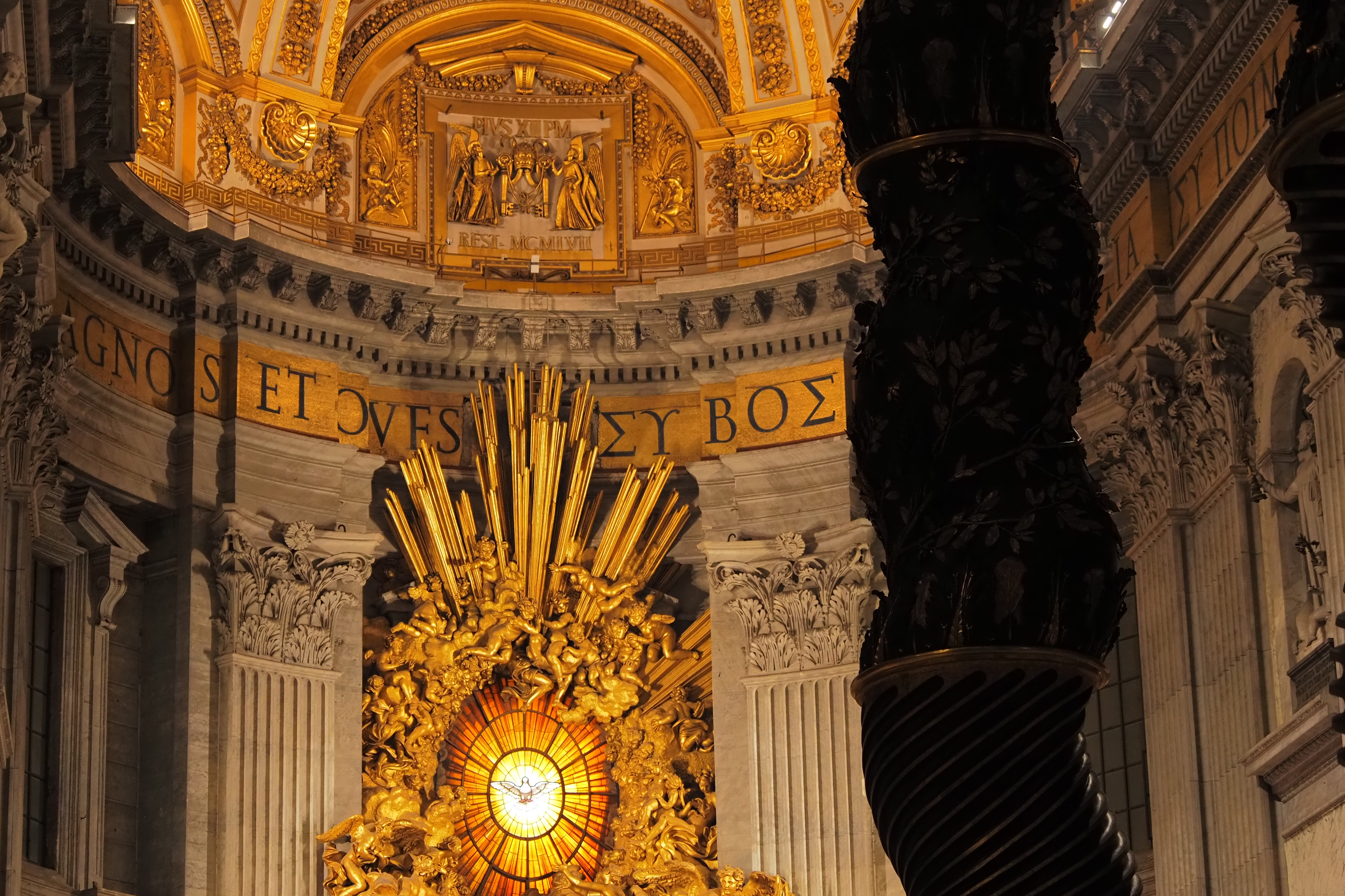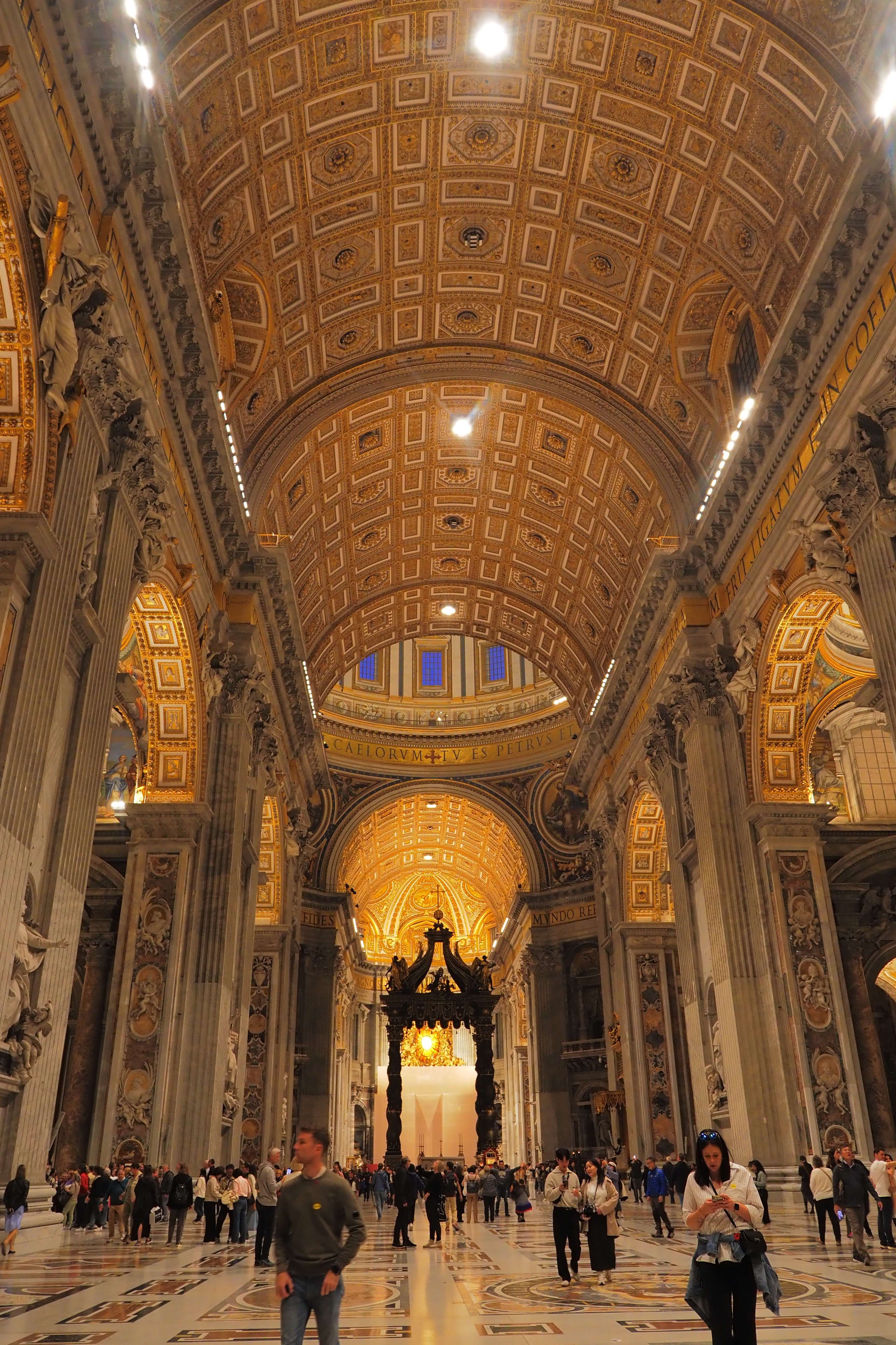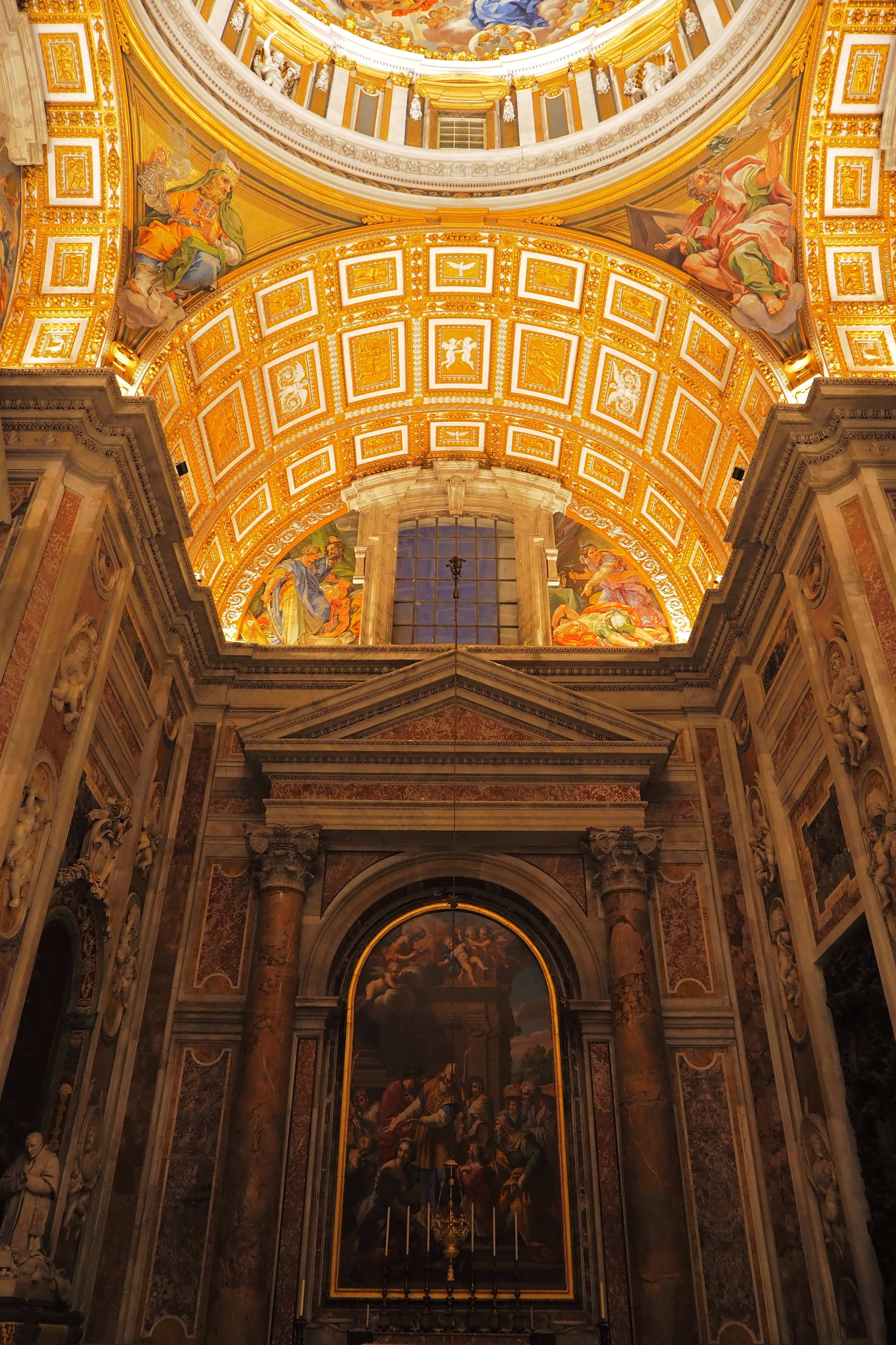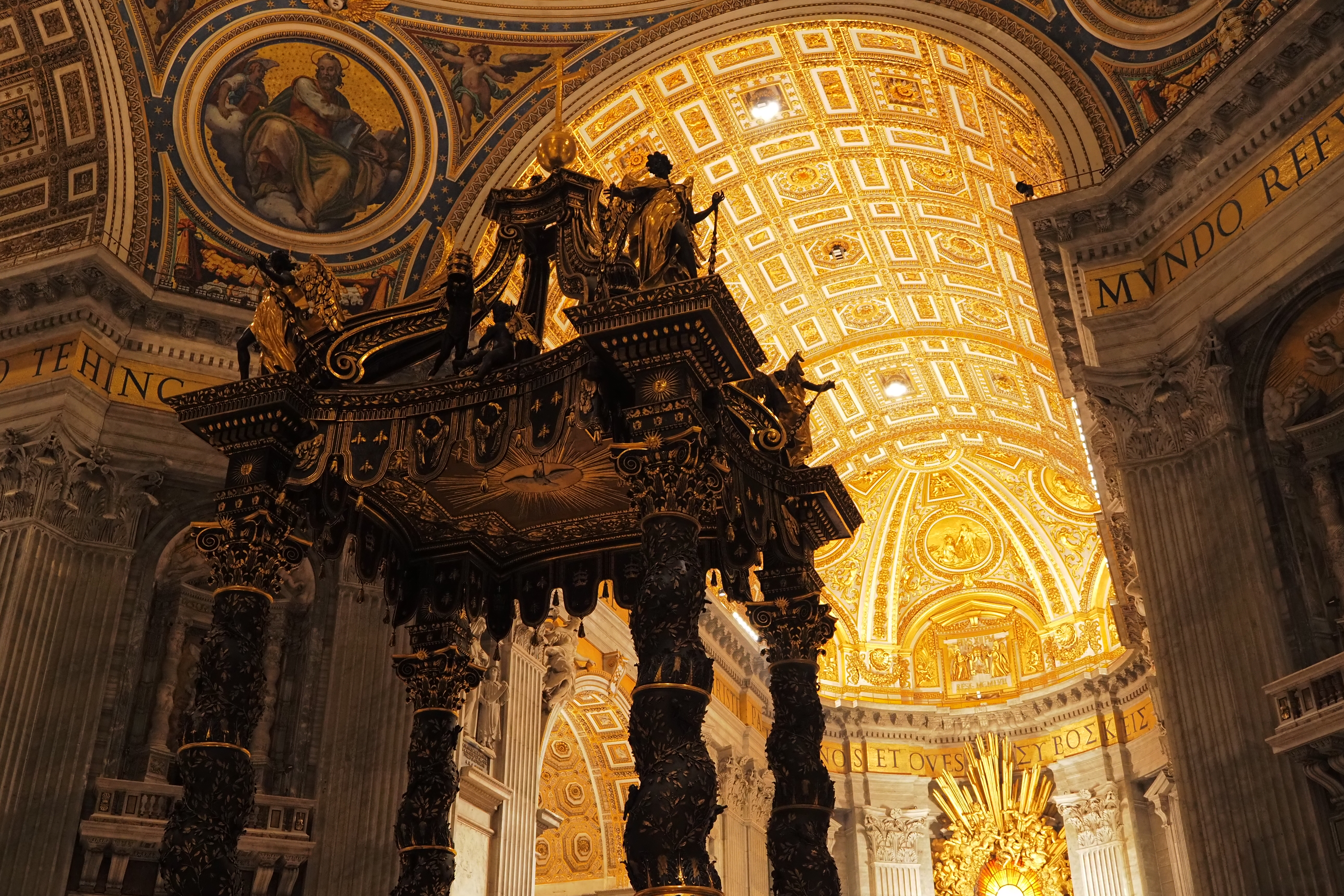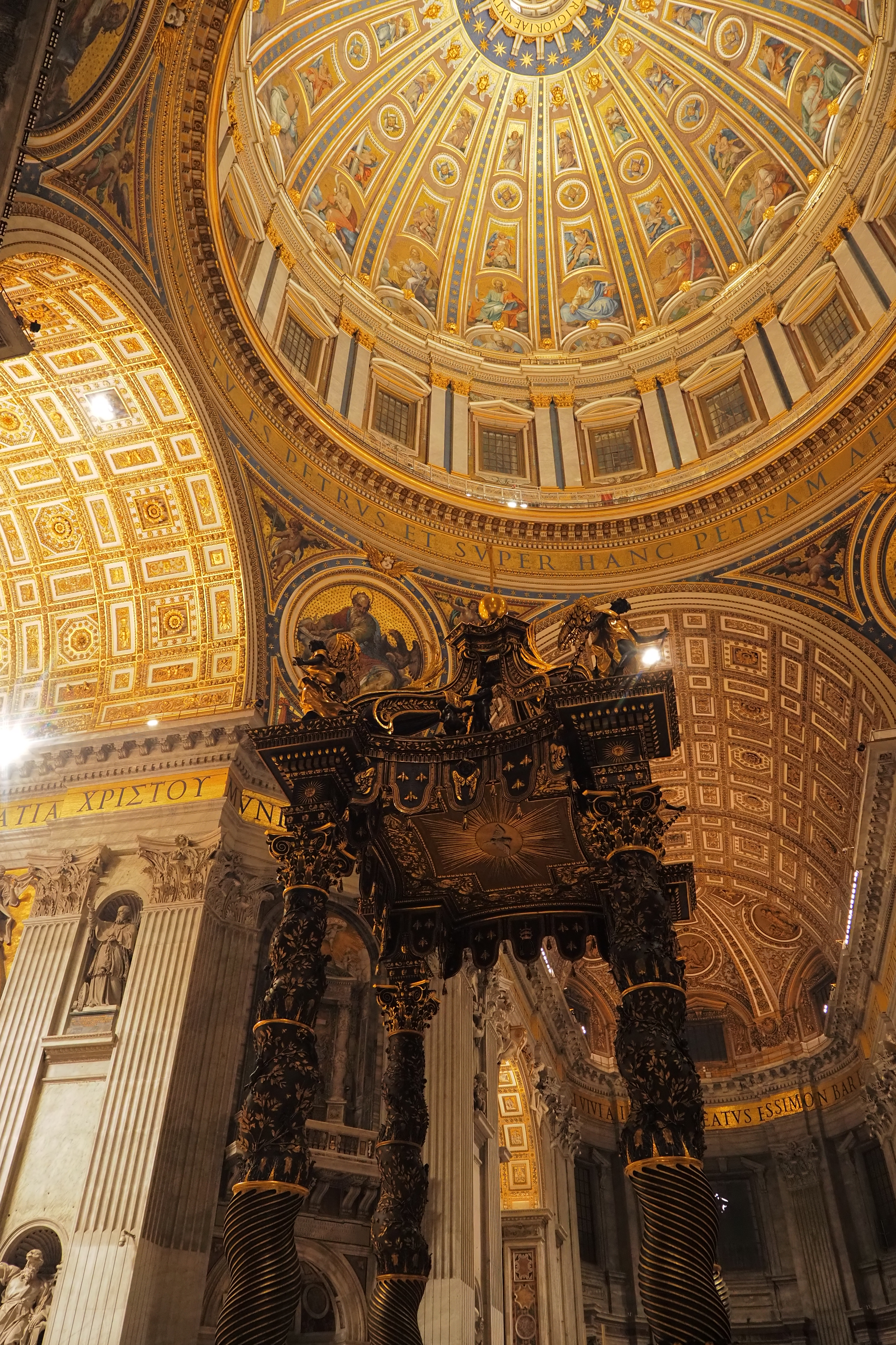 独特のねじれ構造をした4本の柱は「ソロモンの柱」とよばれて、黄金に輝く聖堂内で異質な黒々としたブロンズは凄まじい存在感を放ってる。高さは29mにも及んで、製造につかわれた真鍮材の一部は先のパンテオンの軒の一部から剥がされたという逸話もある。