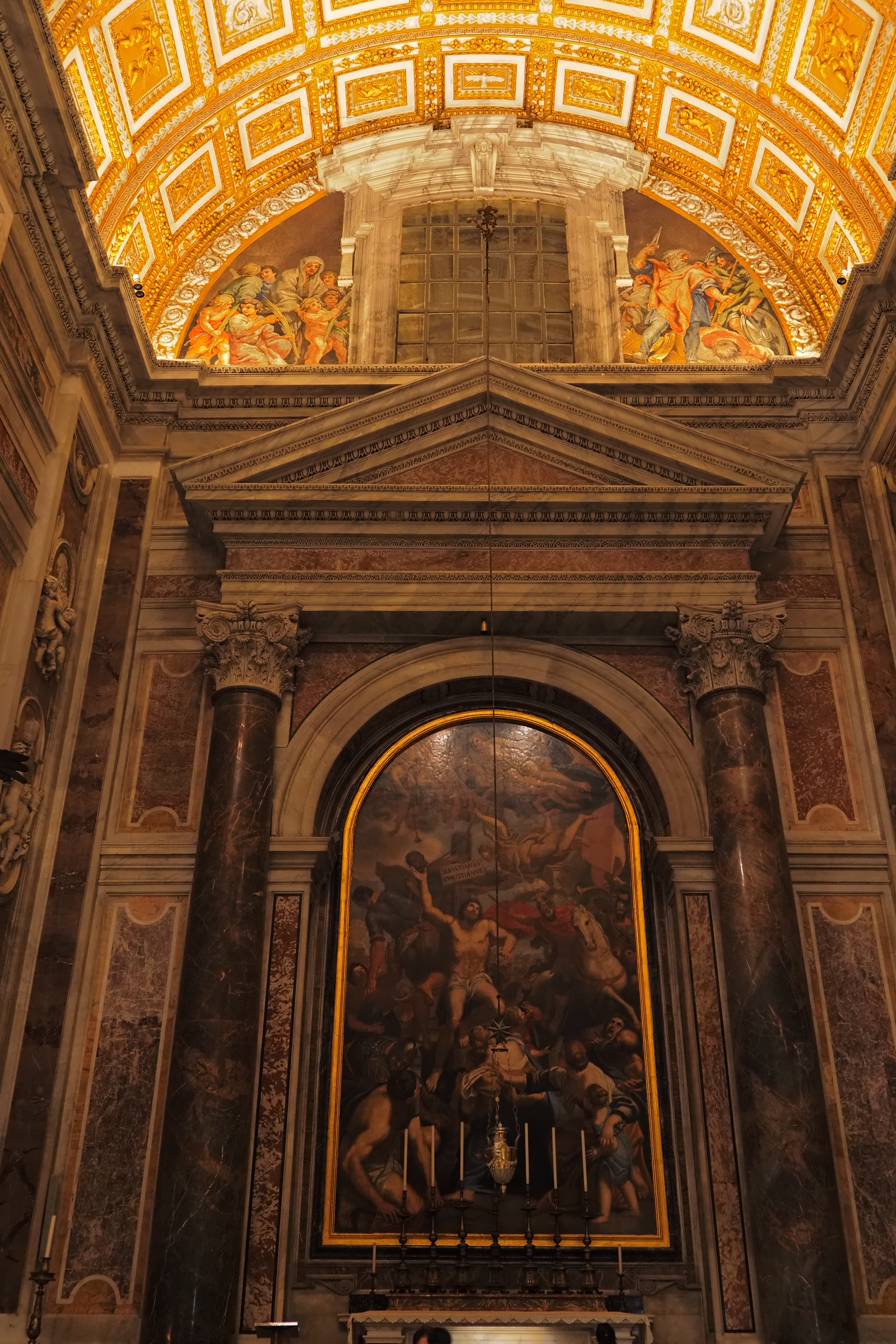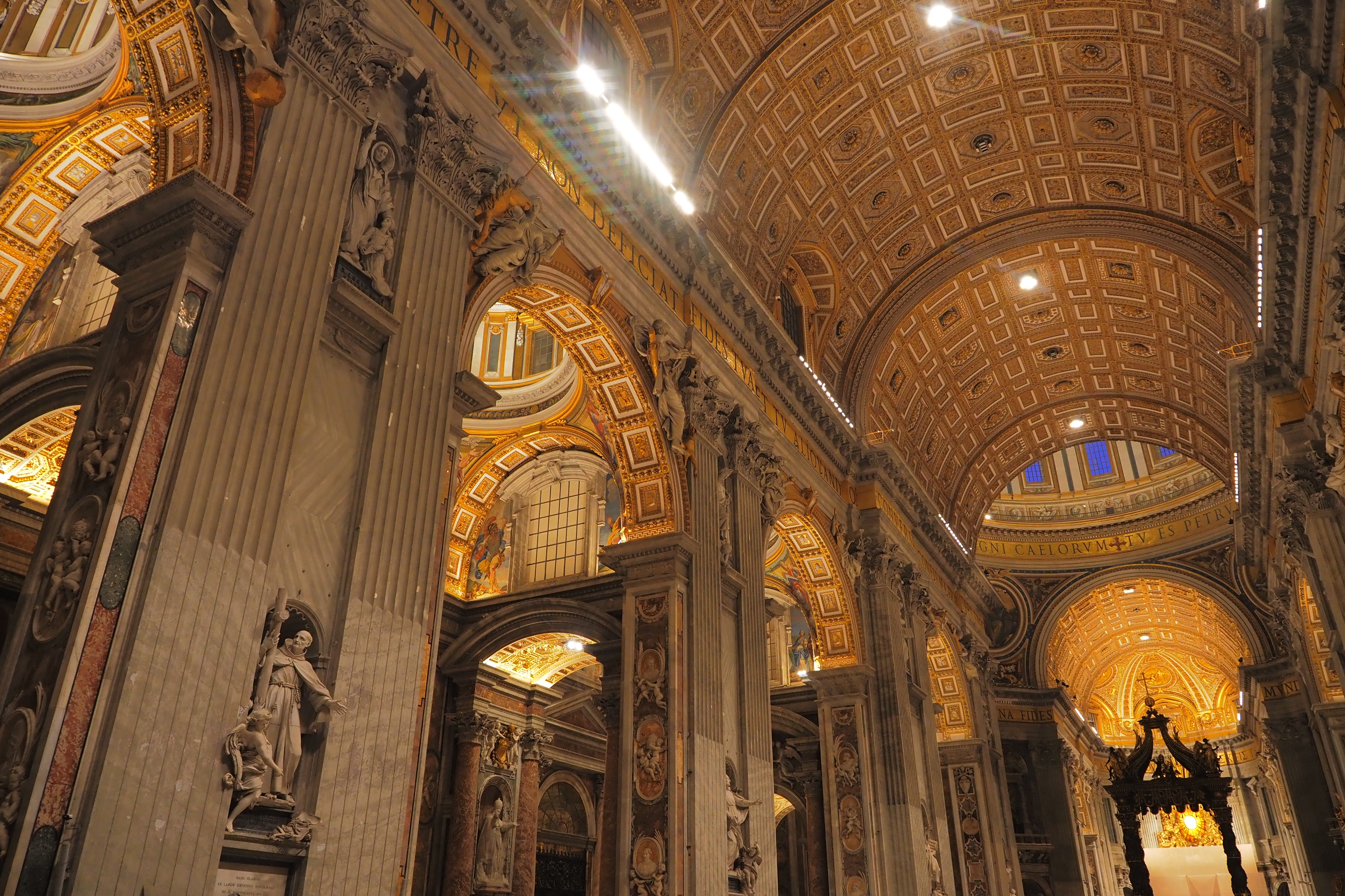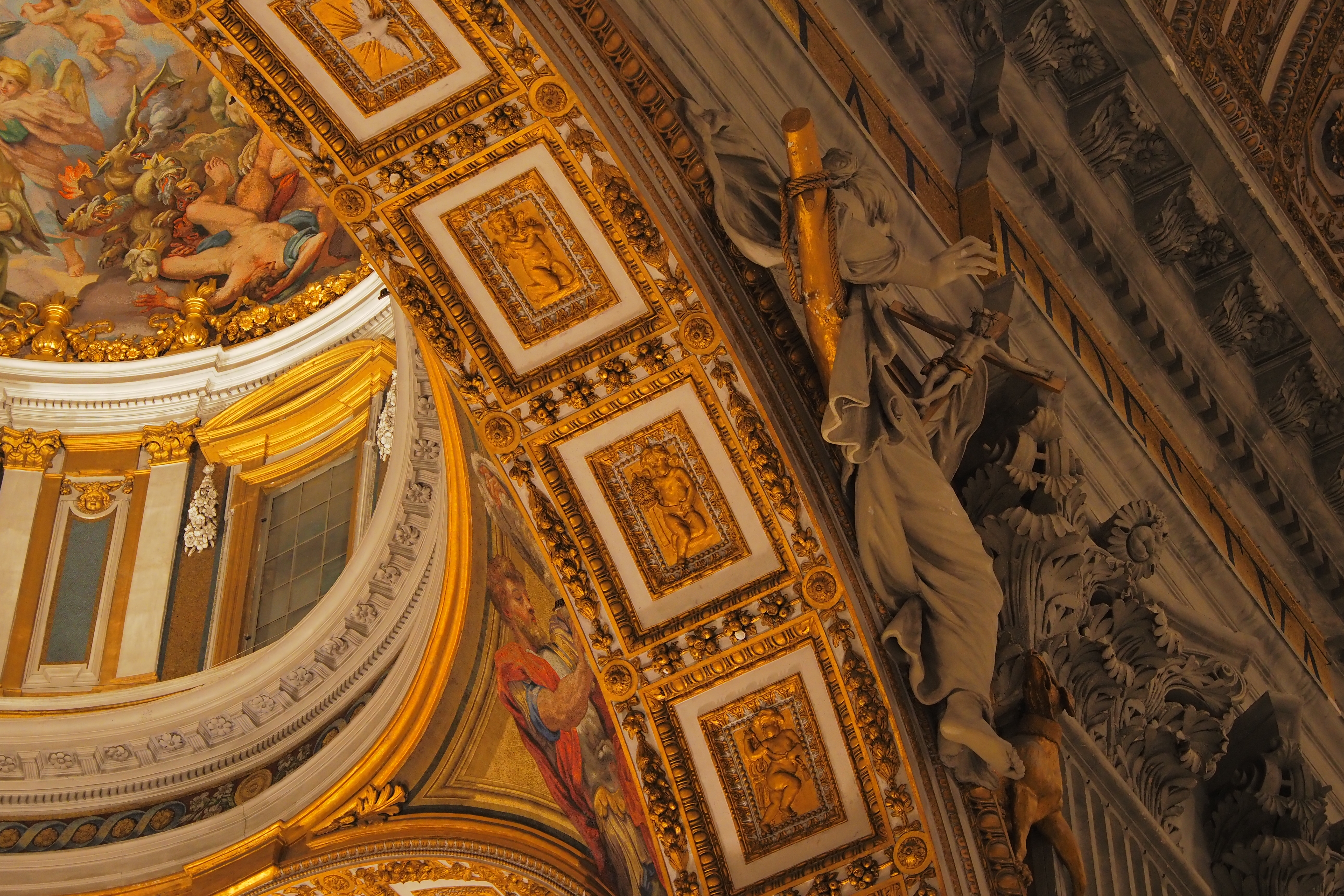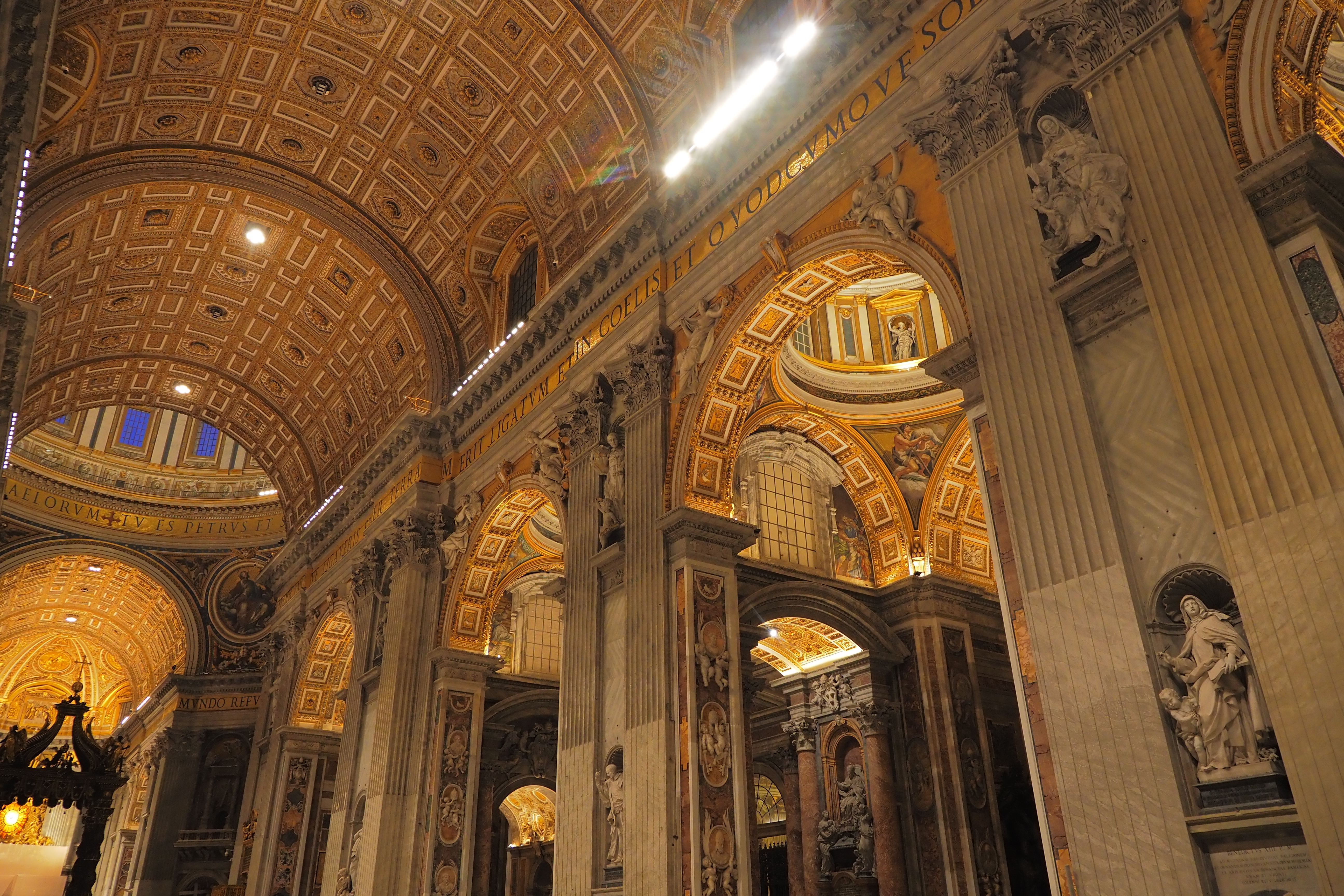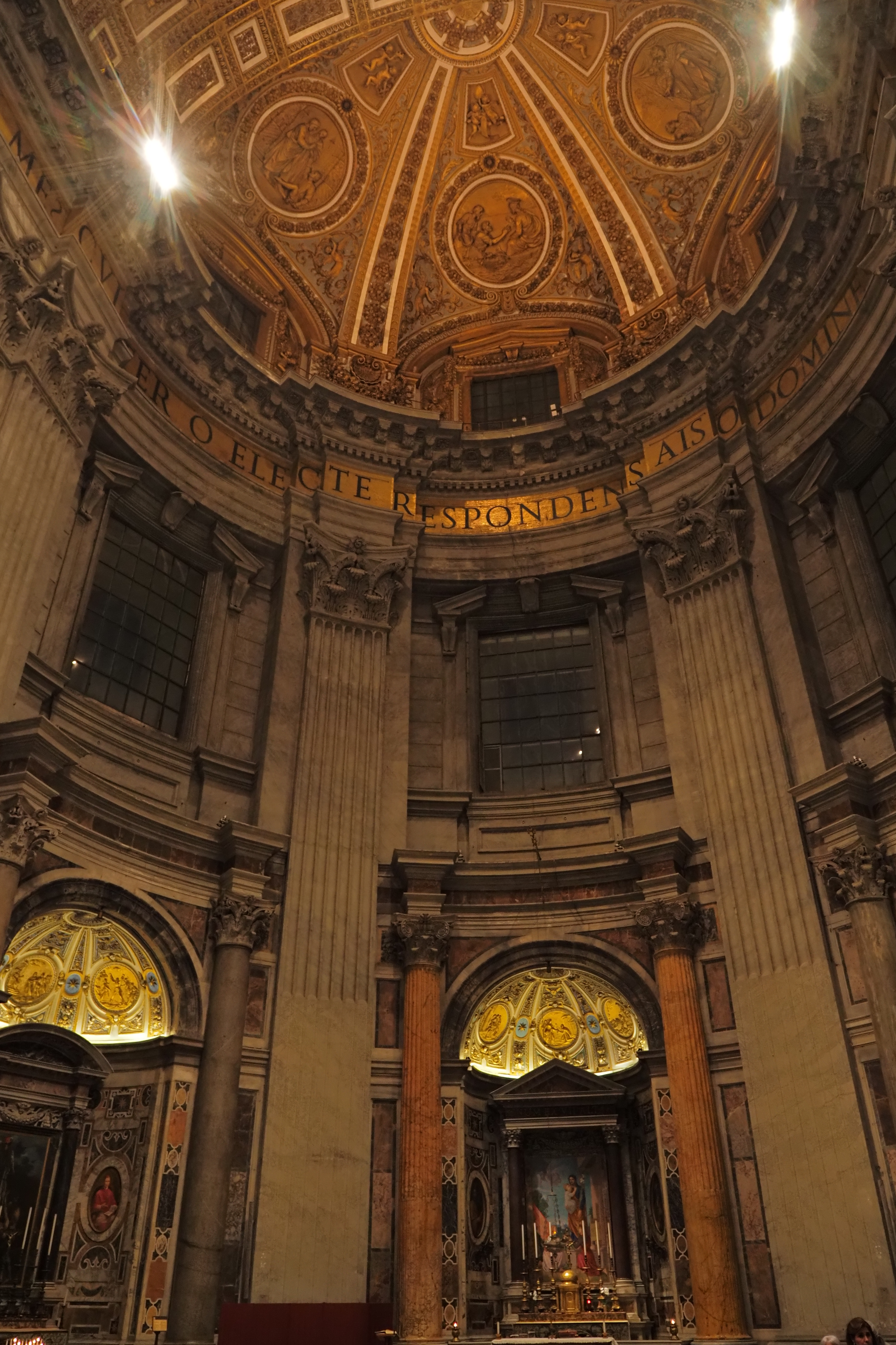 独特のねじれ構造をした4本の柱は「ソロモンの柱」とよばれて、黄金に輝く聖堂内で異質な黒々としたブロンズは凄まじい存在感を放ってる。高さは29mにも及んで、製造につかわれた真鍮材の一部は先のパンテオンの軒の一部から剥がされたという逸話もある。