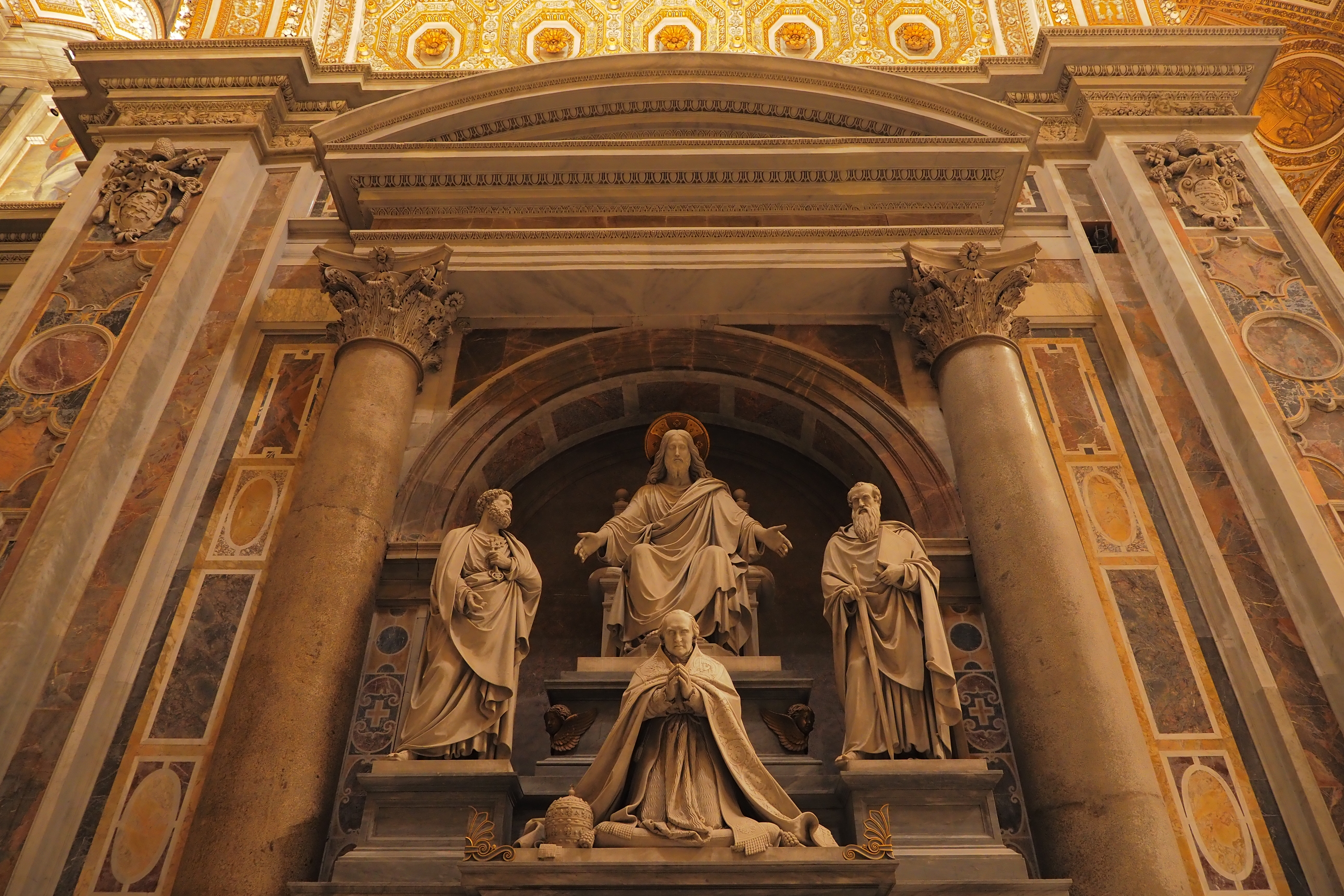 サンピエトロ大聖堂の地下には1世紀に遡るネクロポリスが広がっていて、このバルダッキーノの真下には使徒ペテロの墓があるとされている。本来、教会の主祭壇は東側を向くのが習わしだけど、地図で見ると分かる通り、サンピエトロ大聖堂のそれは真逆の西北西を向いてる。これは、東側に主祭壇を向けるという習わしよりも、ペテロの墓の位置を優先して設計されたためだ。