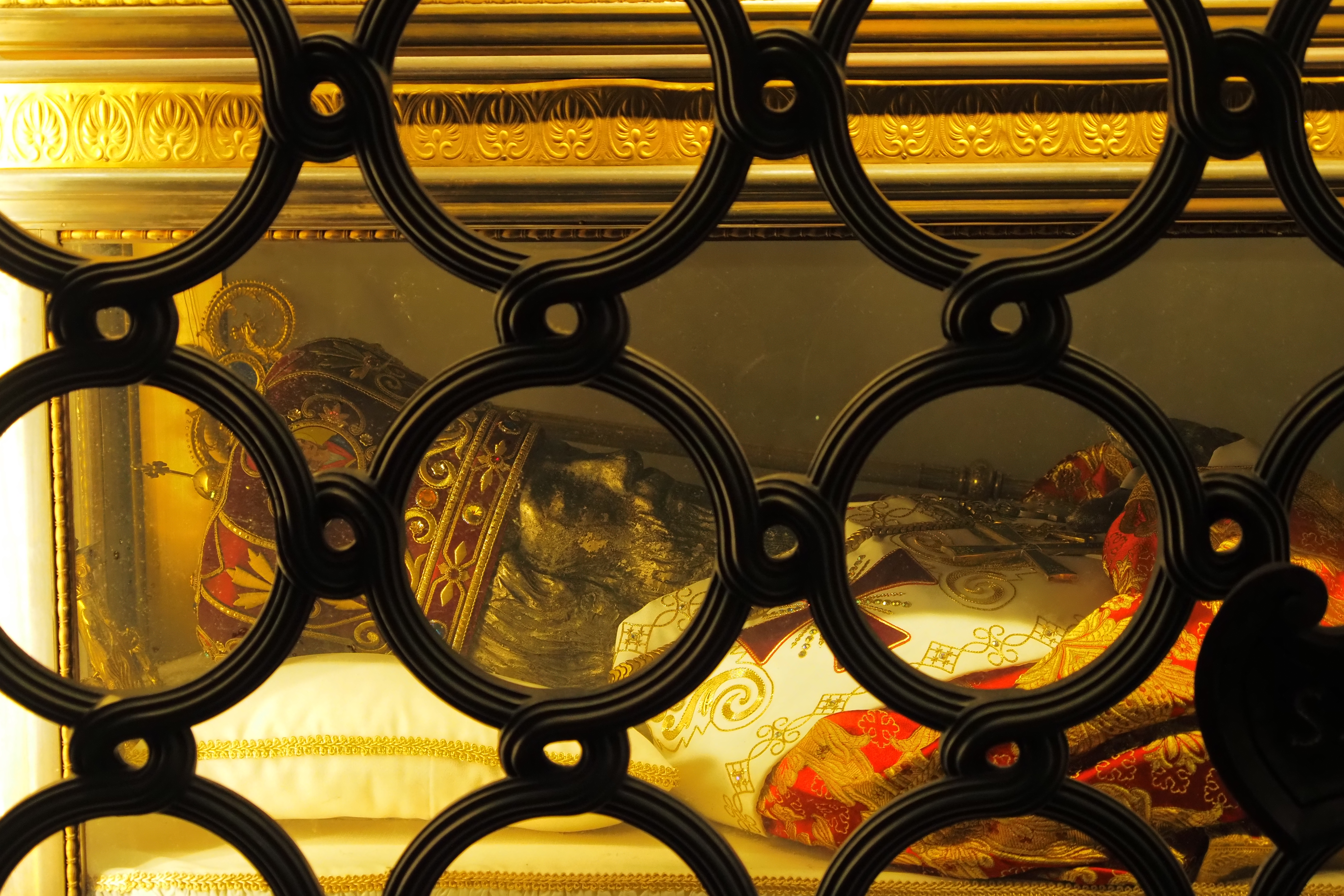 ガラスケース内に安置された St. Josaphat Kuntsevych の遺体。顔にはマスクがつけられて遺体は腐敗しない不朽体として扱われているけど、実際には保存処理が施されている可能性が高い。聖堂内には他にも複数の教皇の遺体が安置されている。