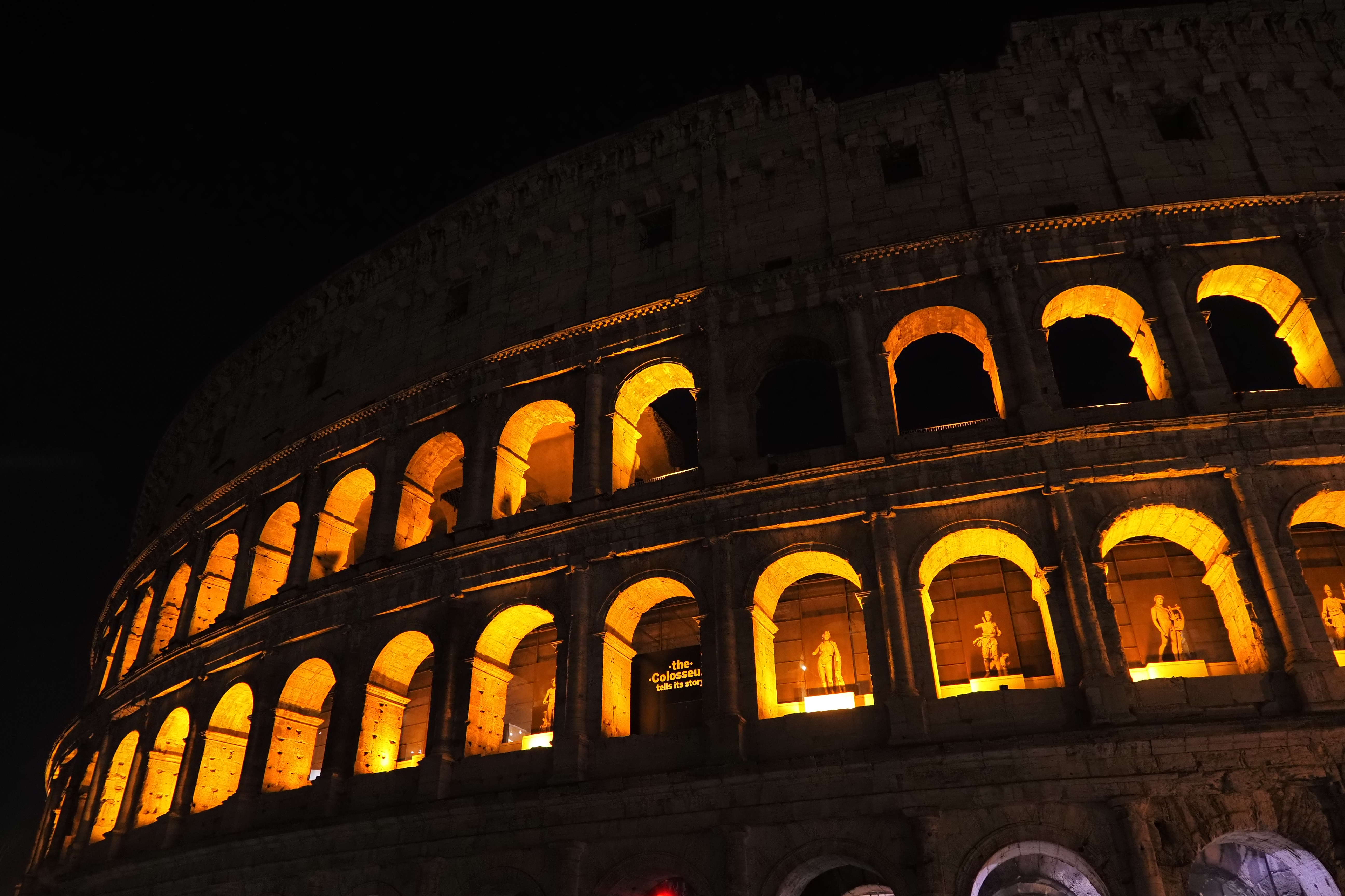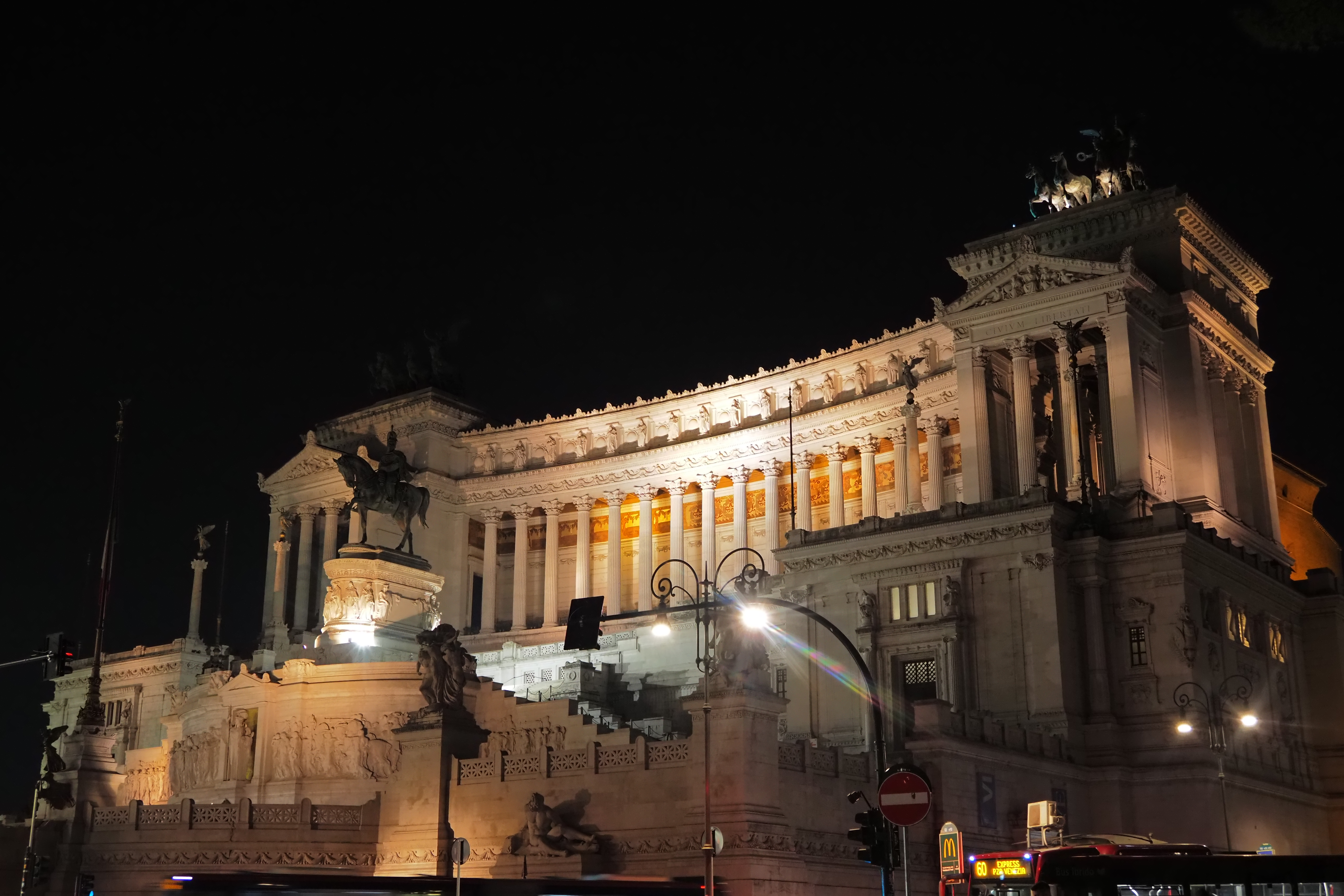 夜になってライトアップされたヴィットリオ・エマニュエーレ2世像と、コロッセオをちら見しつつ、