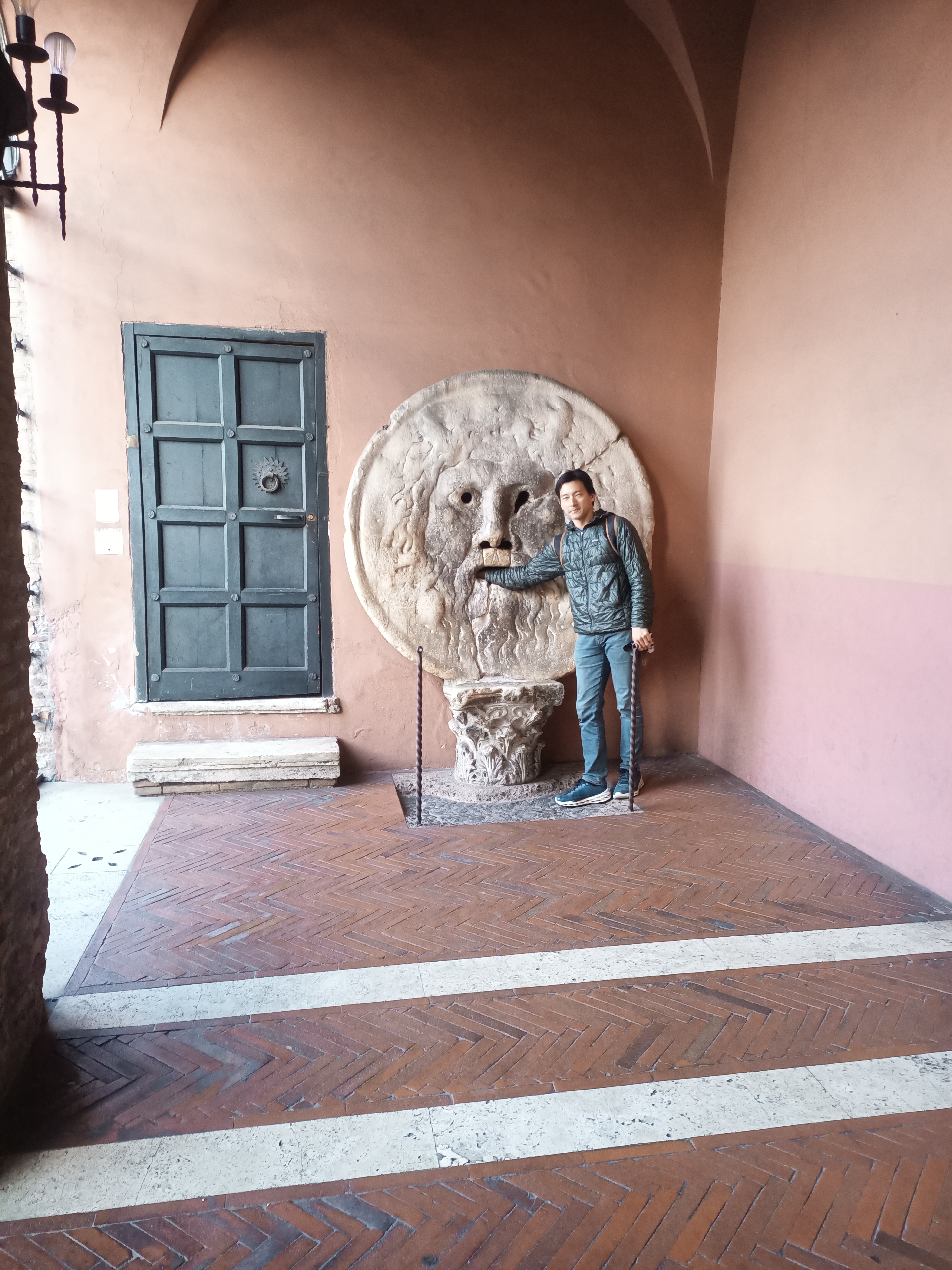 さて、いろいろ調べてはみたものの、この Basilica di Santa Maria in Cosmedin で一番有名なものといえば、教会西側の外ナルテックスに安置されたこれ! Bocca della Verità ; 真実の口!