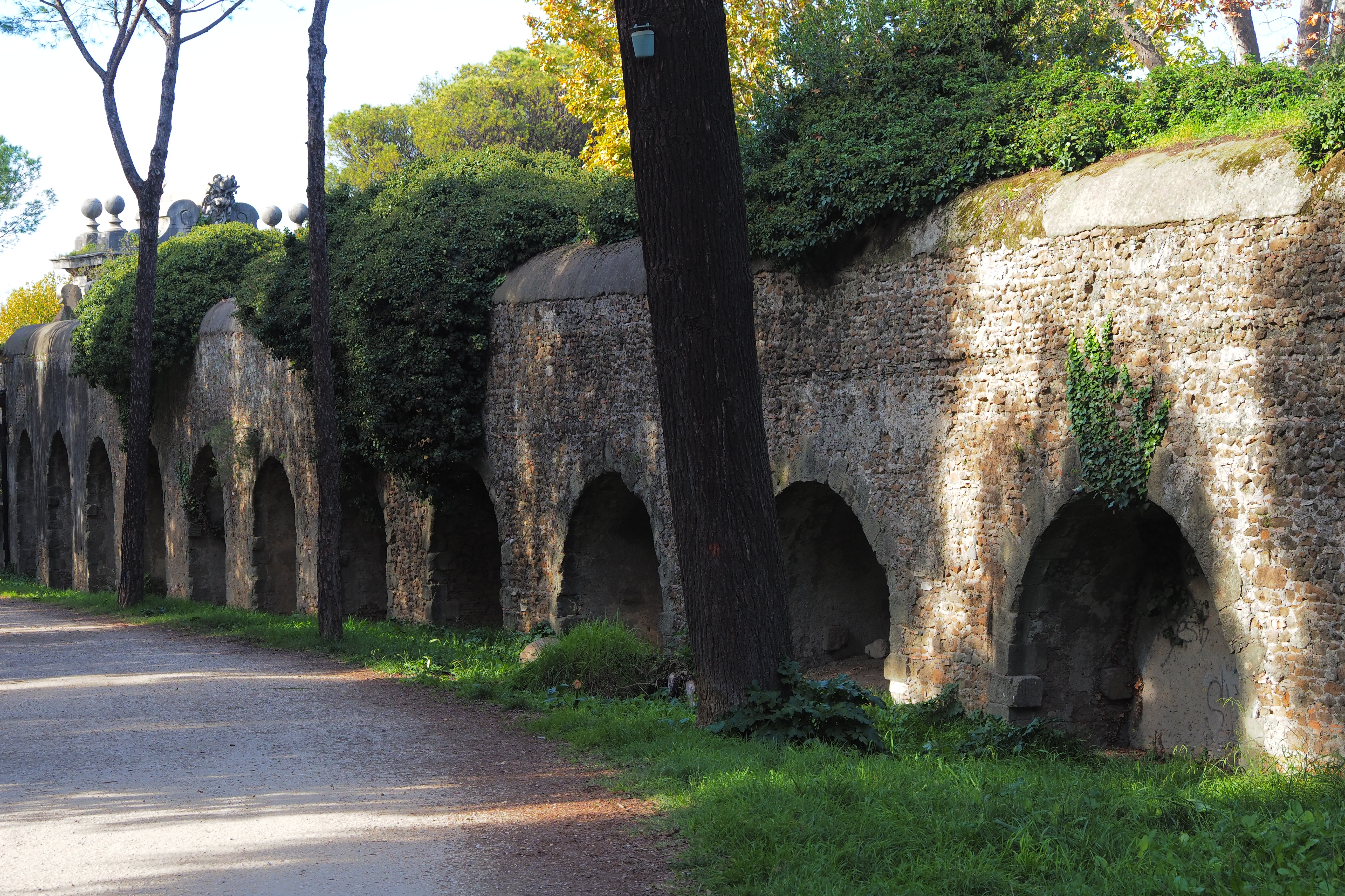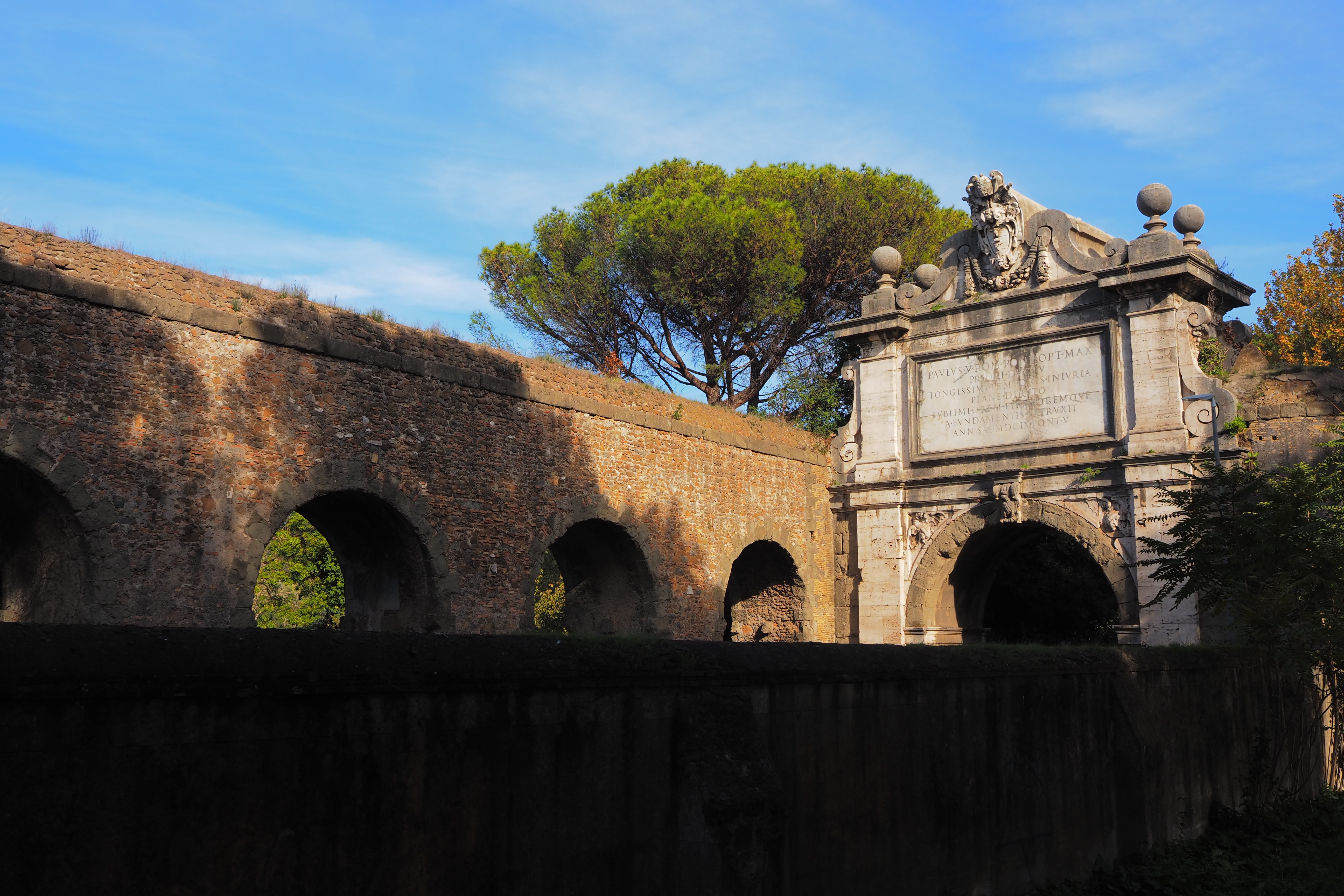 公園の北側を走る石造りの塀と、Arco di Tiradiavoli o dell’Acqua Paola という門がみえる。