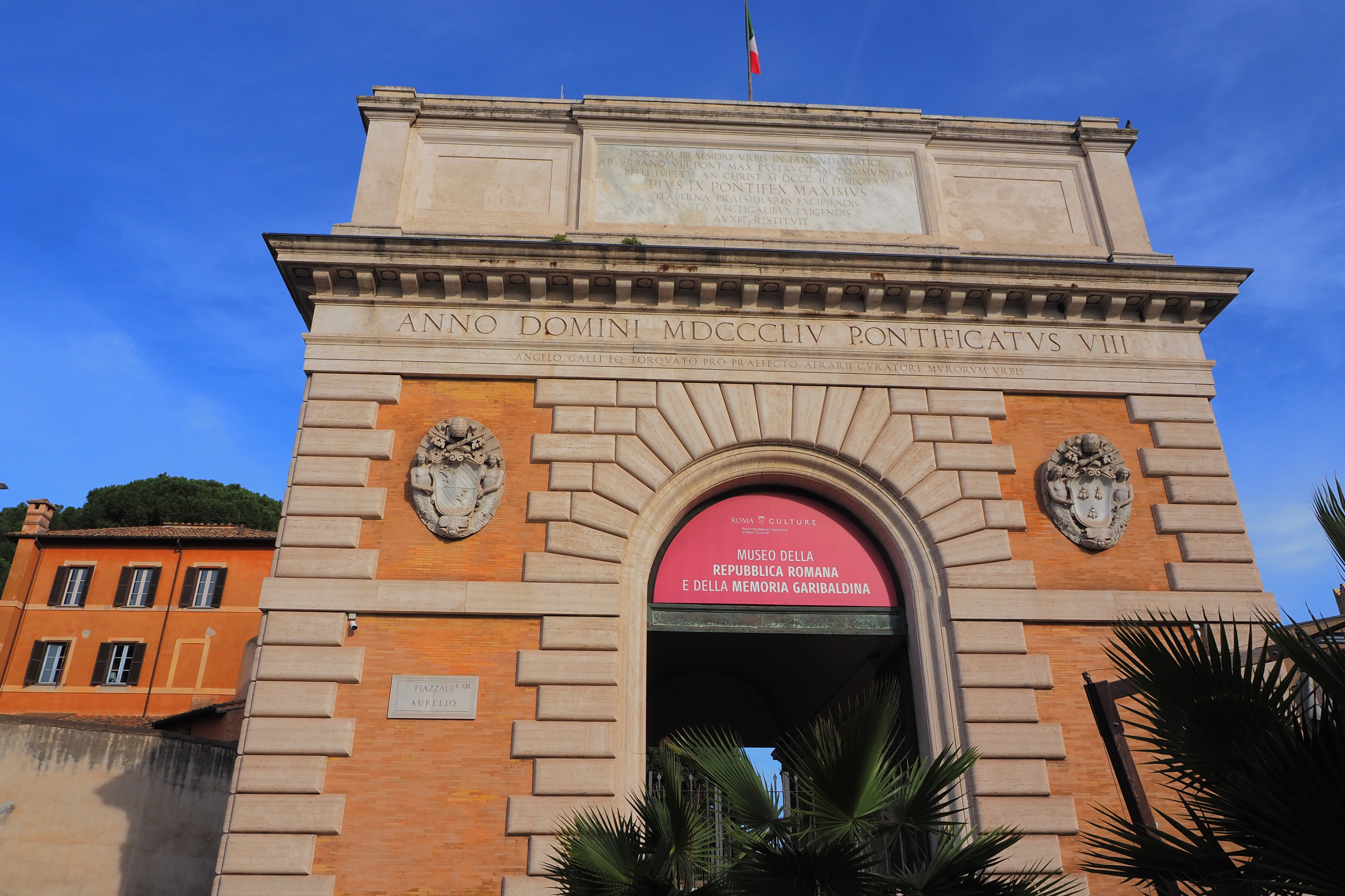 この門の手前側(西側)につづいてる水道橋は、門を介して道を渡り 更に東へとつづいて Fontana dell’Acqua Paola; アクア・パオラの噴水へ至る。1612年、当時の教皇パウルス5世が 古代ローマ期のトラヤヌス水道を アクア・パオラ水道として復活させるプロジェクトの際に東西水道橋の接続部分として建てられた門なのだ。