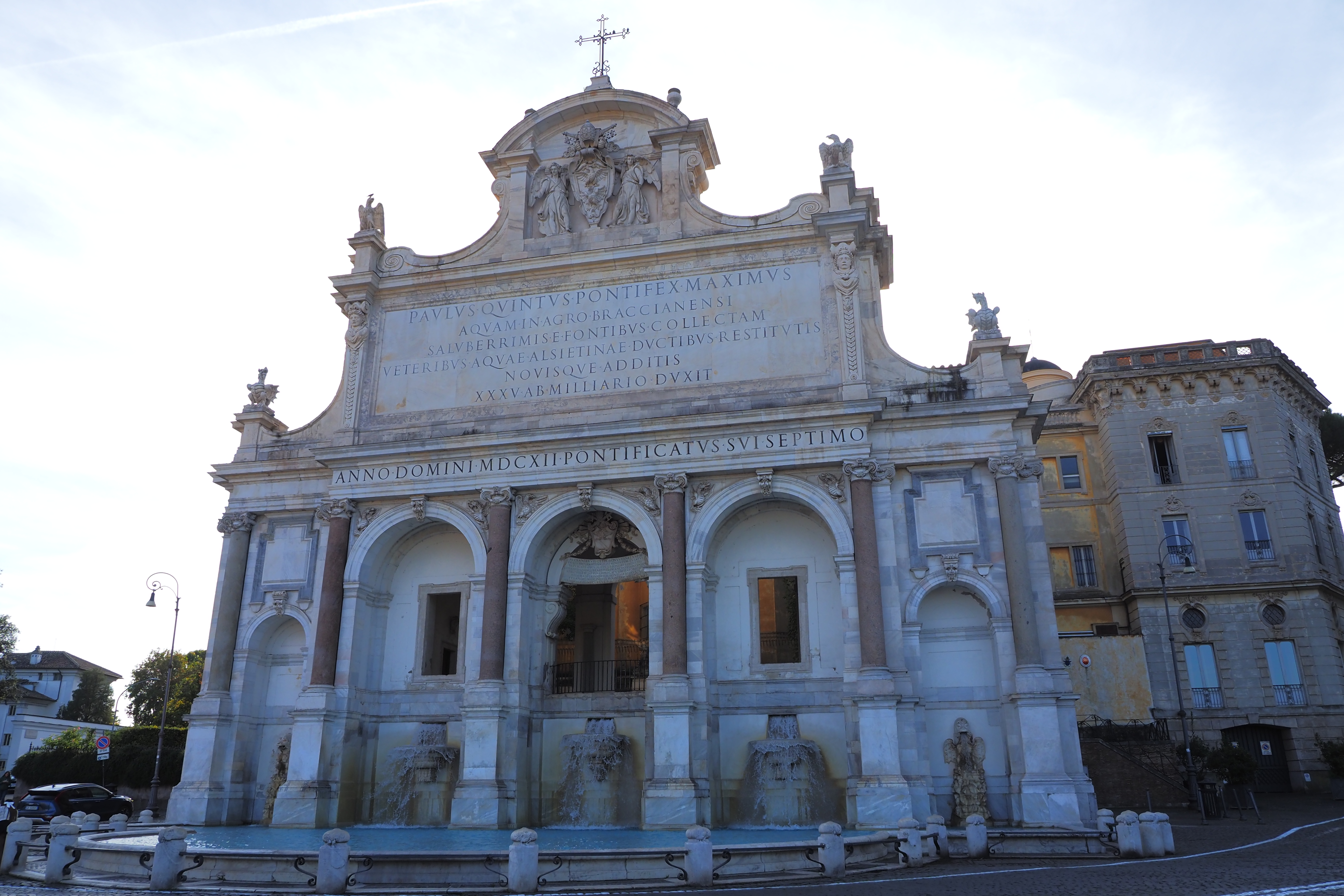 パウルス5世の「トラヤヌス水道復活プロジェクト」の終着点として1614年に完成した。ちょっと逆光で写真が微妙だけど、まるで教会のファサードみたいに立派な噴水だ。噴水の頂上にはさっきの門と同じく、パウルス5世のBorghese家の紋章が設置されてる。