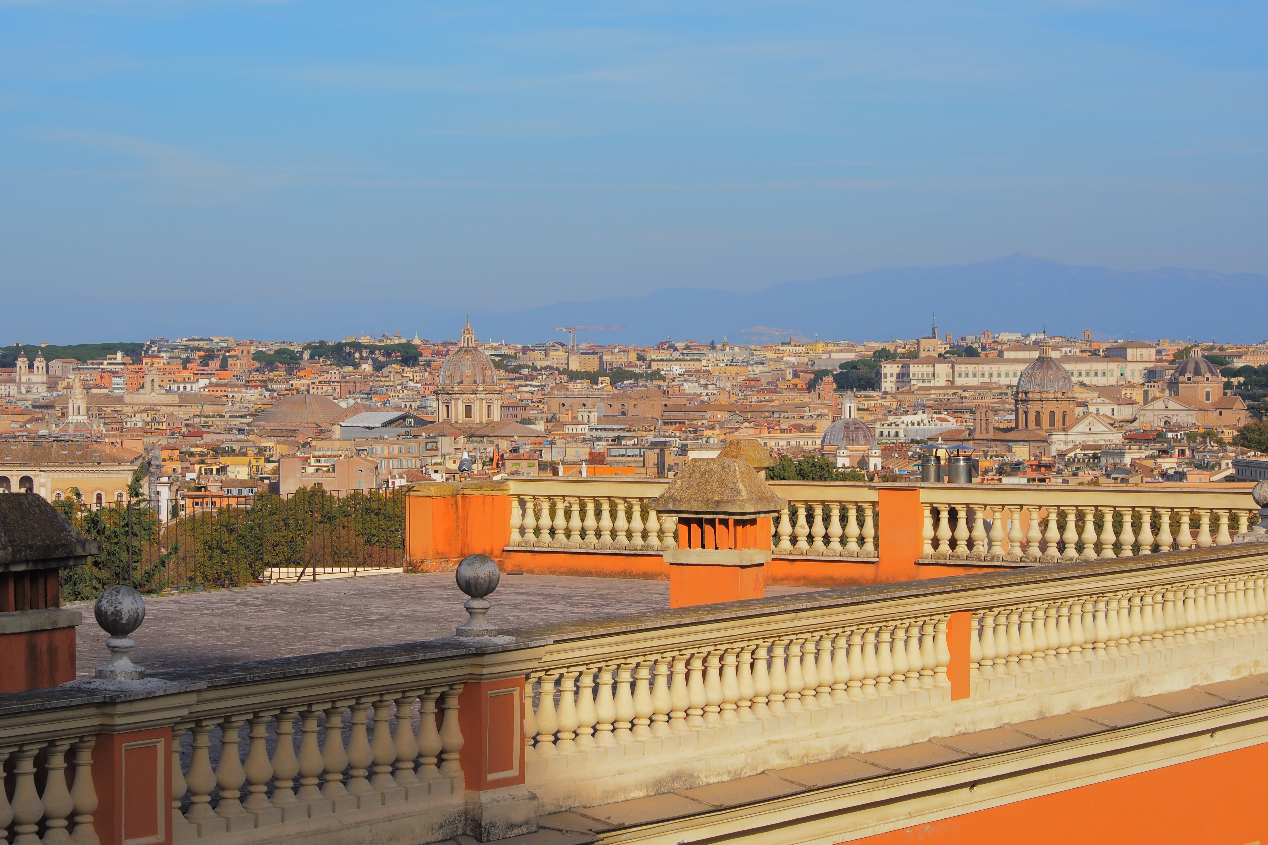 噴水が建つ Gianicolo; ヤニコロの丘からの眺めと Chiesa di San Pietro in Montorio.