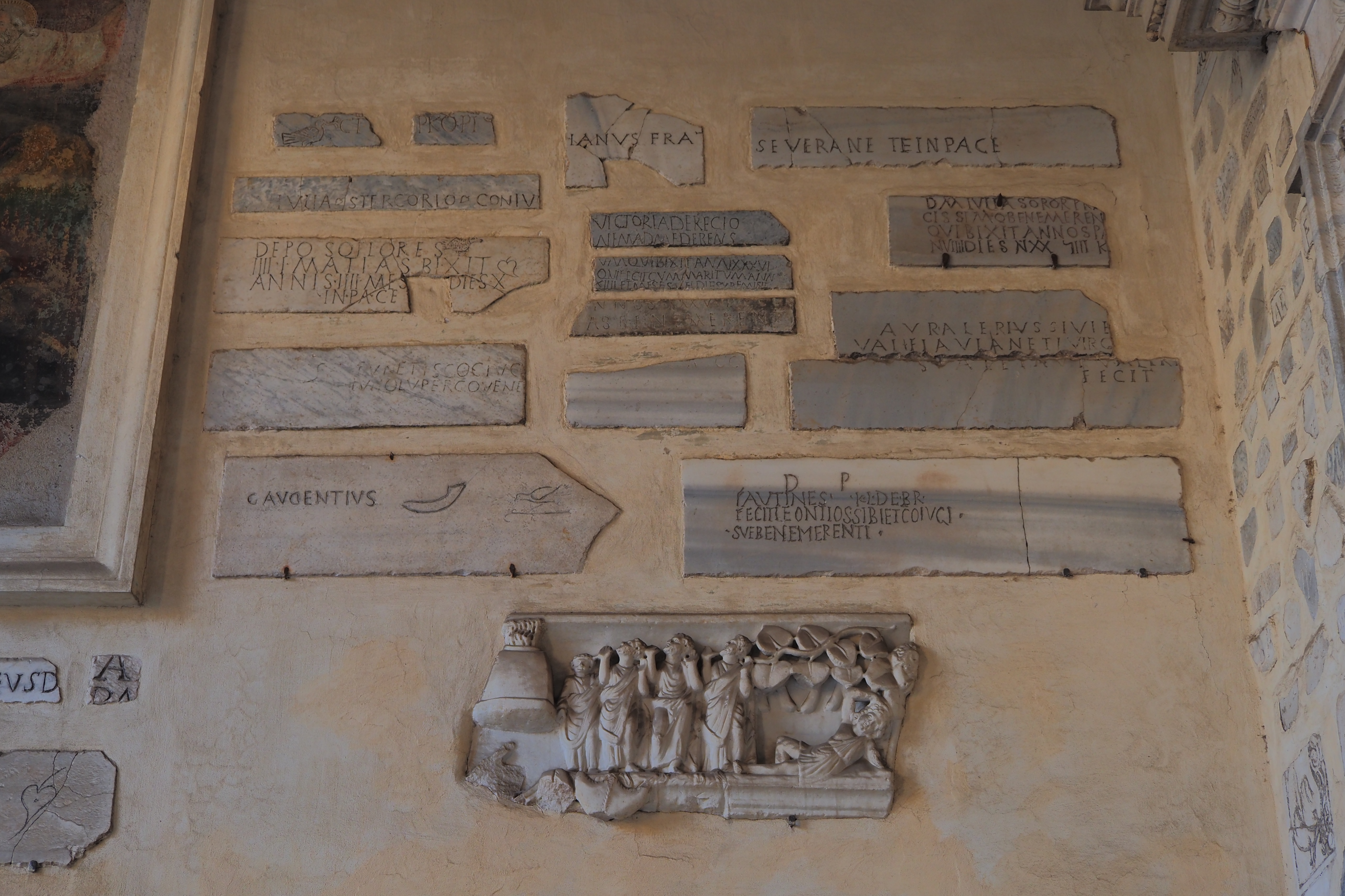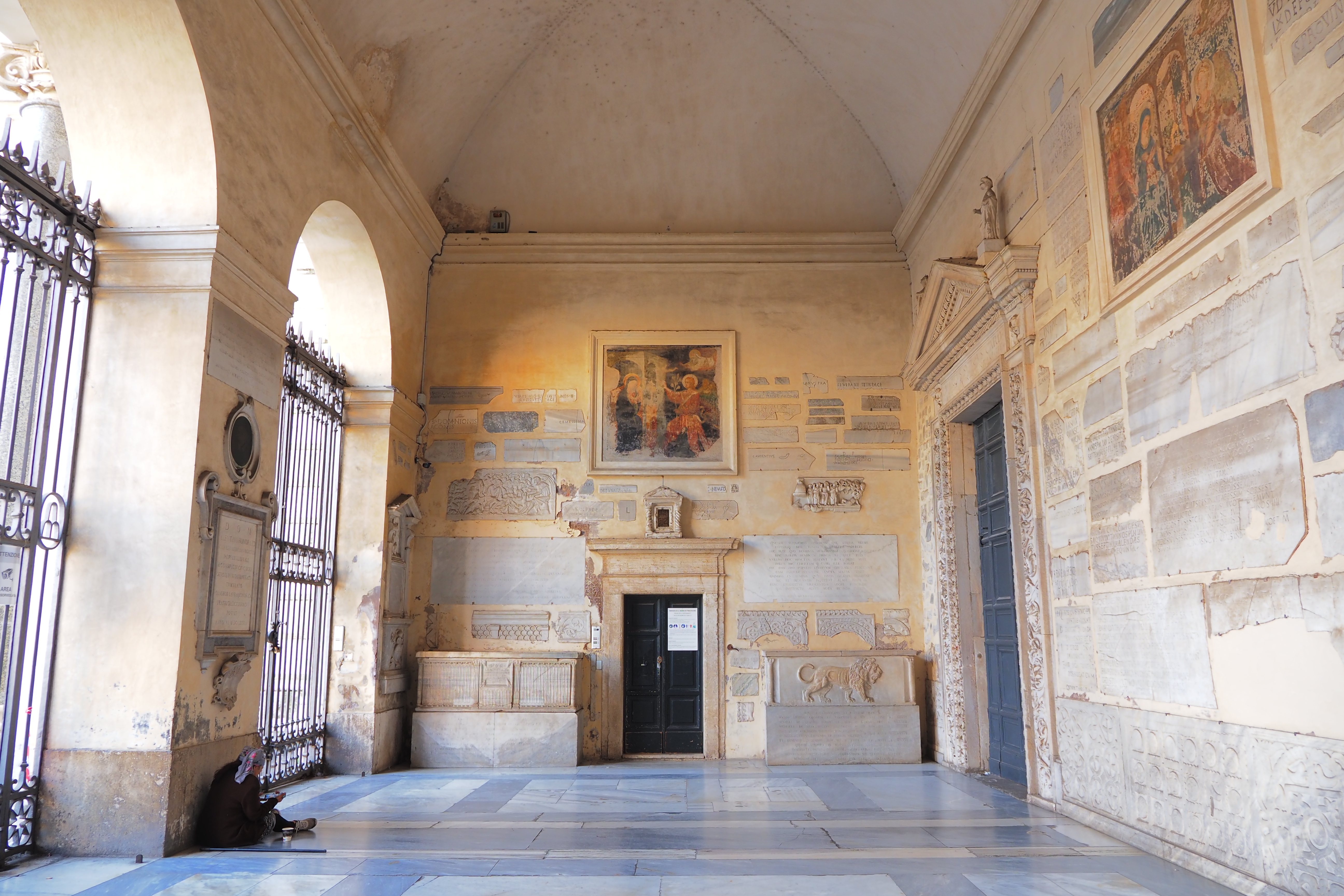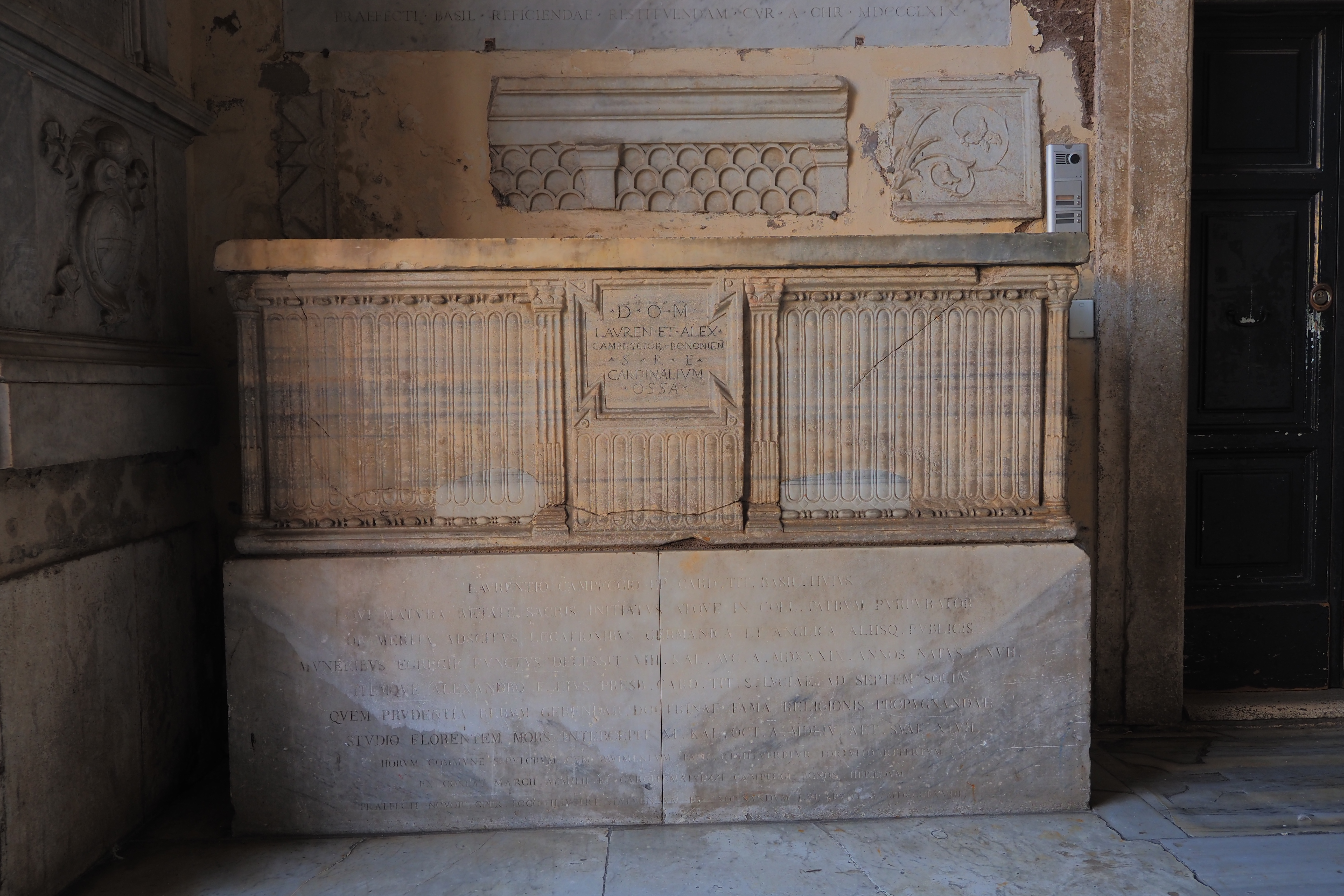 ポルチコの壁には、長い歴史の中で教会に関わったであろう枢機卿の墓石の一部などが埋め込まれている。