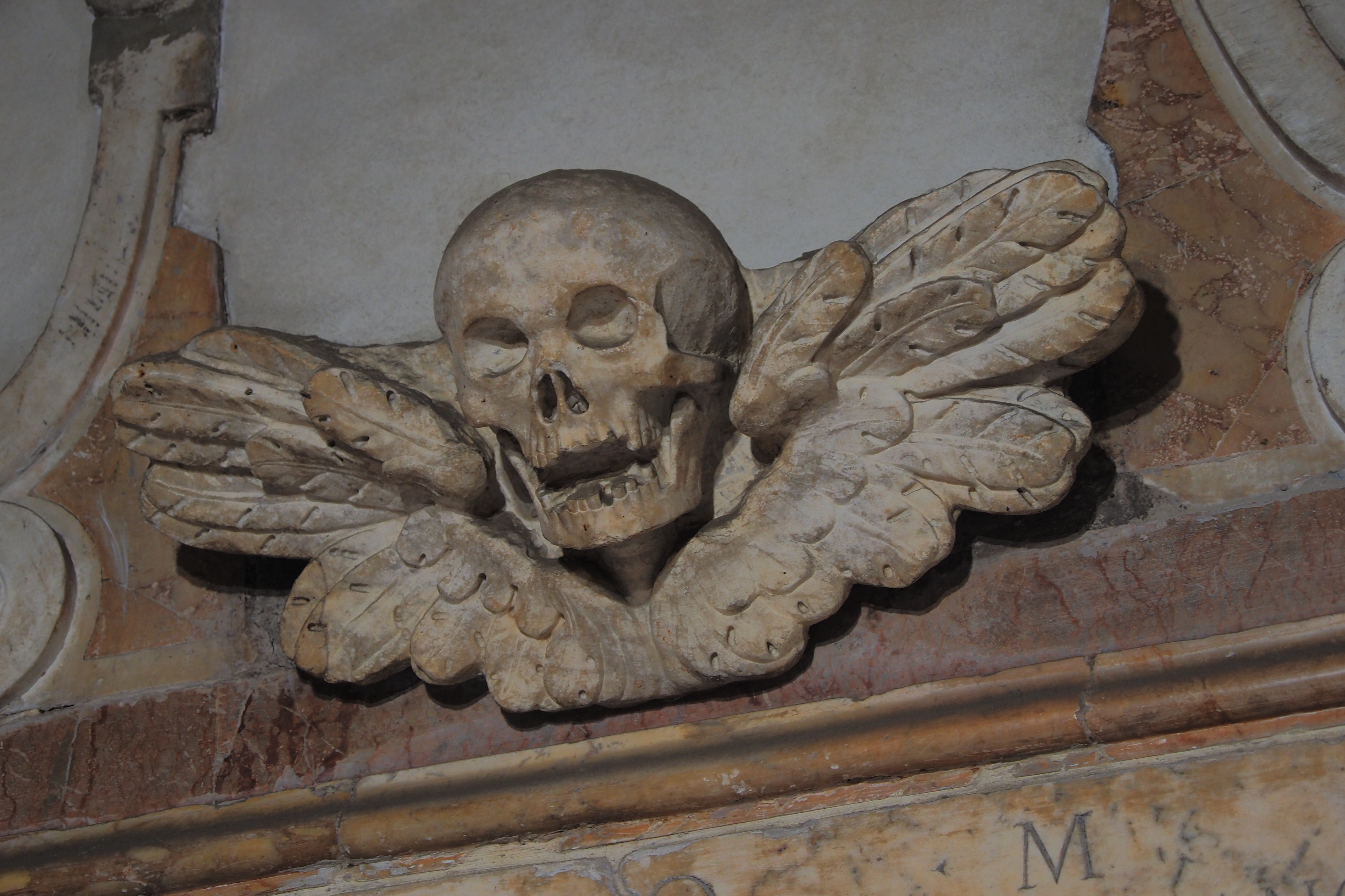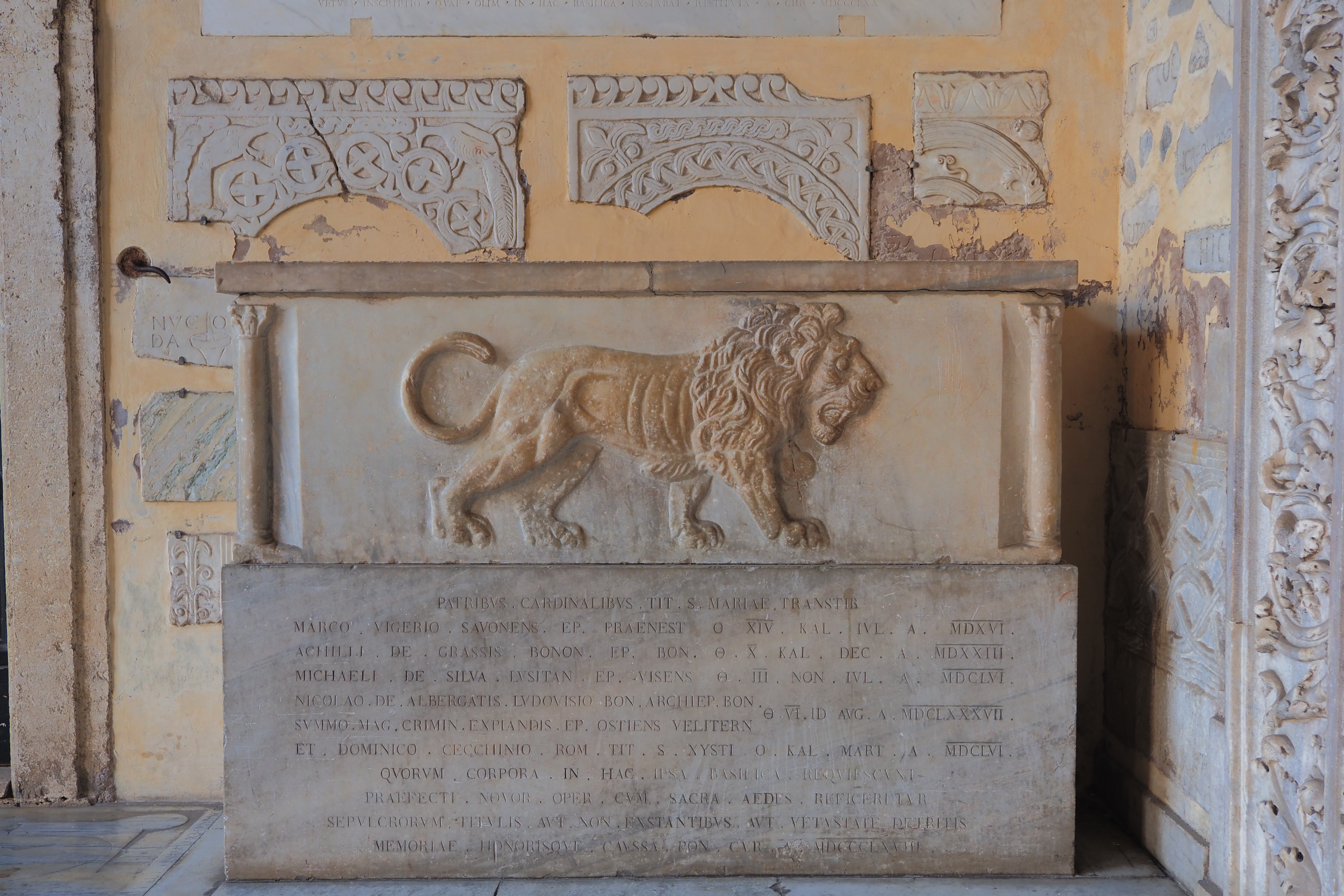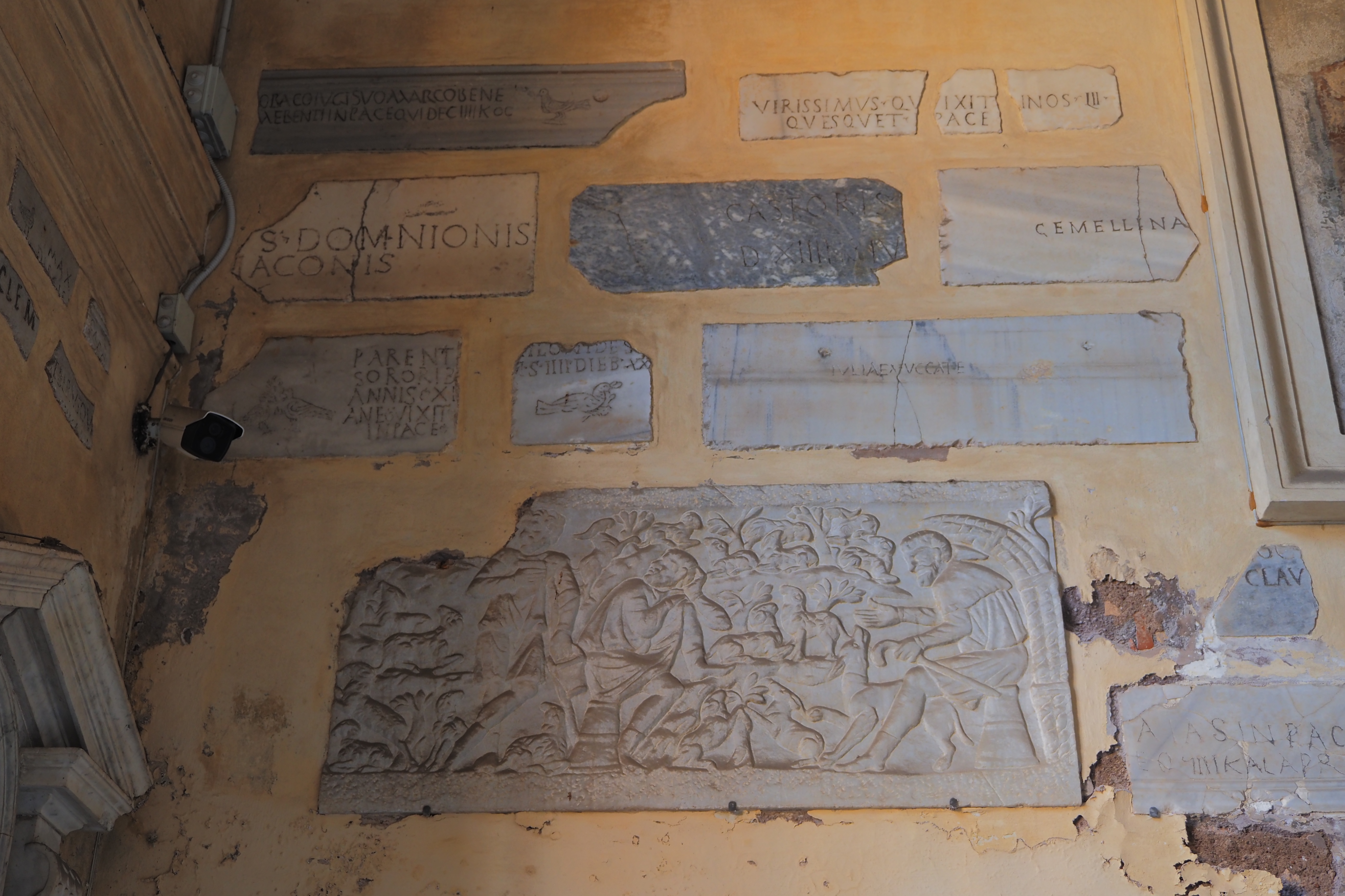 ポルチコの壁には、長い歴史の中で教会に関わったであろう枢機卿の墓石の一部などが埋め込まれている。