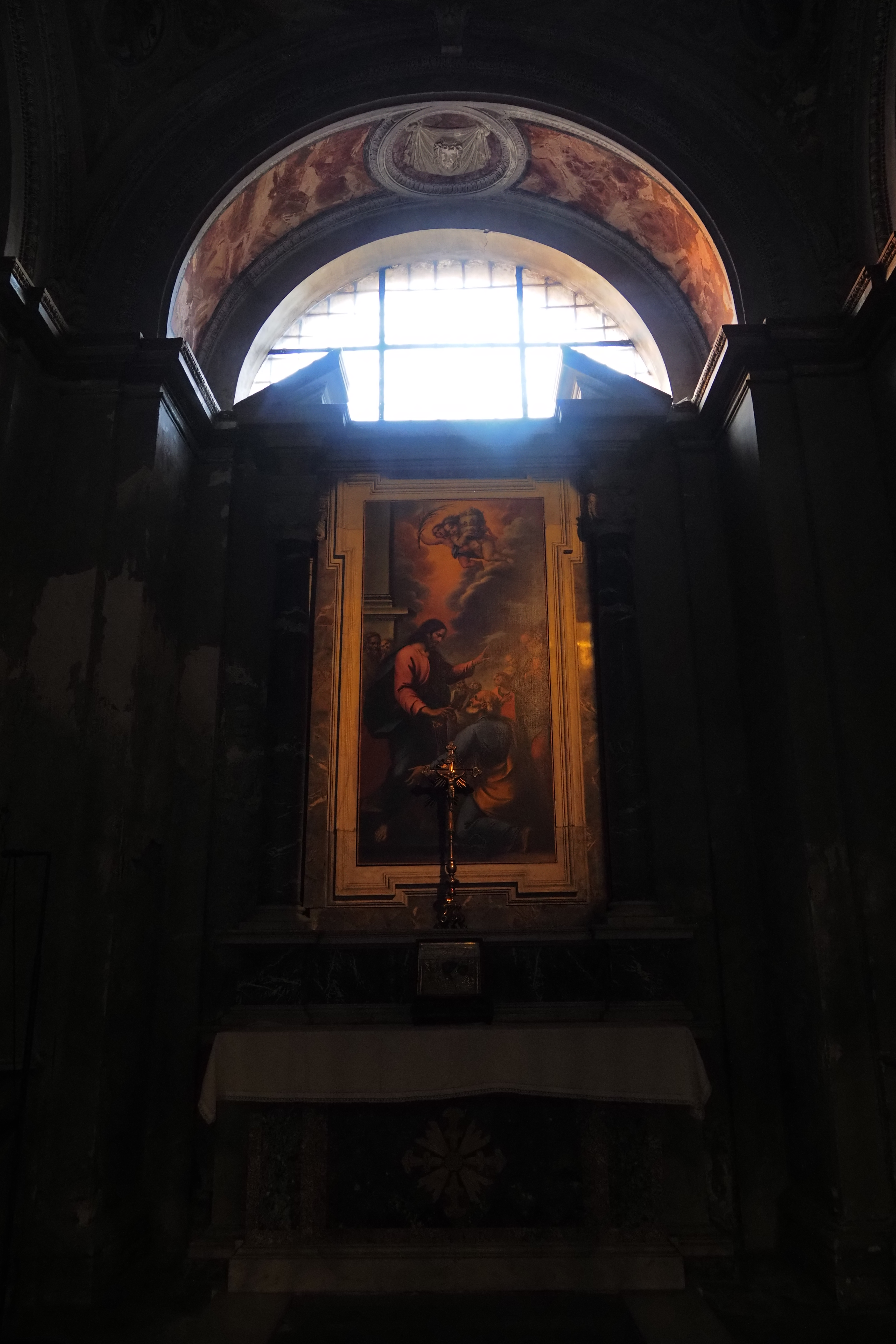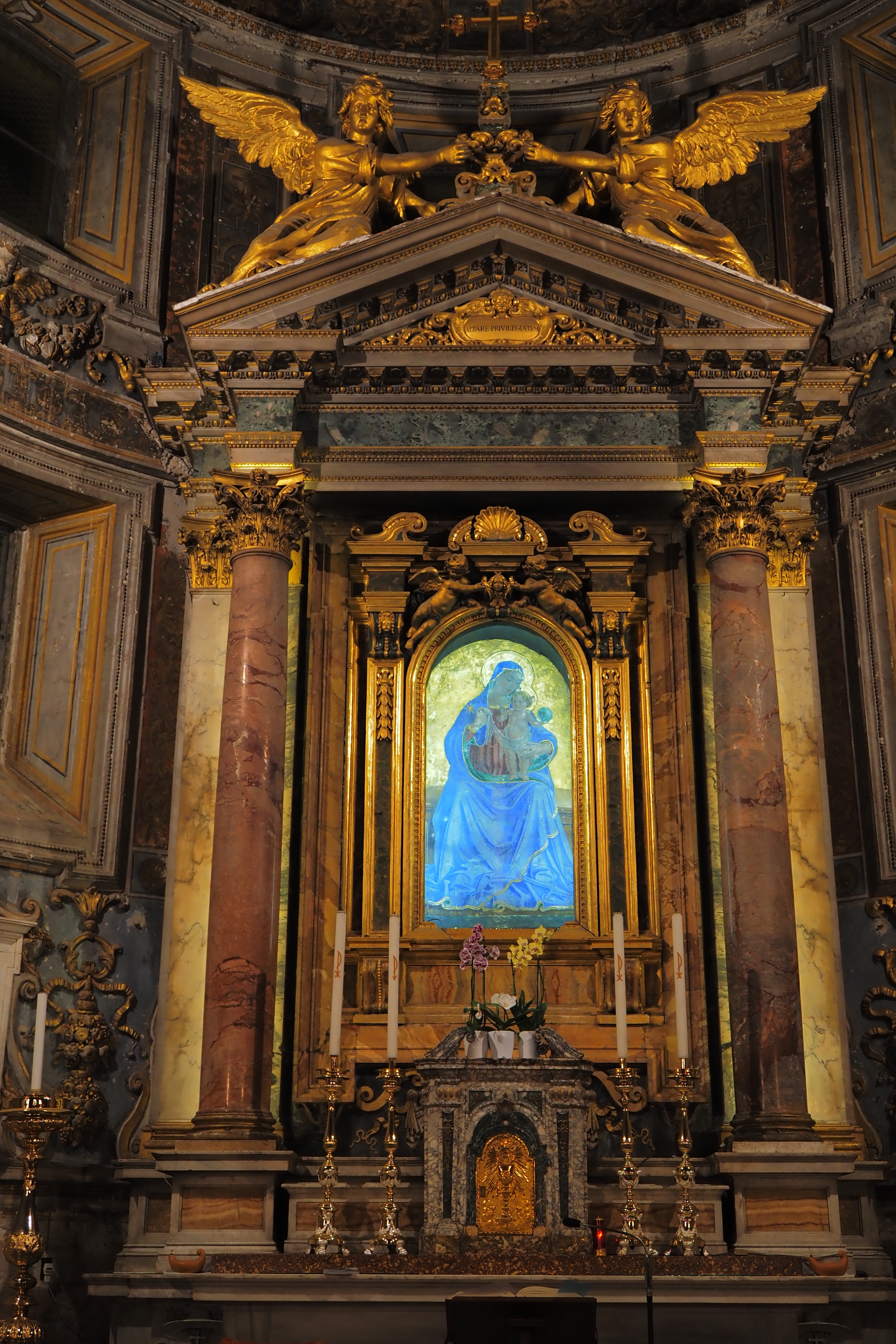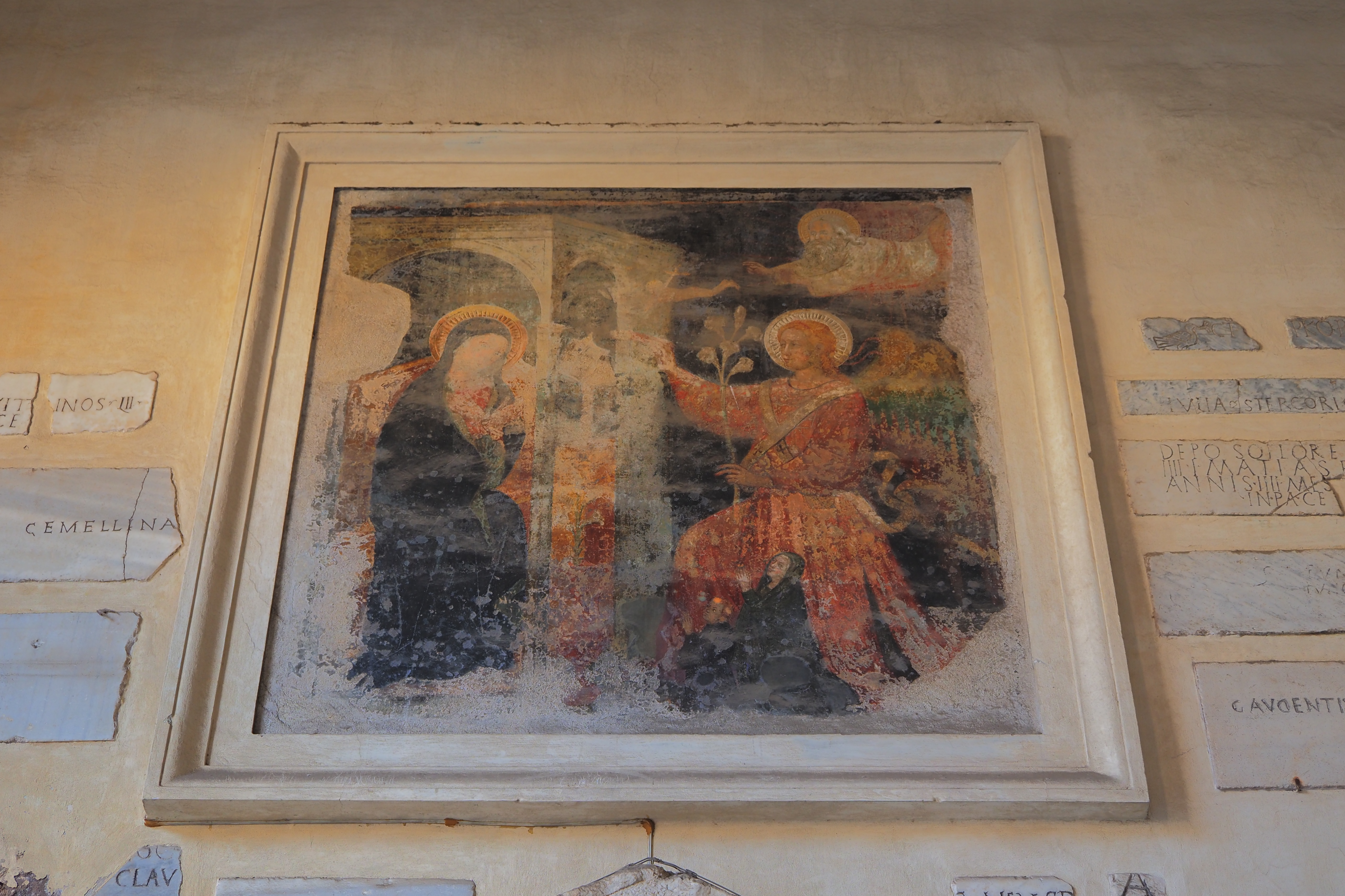 教会建設のきっかけとなった、1385年の聖母像ではないものの、この教会に飾られているイコンはサイドアルター含め3つ全てがマリア像だ。特に主祭壇の Madonna della Consolazione; 慰めの聖母 は1493年頃に描かれたもので聖母マリアのローブが鮮やかなブルーに輝いていて、暗い教会の中 まるで絵の中から光が放射しているようで本当にきれいだった。