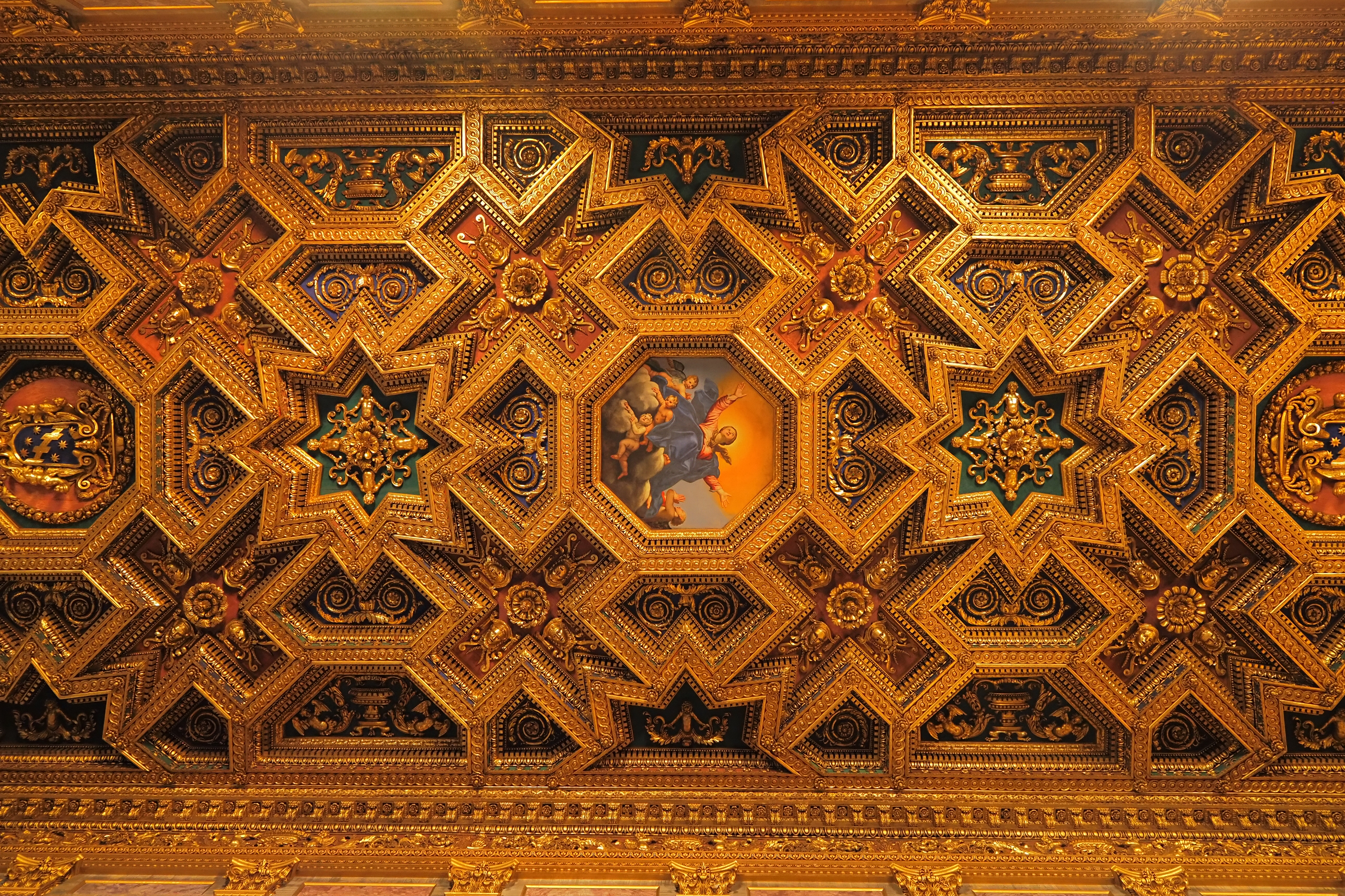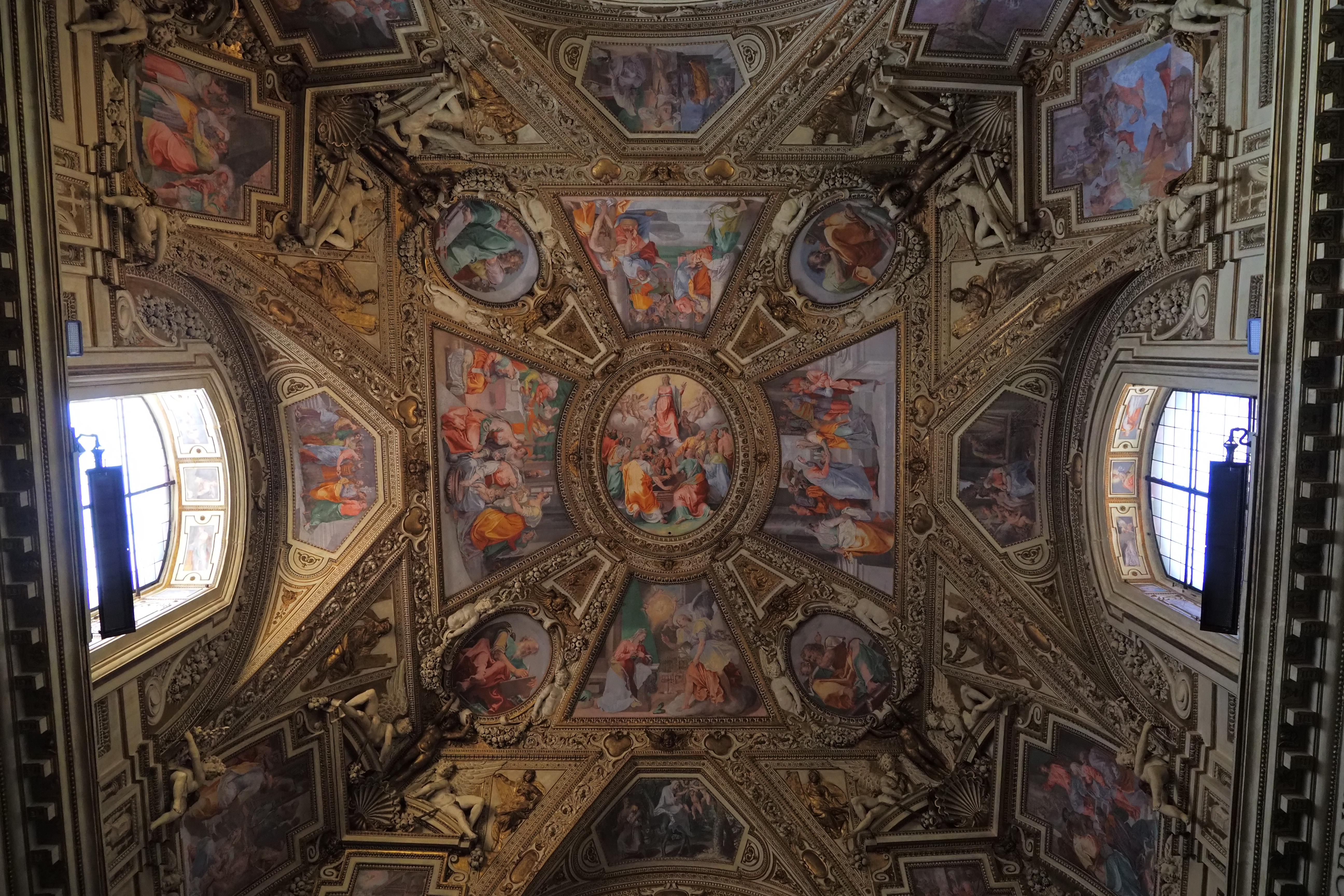 画家 Domenichino; ドメキーノによって設計された、黄金に彩色された木製の格子天井。中央に彼自身が描いた「聖母被昇天」が埋め込まれている。