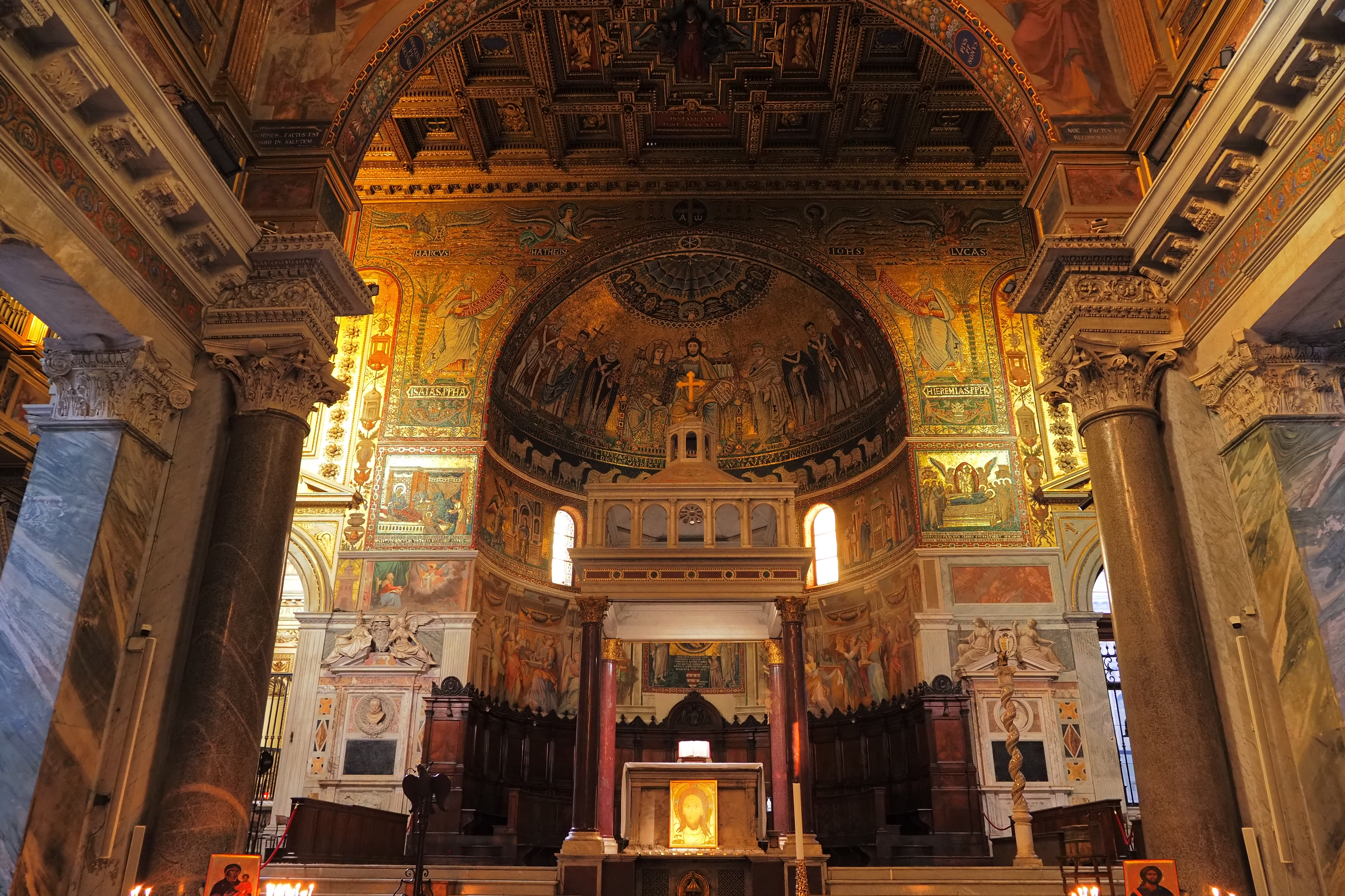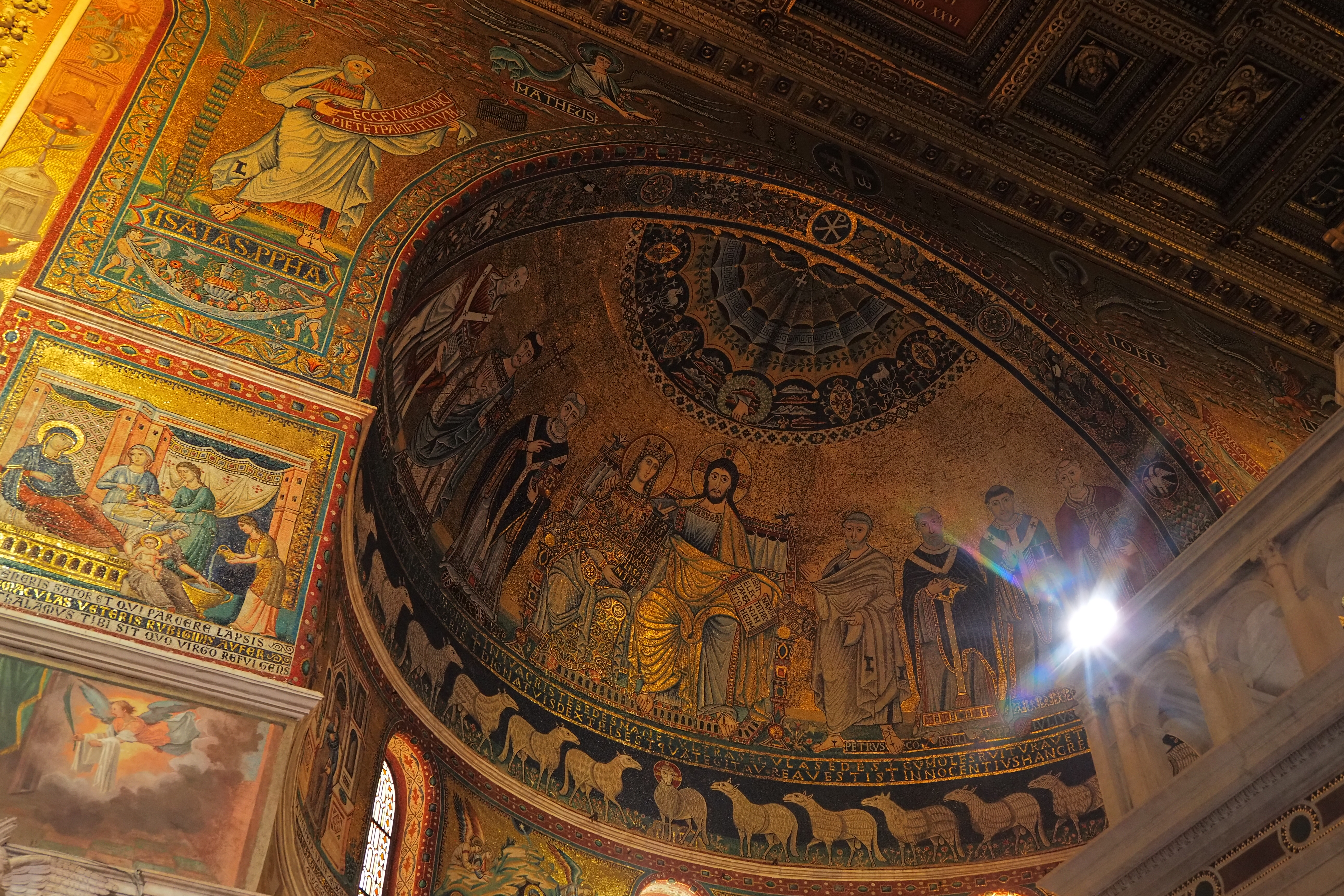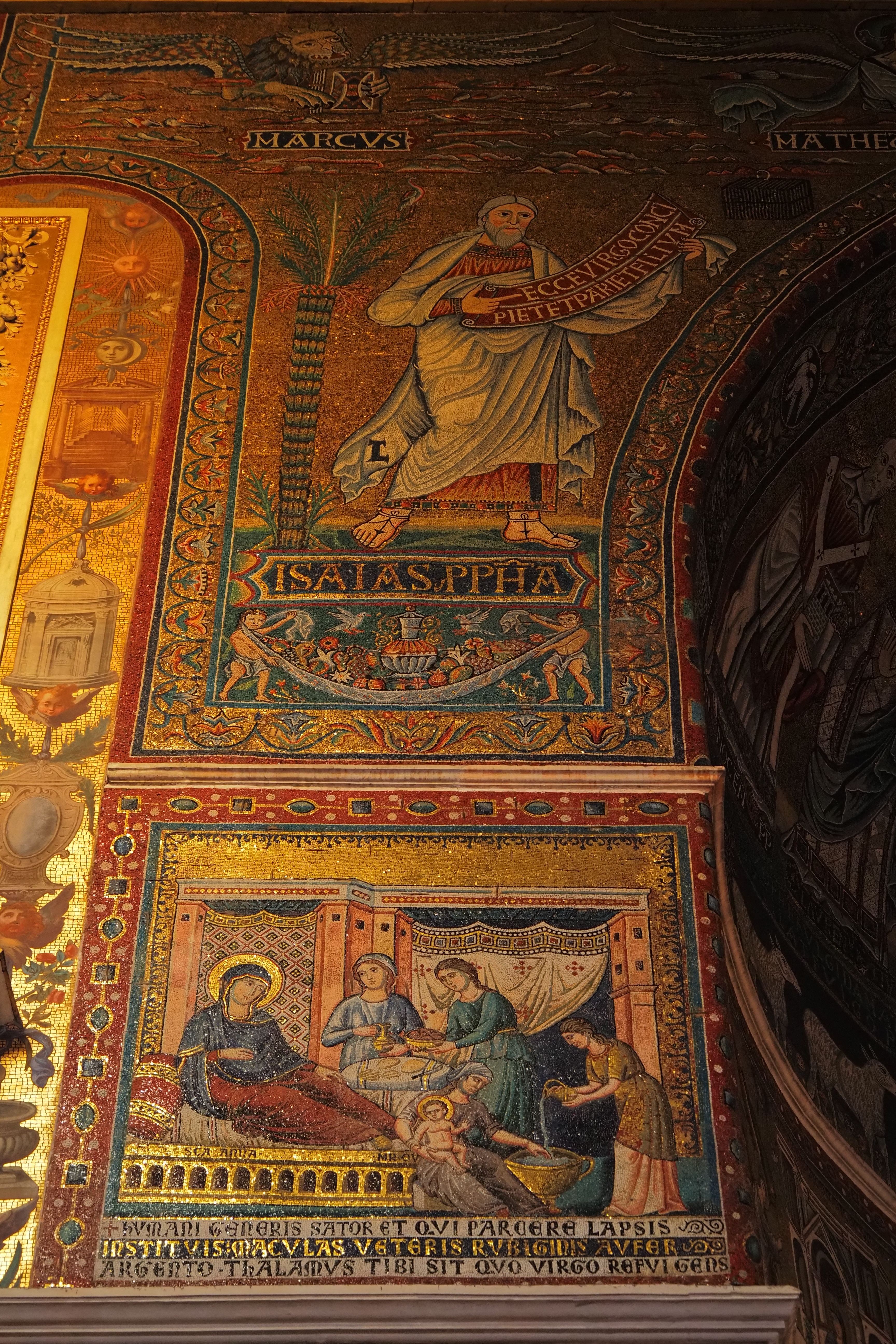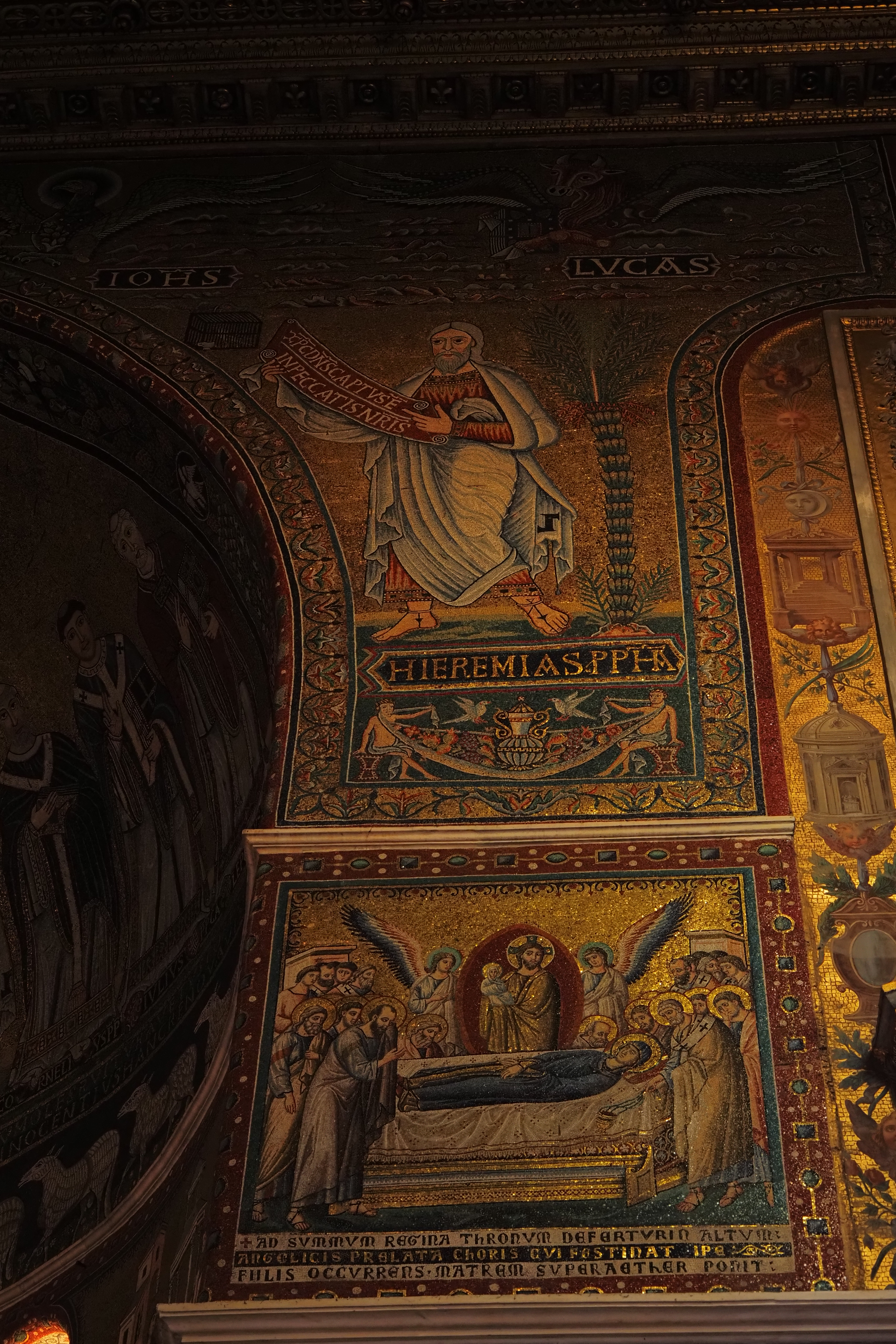 中央に座るイエスとその隣のマリアを描いたこのモザイクは、中世モザイク芸術の最高傑作のうちのひとつだといわれている。当時の教皇インノケンティウス2世の命によって製作されたというだけで、作者は不明らしい。