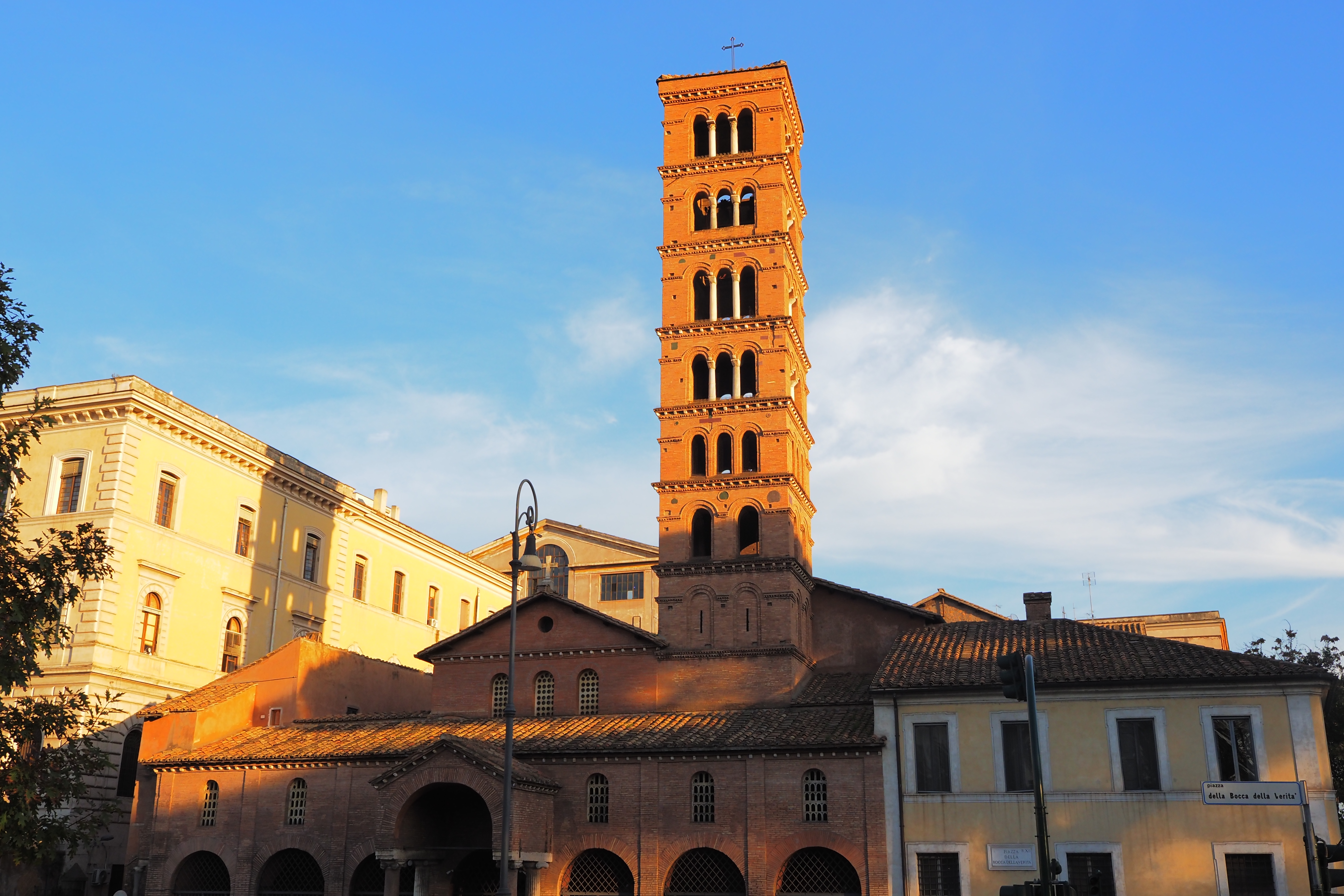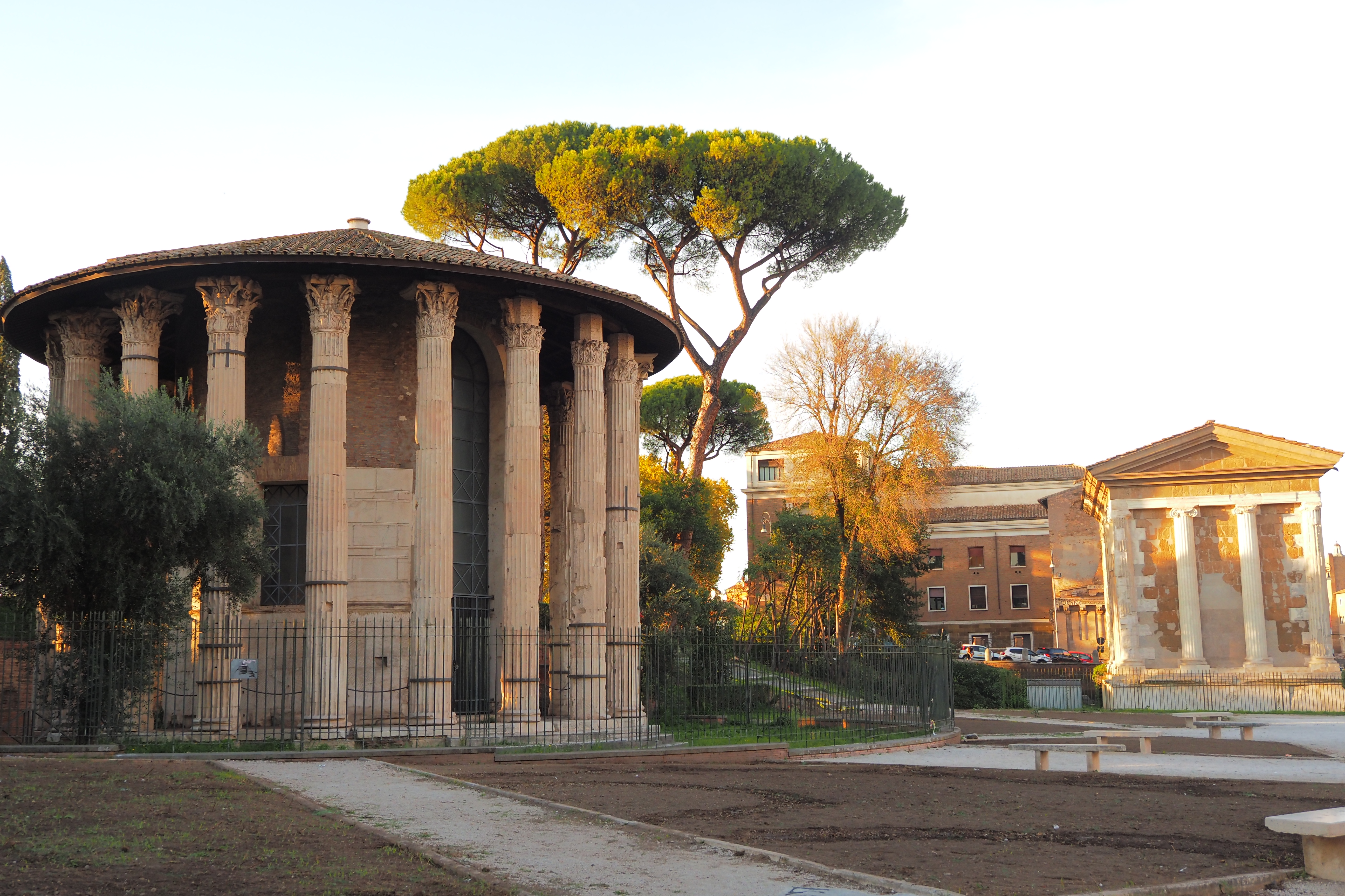 教会のすぐ北西側に建つのが、そのTempio di Ercole Vincitore; ヘラクレス勝利神殿で、紀元前143~132年ごろの築造とローマに現存する最古の大理石建造物とのこと。画角右奥に見えるのは Tempio di Portuno; ポルトゥヌス神殿 で築造は紀元前120~80年頃と古いけど 近年に行われた大規模修繕のおかげでかなり新しく見える。どちらも共和制ローマ期の貴重な遺構だ。