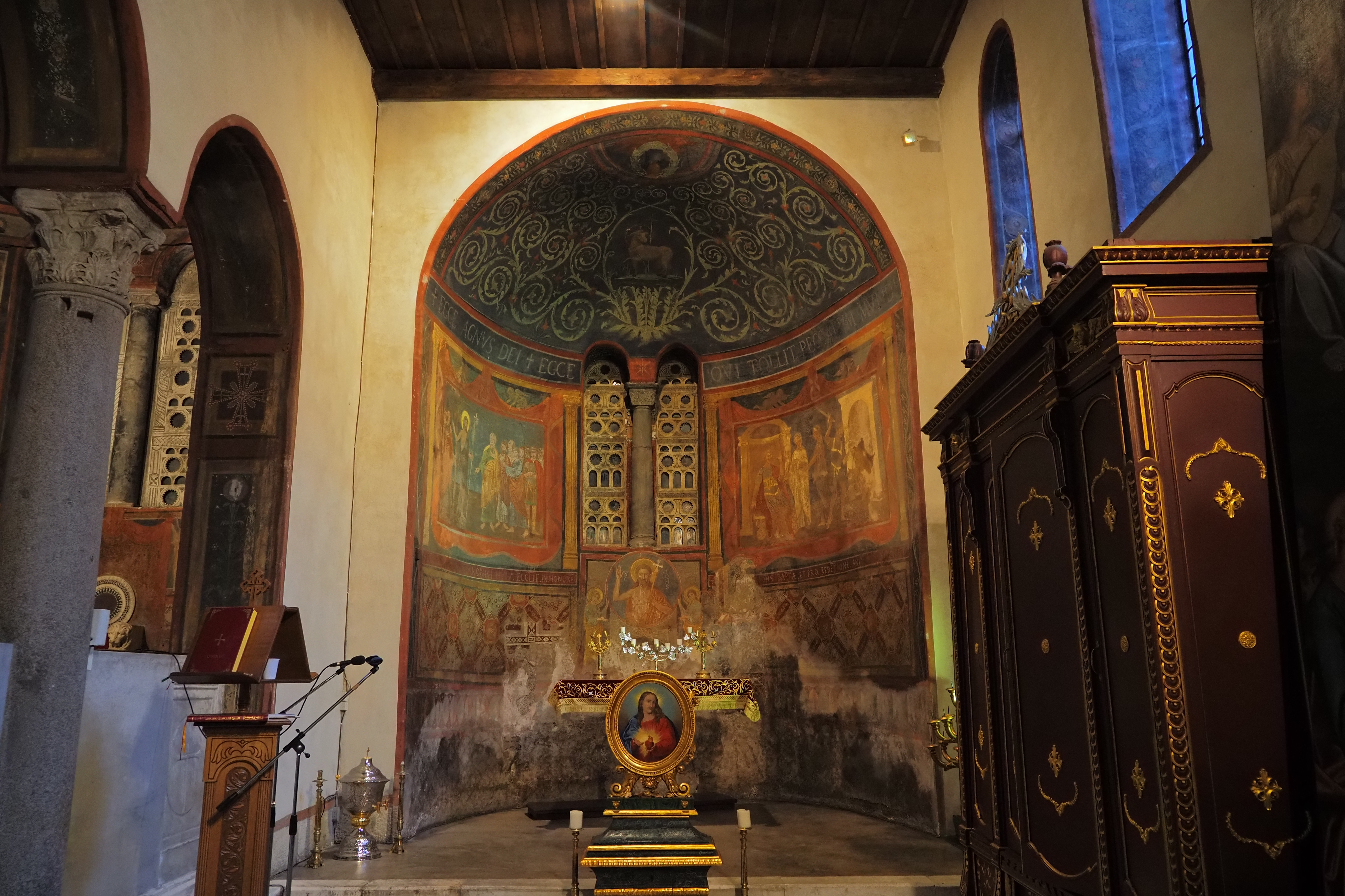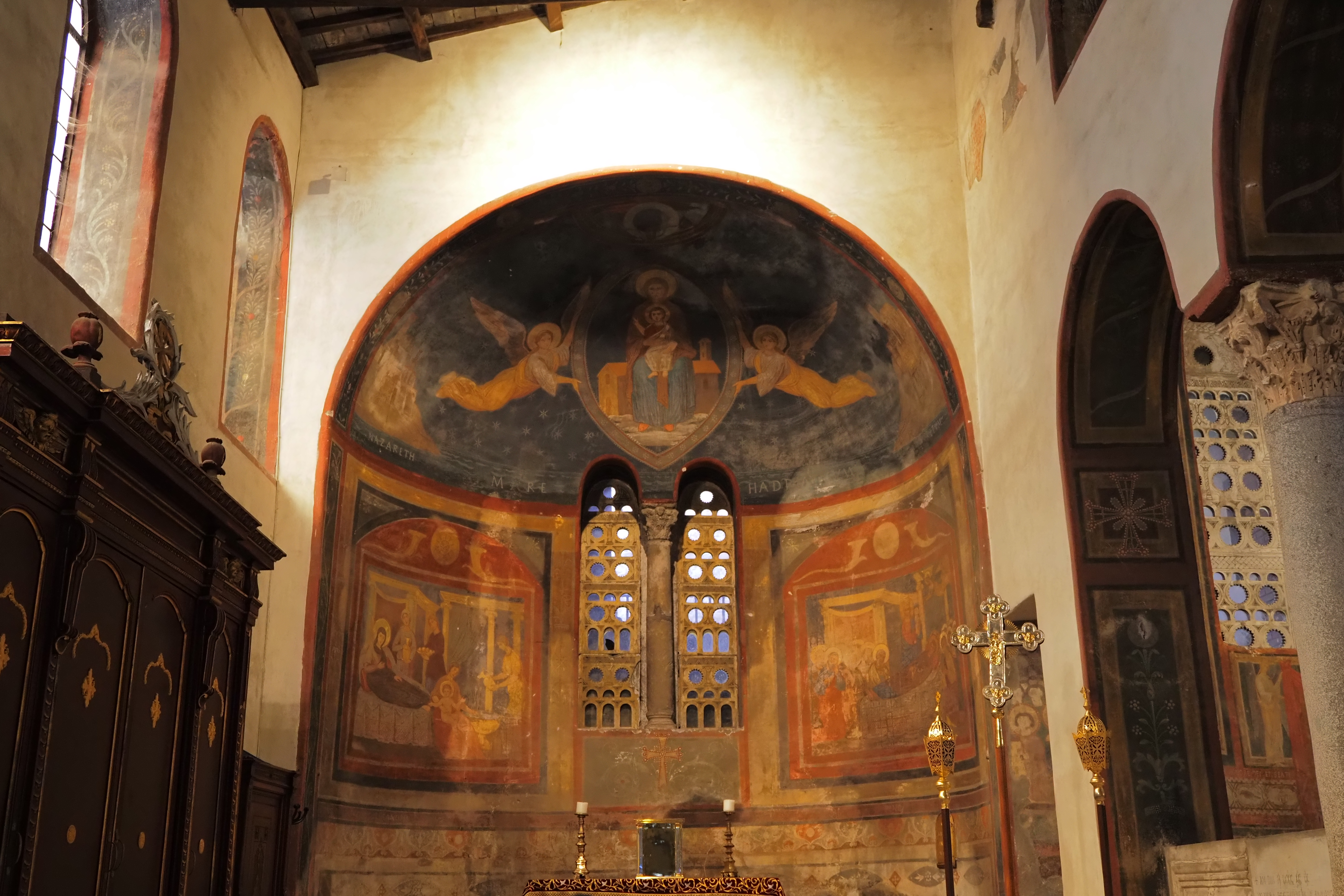 主祭壇奥のアプスにみえるフレスコ画は、19世紀の修復作業によるもの。