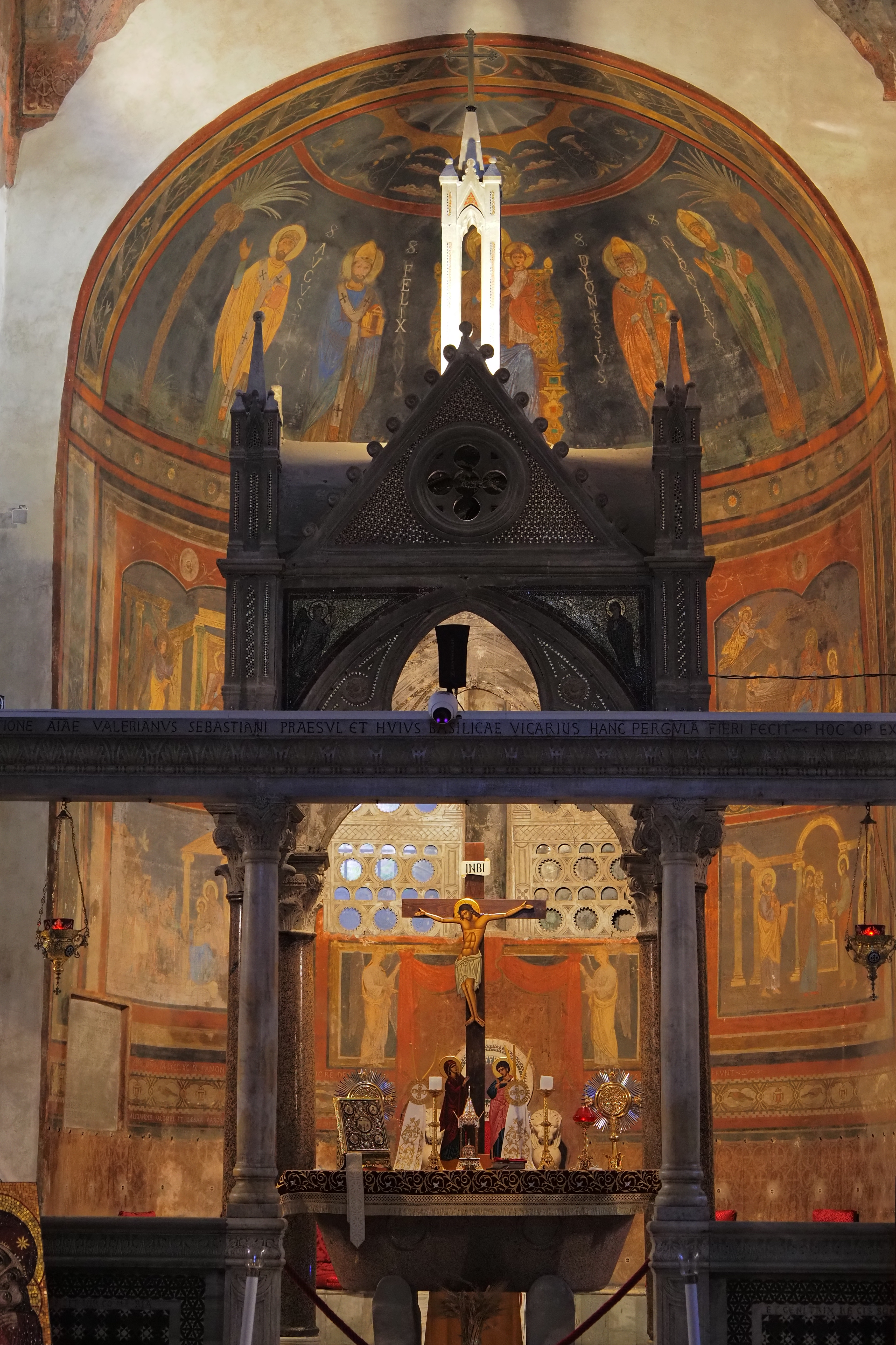 主祭壇前。バルダッキーノの後ろ、アプスには 1130~1143年頃に作製されたモザイクが見える。