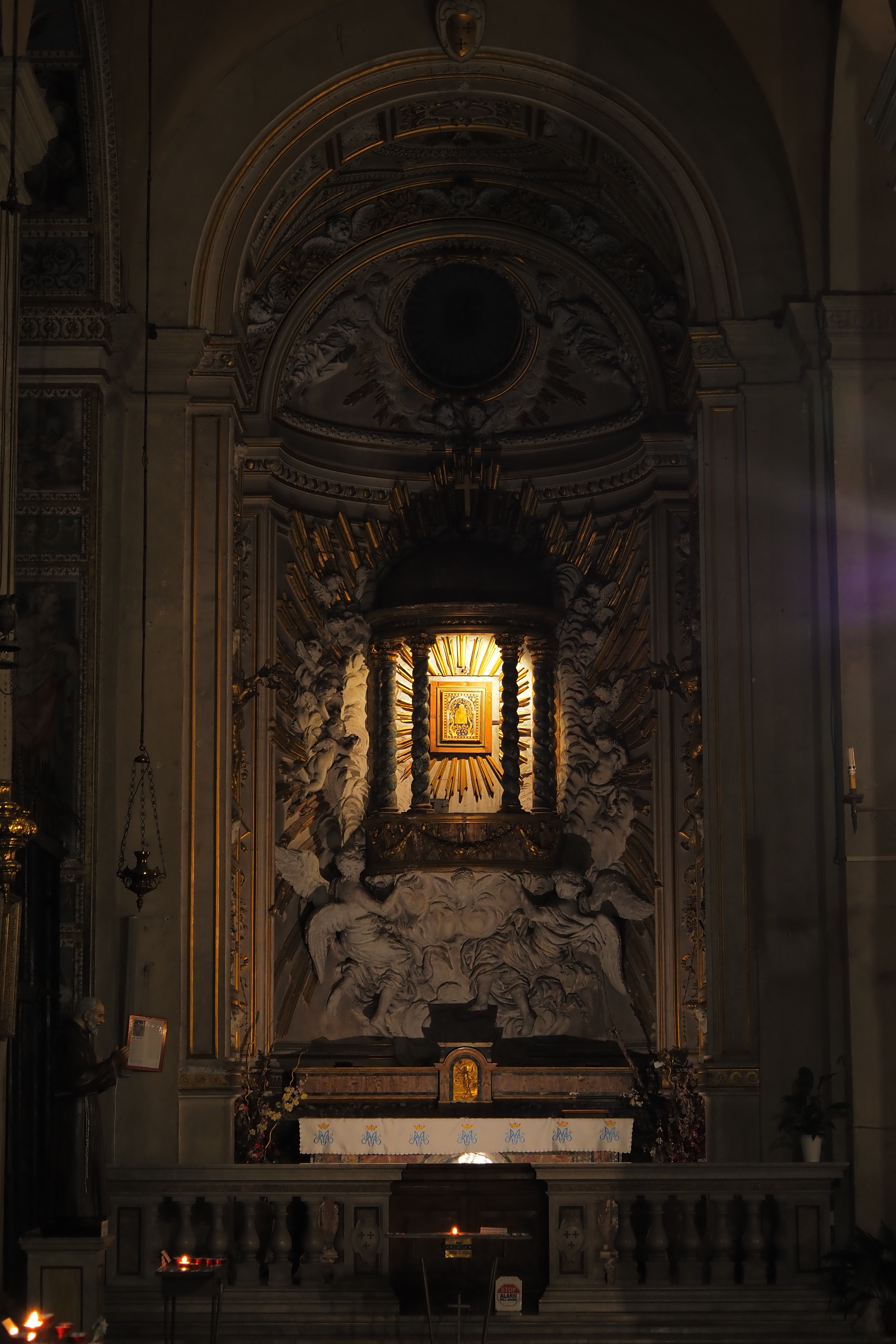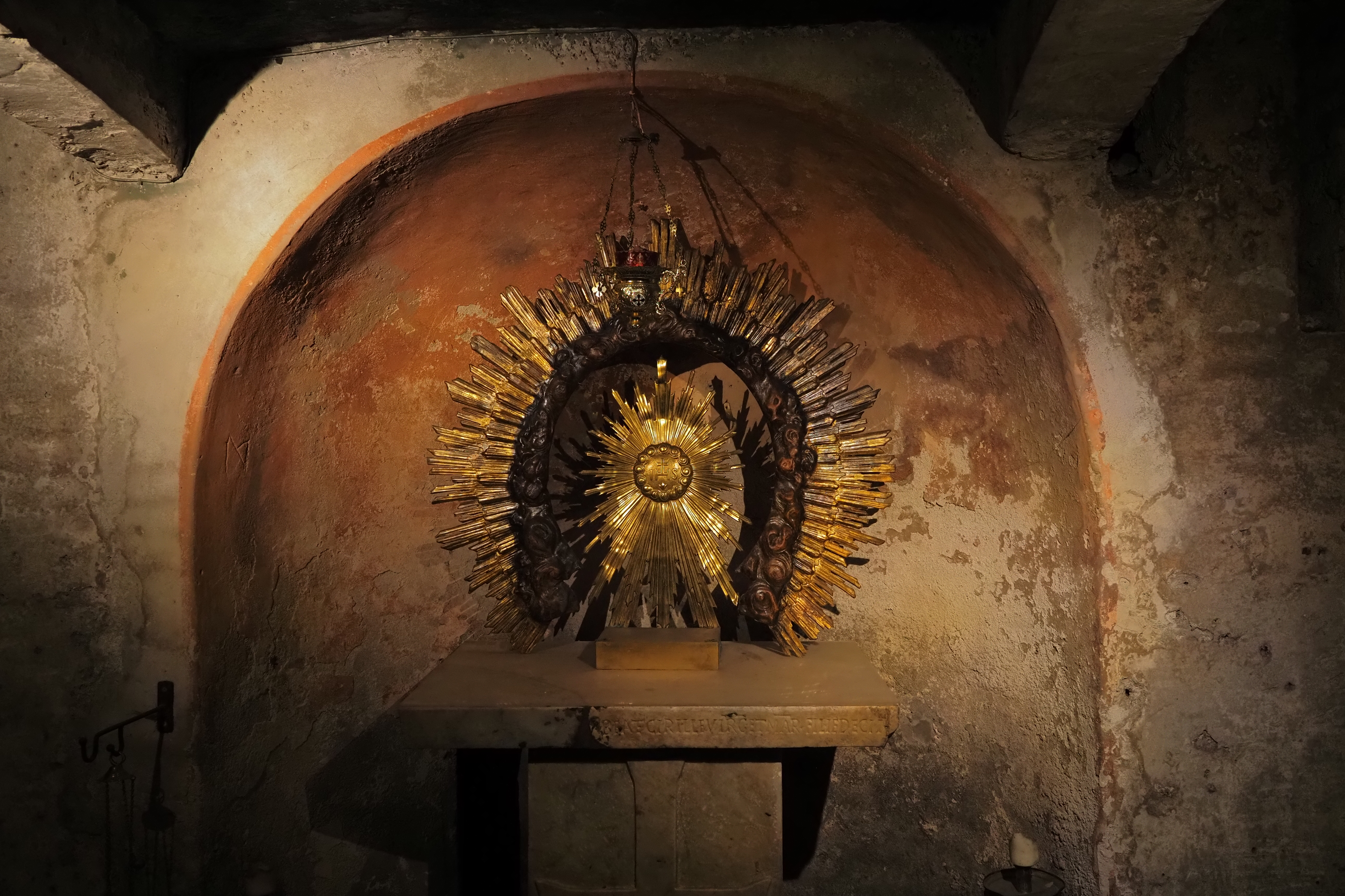 今でも、地下聖堂にもある石の祭壇には、黄金が放射状に輝く Monstrance; 聖体顕示台 が置かれていた。