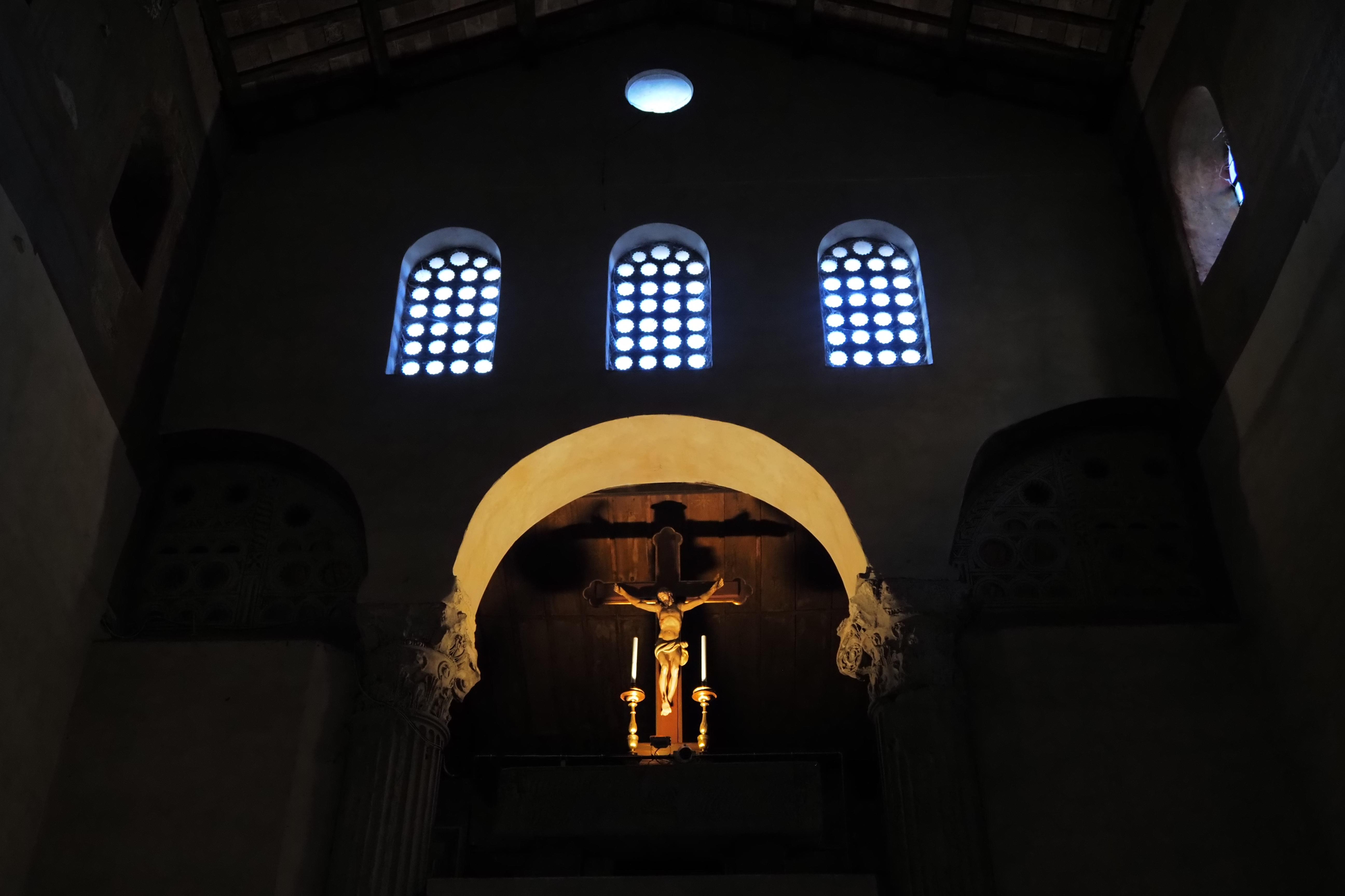 教会内部。ロマネスク様式の重厚で質素な内面かと思いきや、内部はバロック様式に近い三廊式のバシリカで、イオニア式の列柱が側廊を分ける。