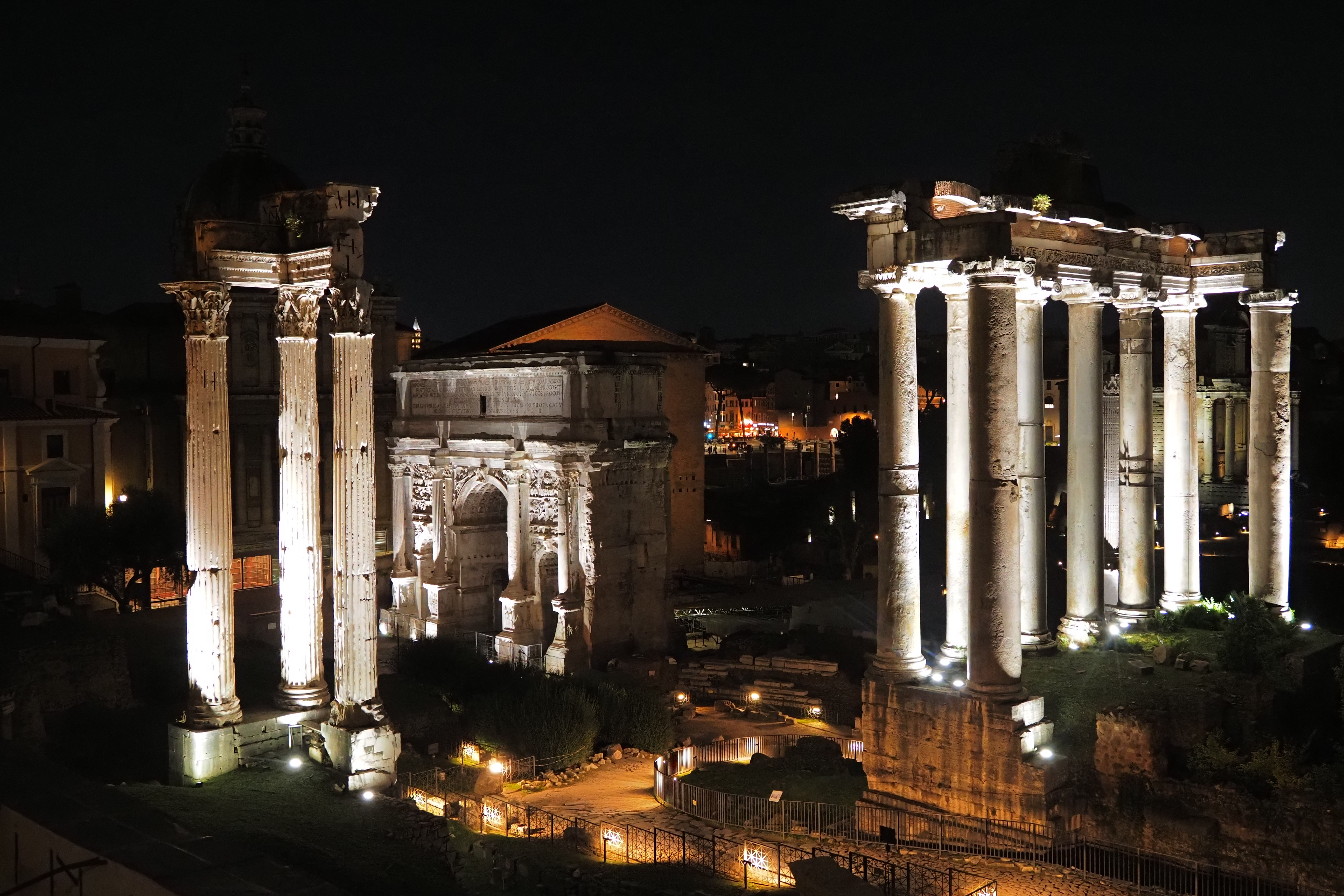 奥に見える門が Arco di Settimio Severo(203年) 、手前左側が Tempio di Vespasiano e Tito(87年)の残存する3本の柱、右側が Tempio di Saturno(287年or4世紀頃の再建)の現存する8本の列柱とエンタブラチュア 、、、と時代背景の異なる古代の遺構が密集している。