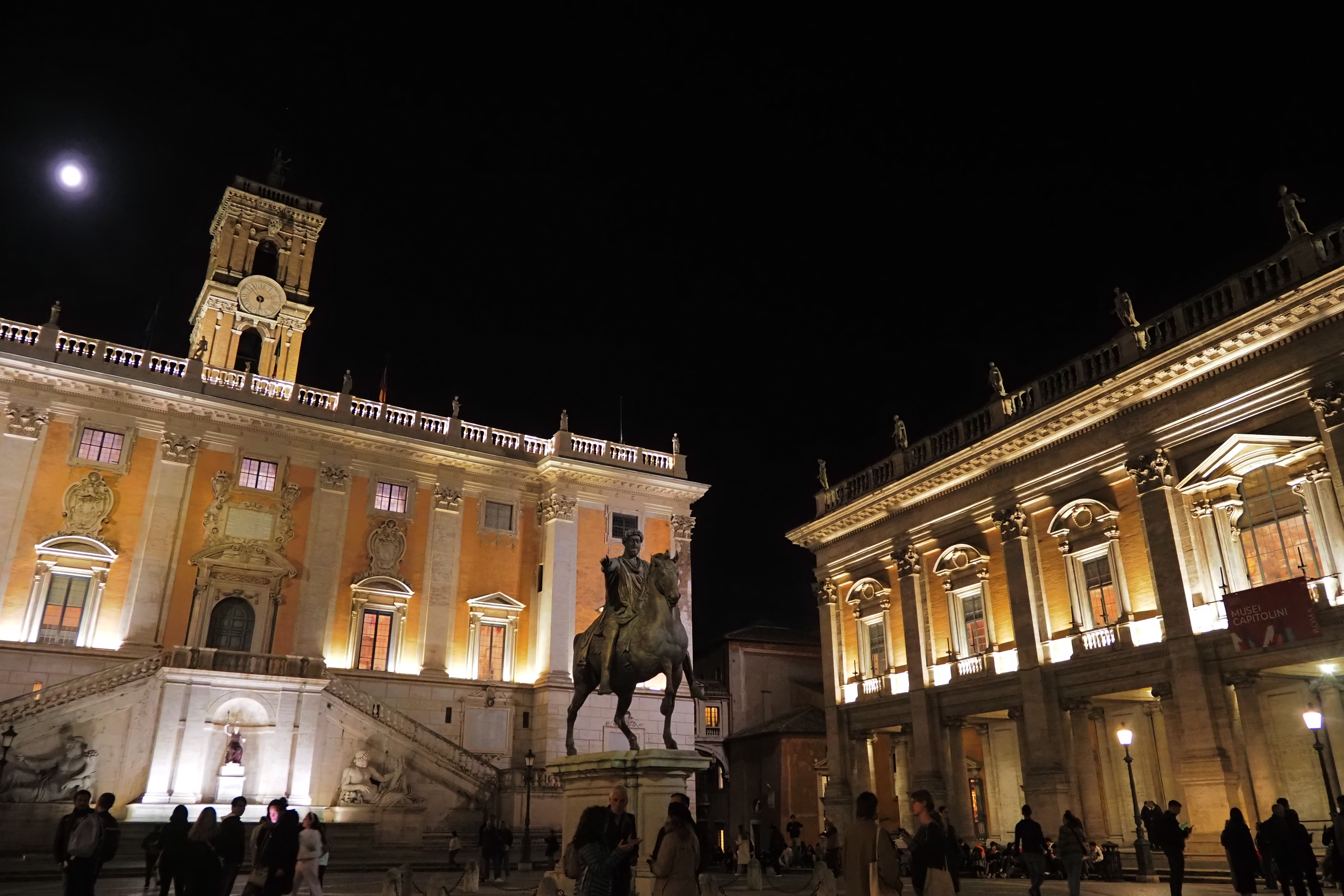 マルクス・アウレリウス像とそれを ローマ市庁舎を含む Palazzo Senatorio; セナトリオ宮や Musei Capitolini; カピトリーノ美術館が取り囲む。