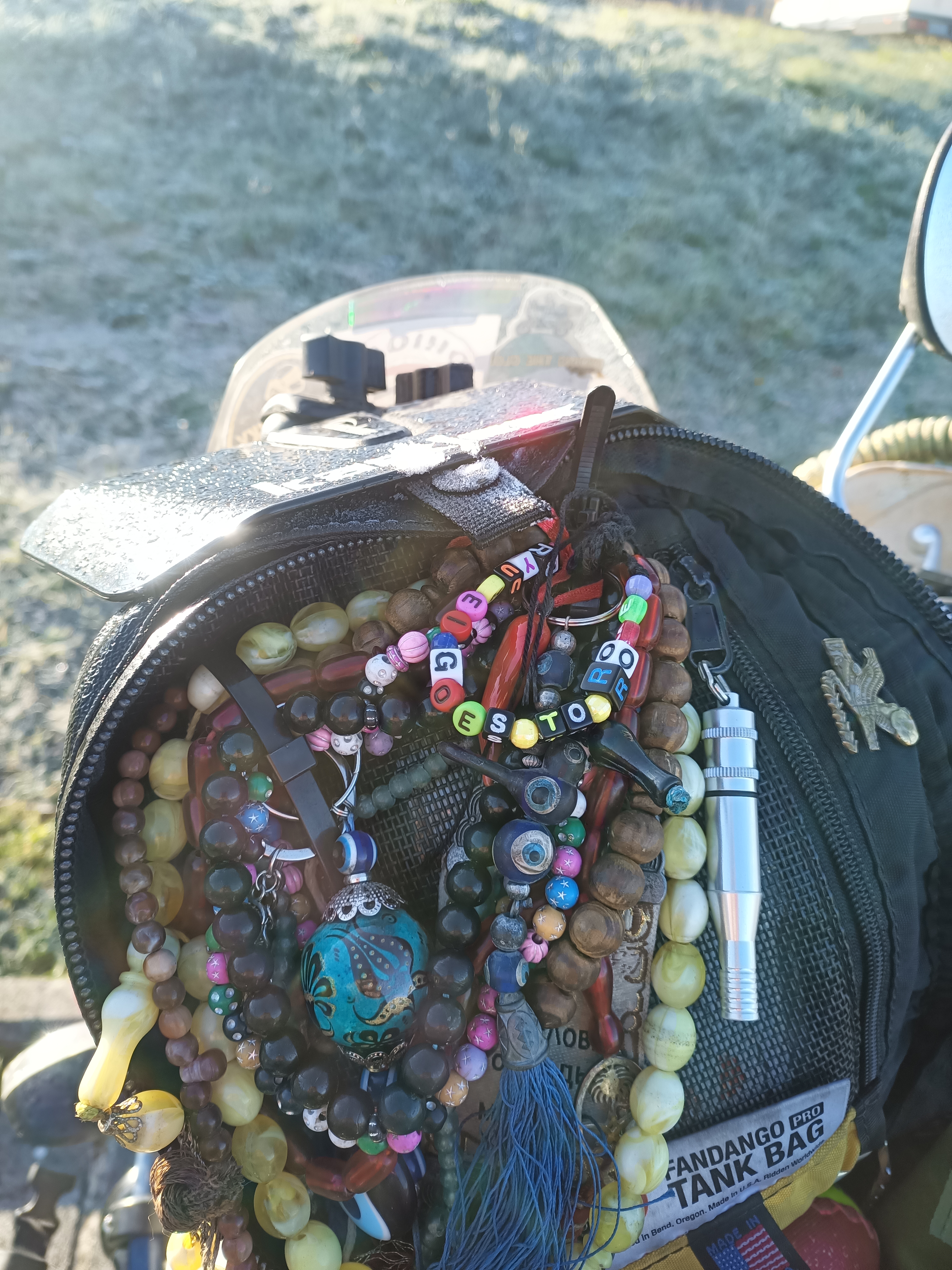Bibi がWIMAのステッカーをスクリーンに貼ってくれて、つくってくれたミサンガはタンクバッグへ。
