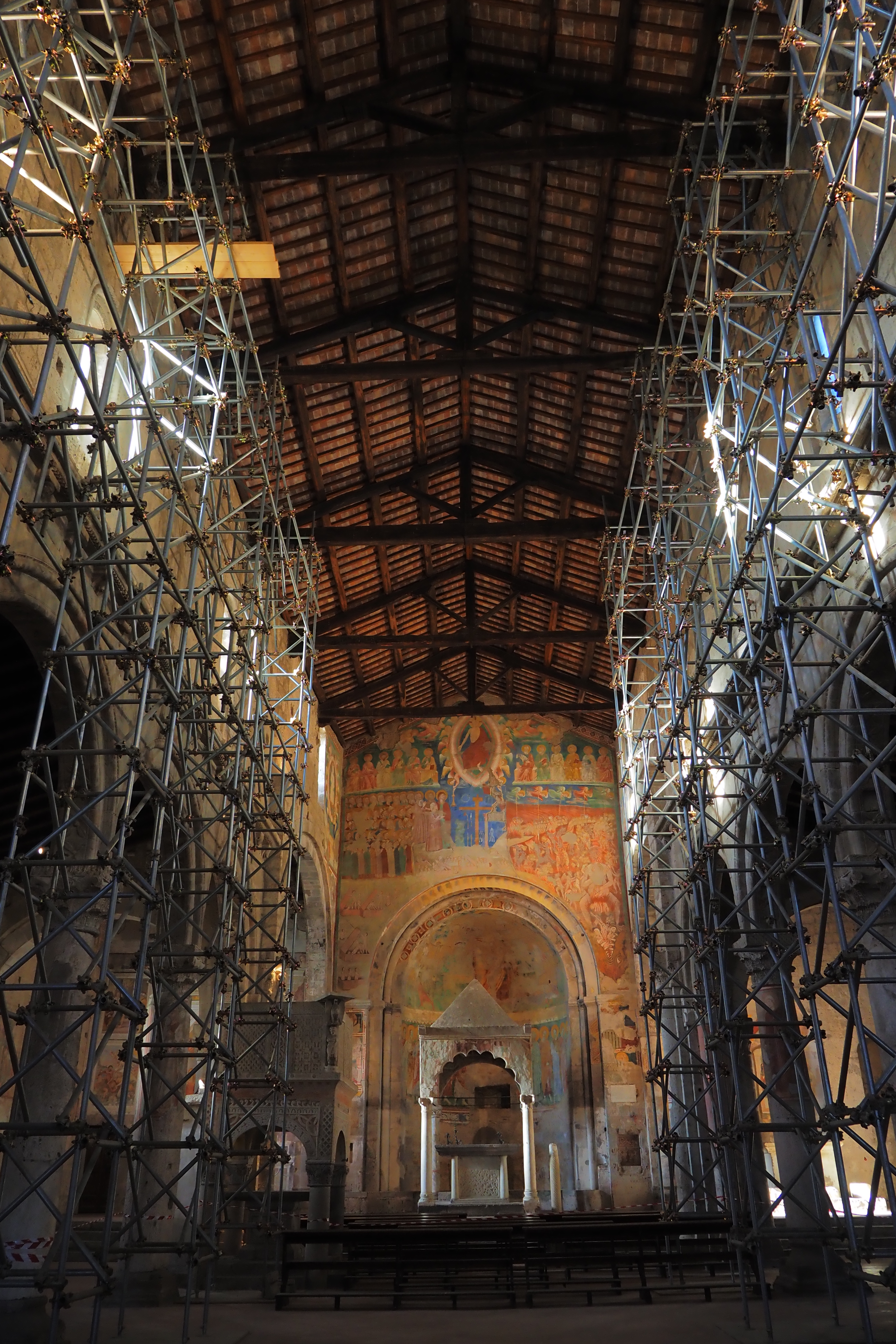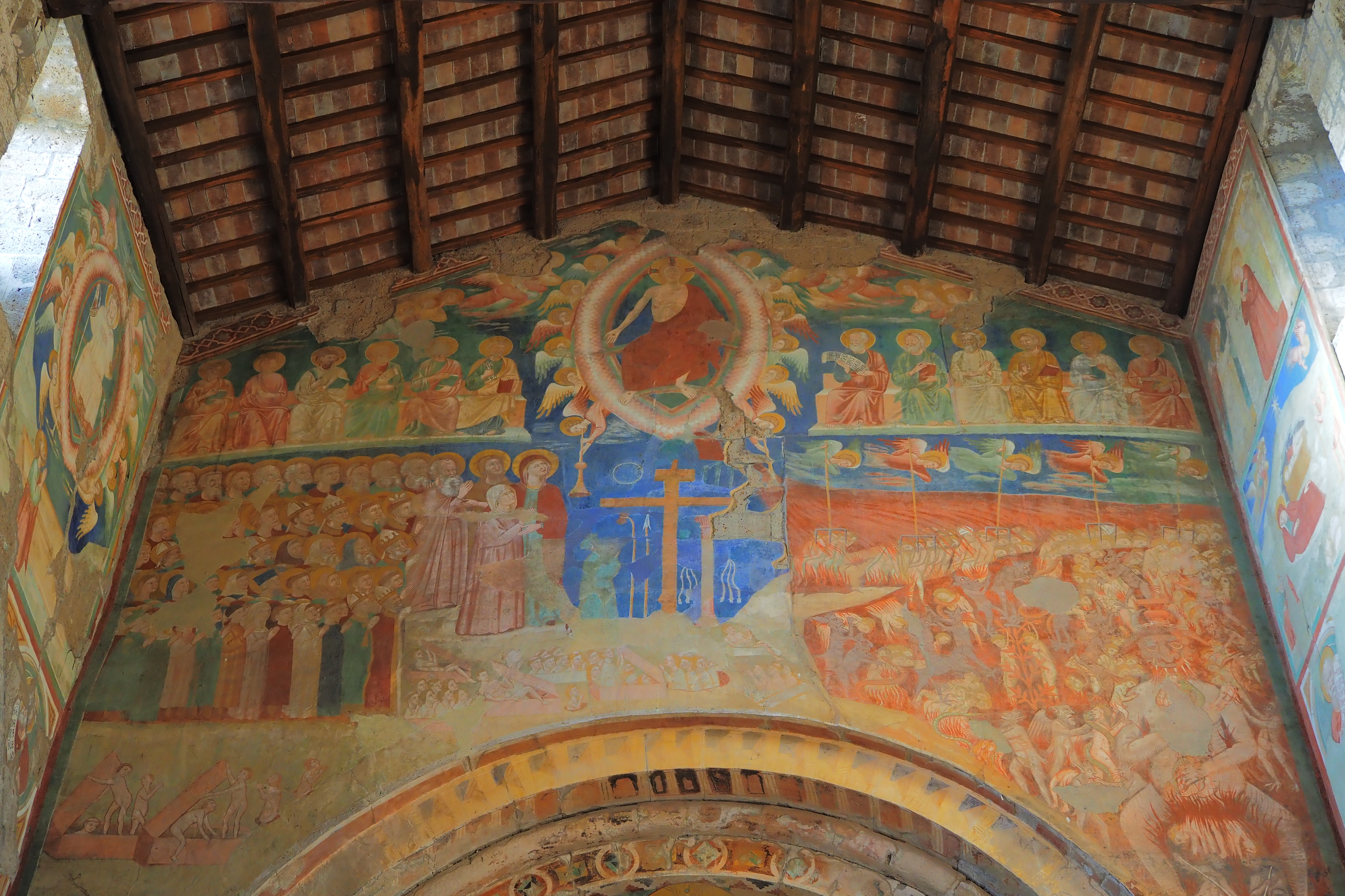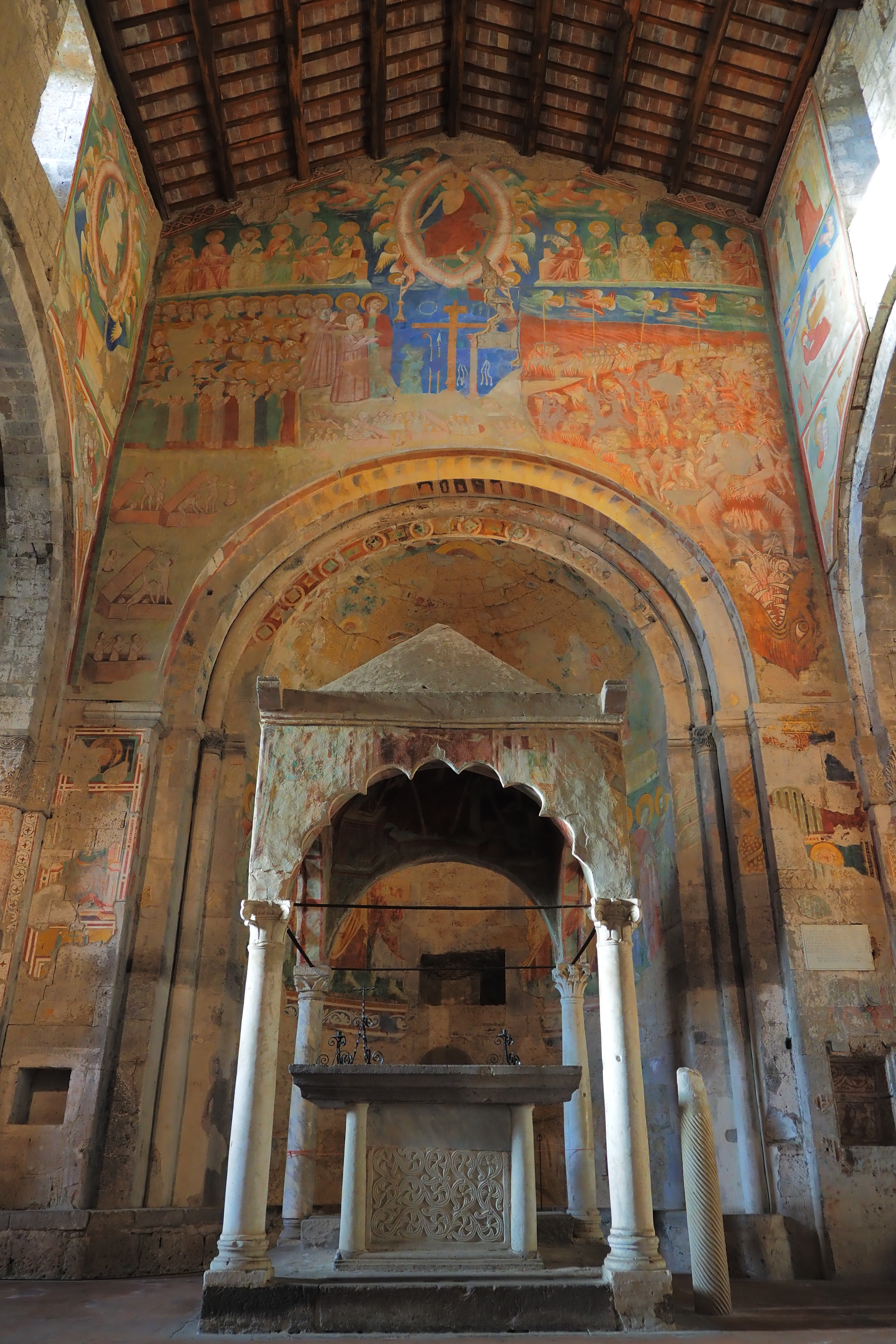 主祭壇部分、キボリウムと後陣のフレスコ画。Donato d’Arezzo作の「最後の審判」で、画角右下には恐ろしい地獄の様子が描かれている。