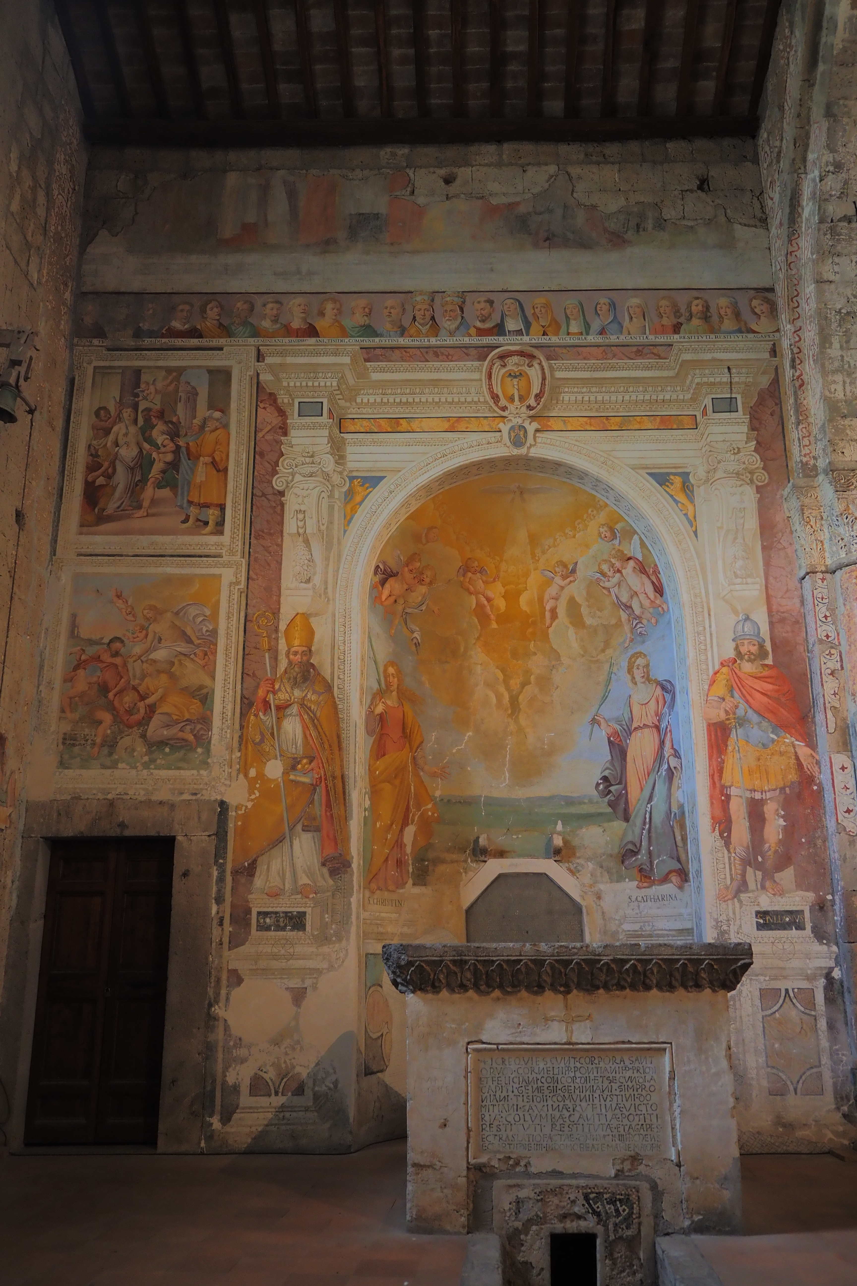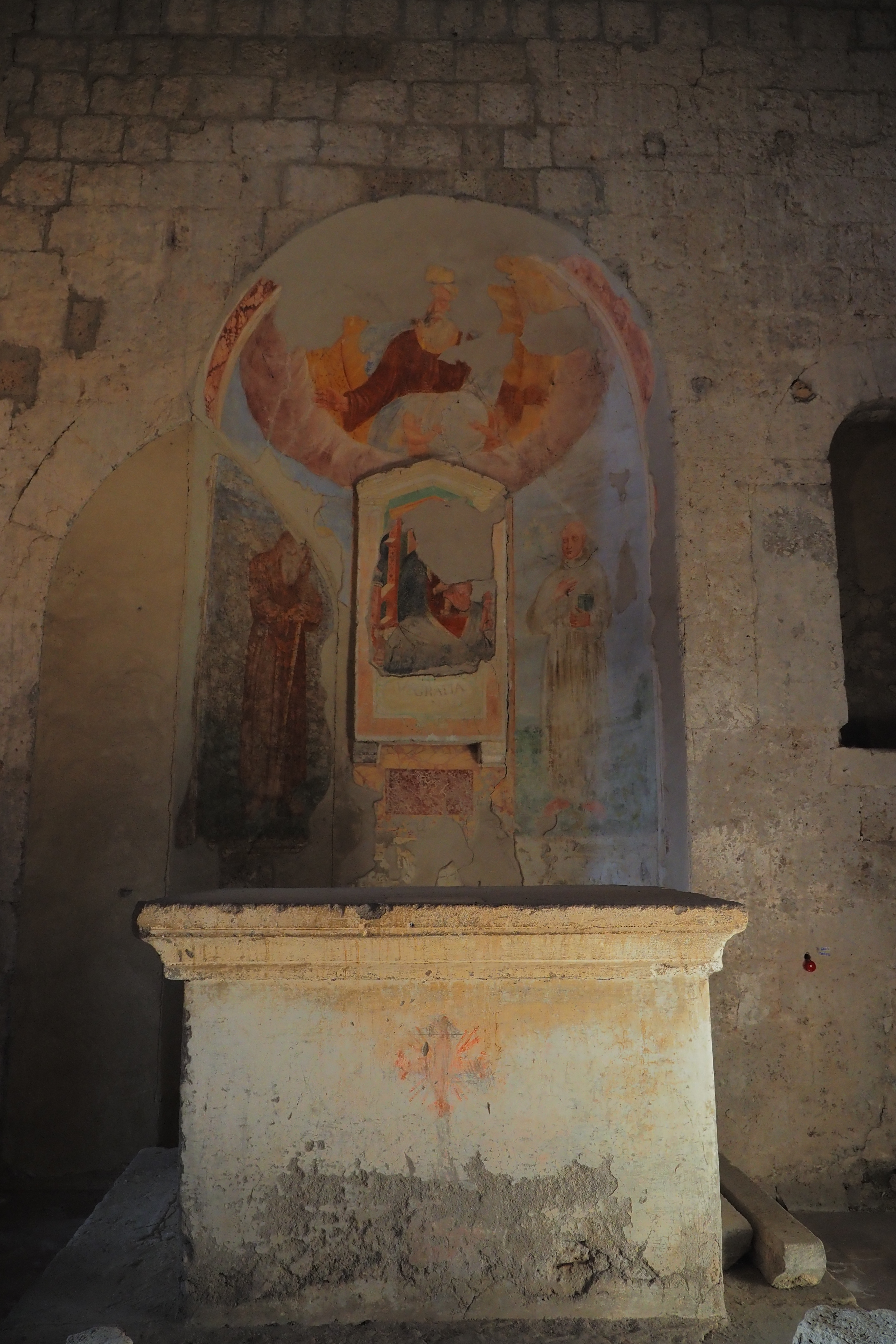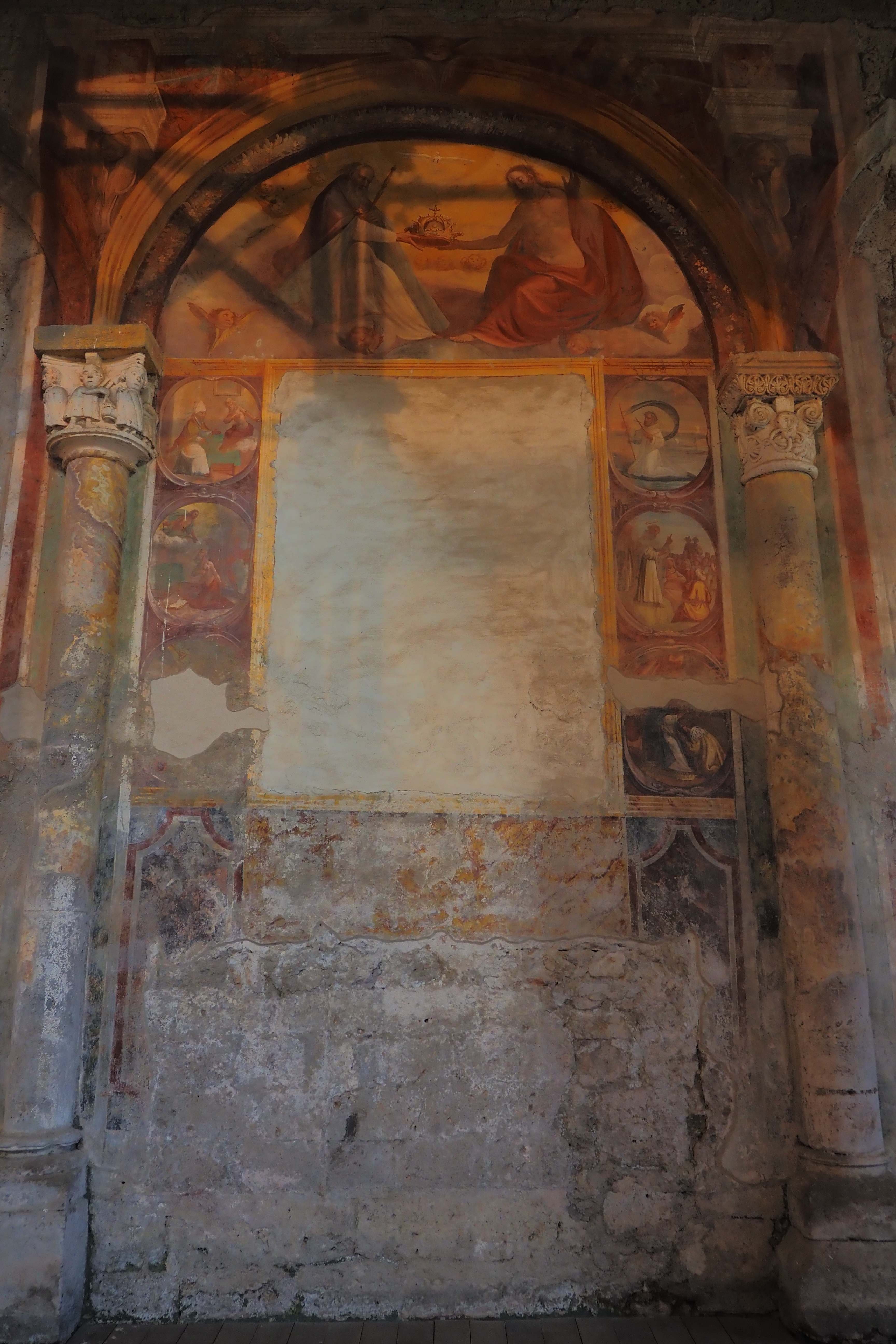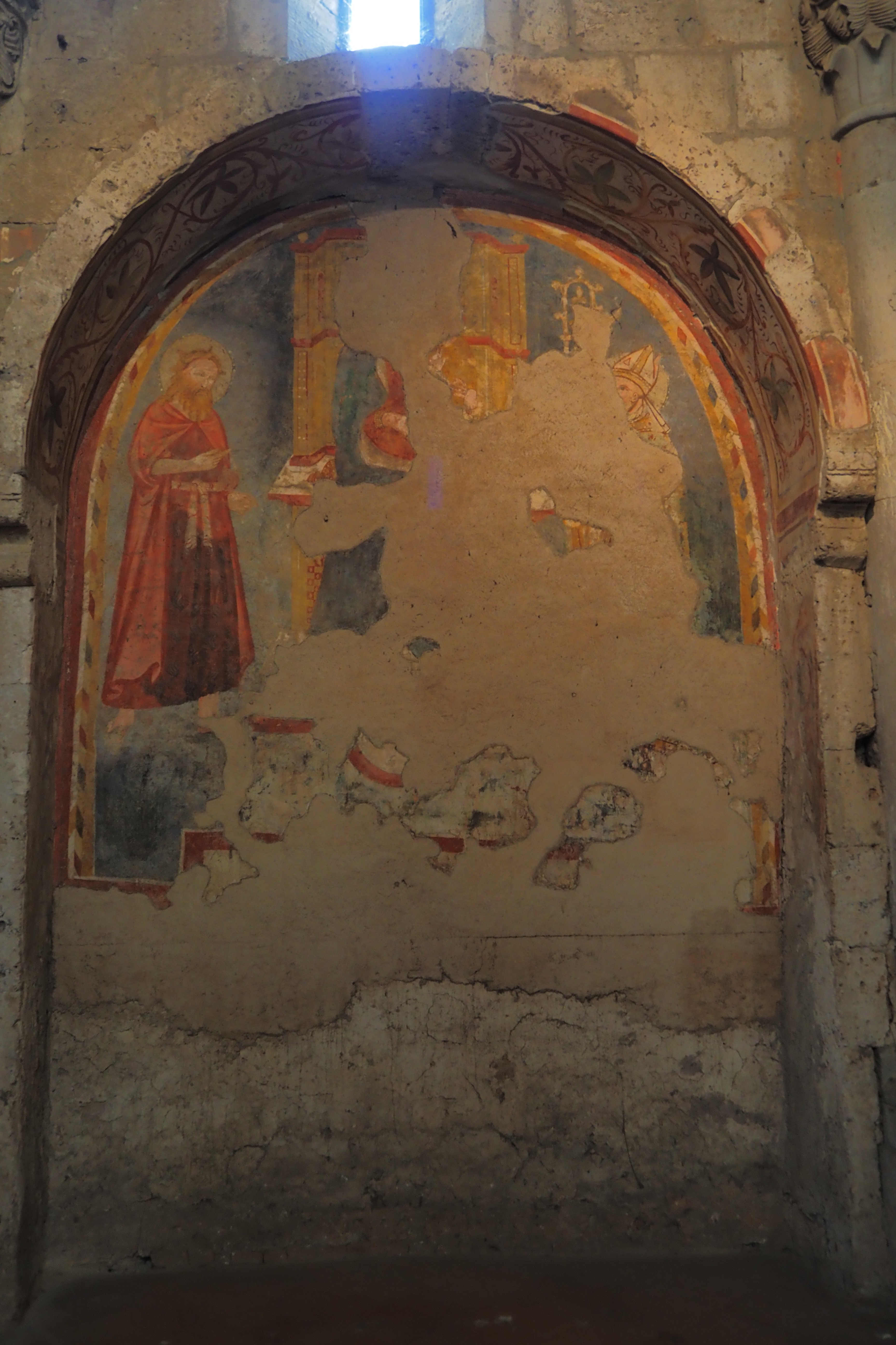 この教会のみどころは、内壁のいたるところに現存する 13~15世紀頃に描かれたフレスコ画だ。