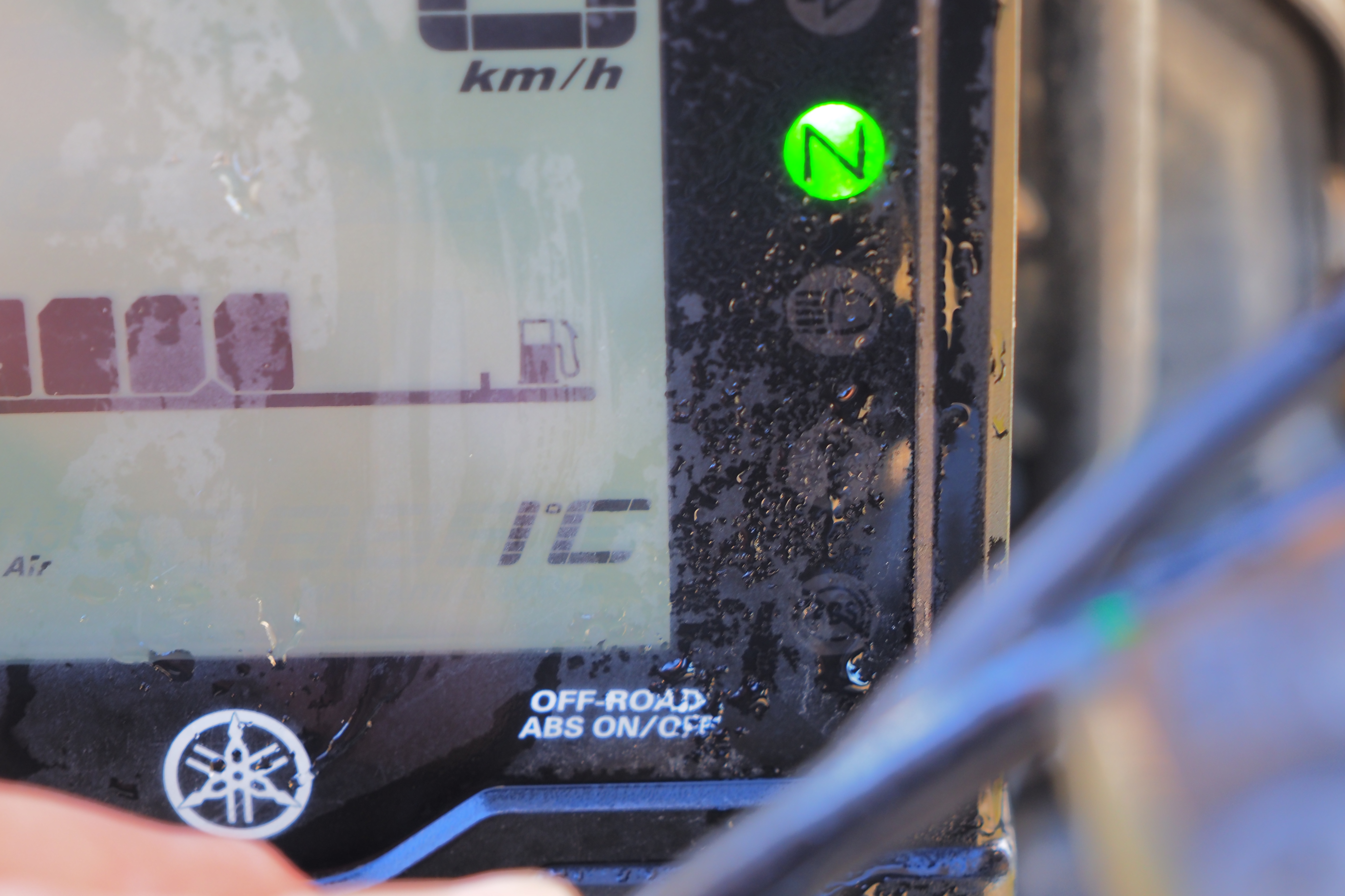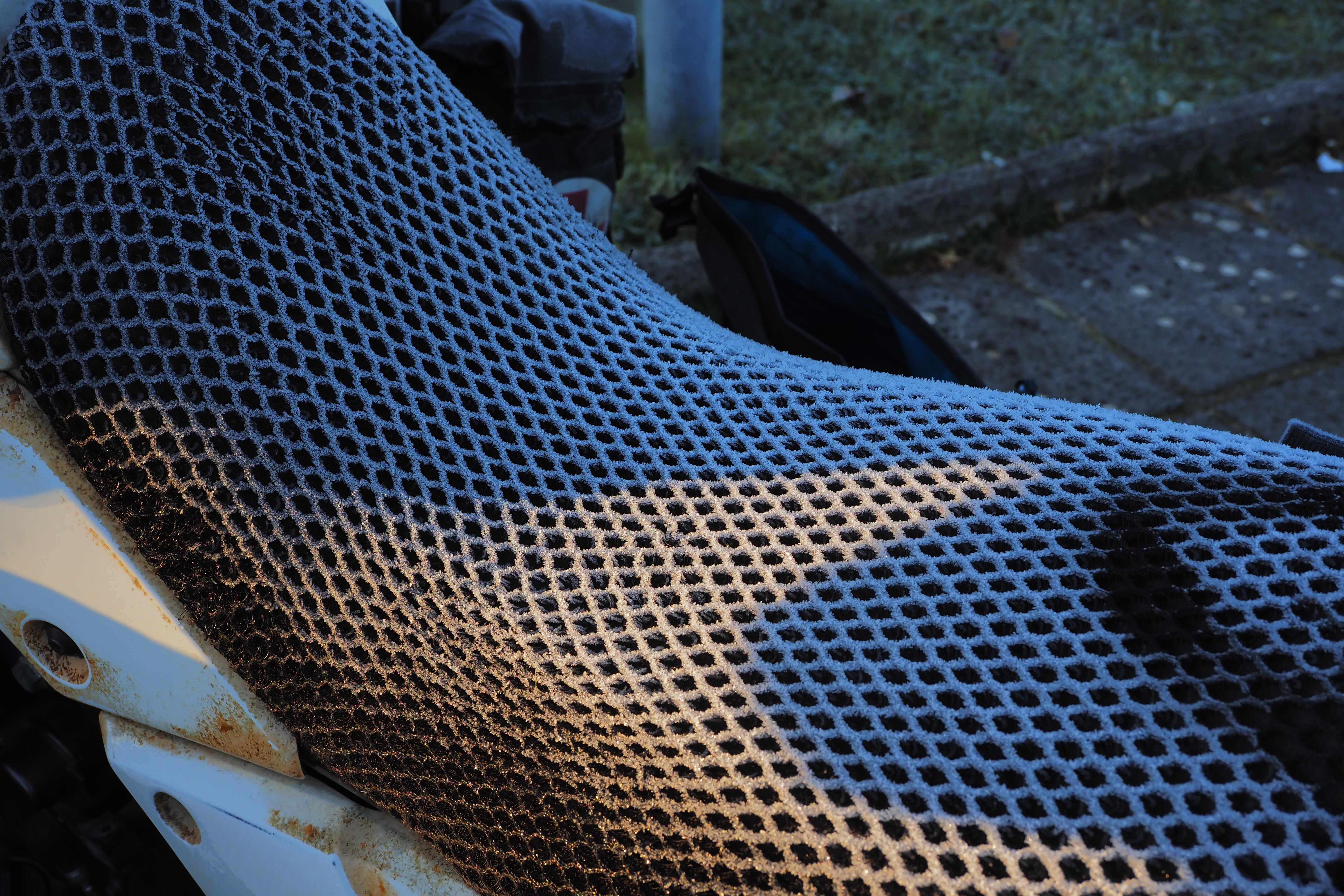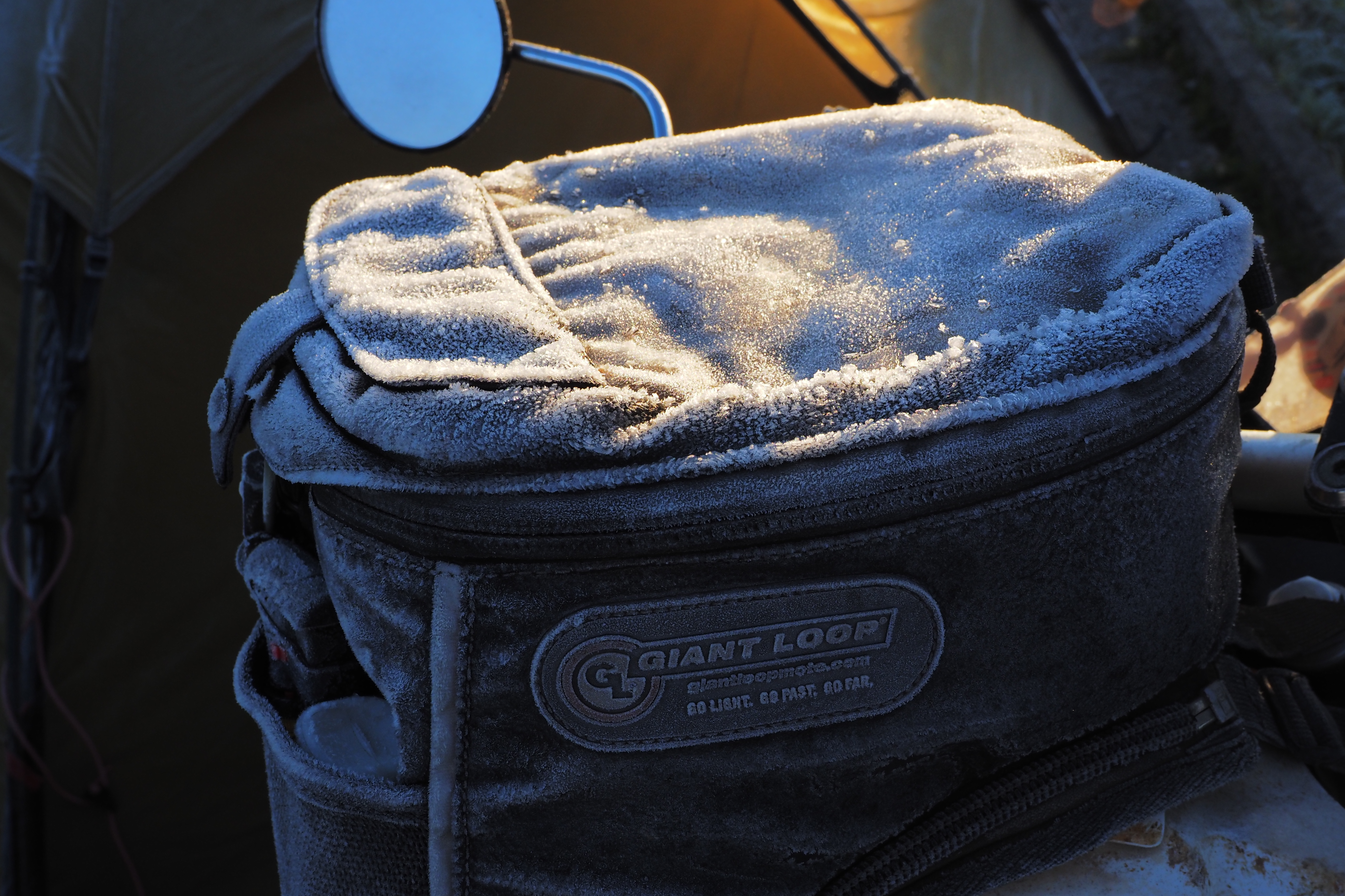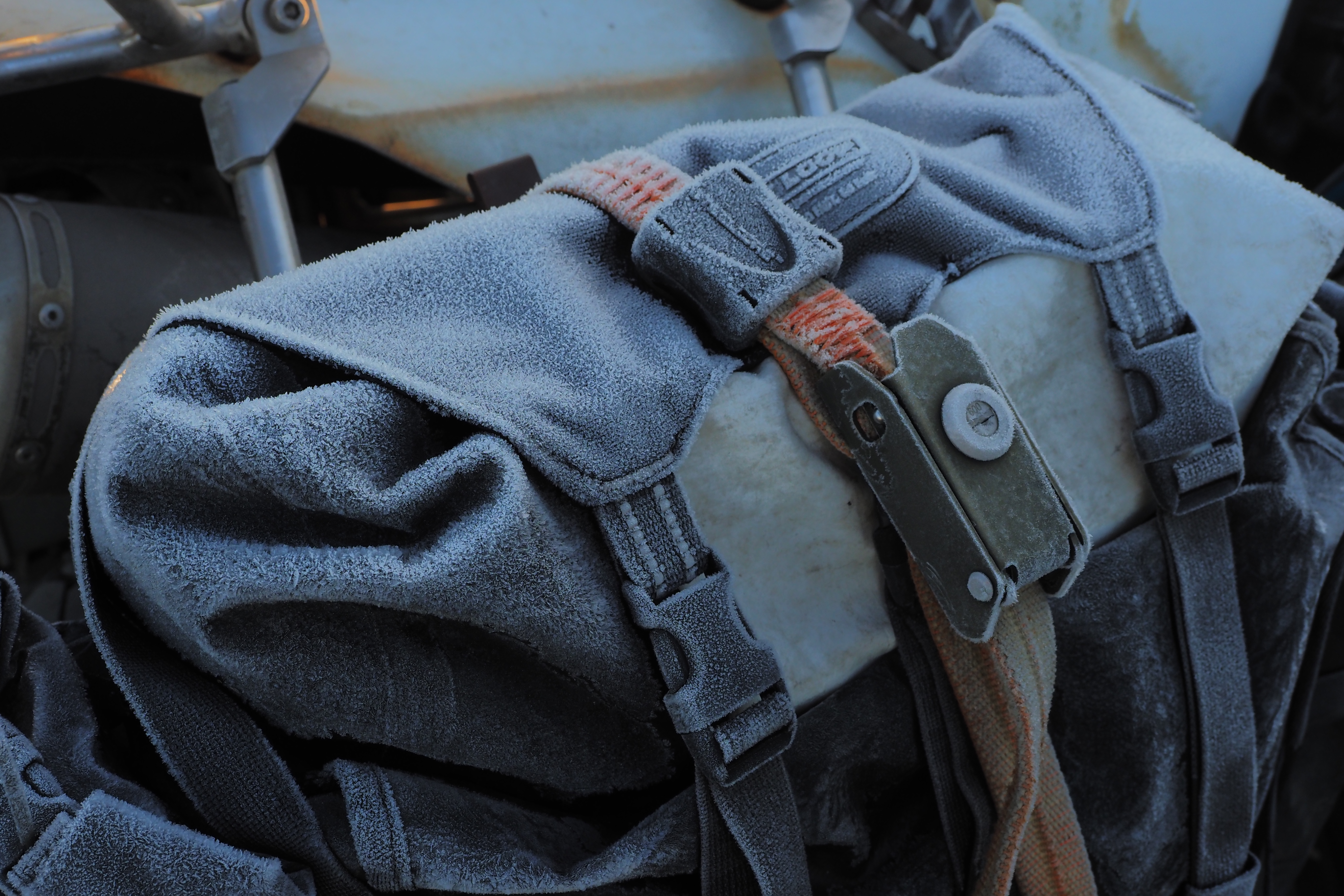 パニアもタンクバッグも 全部凍り付いてる。